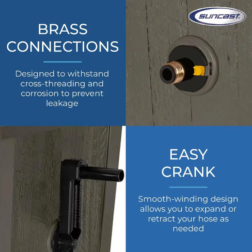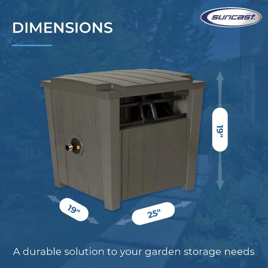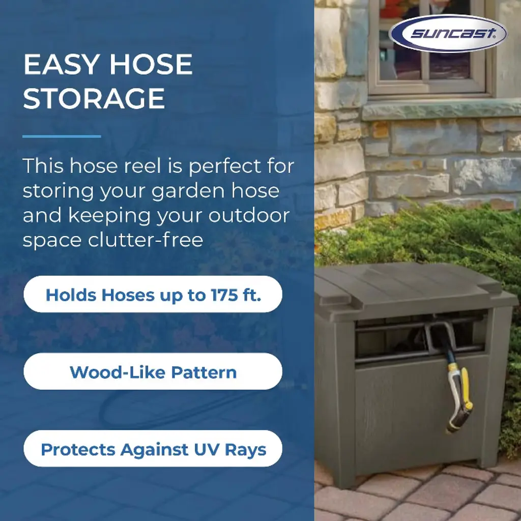 Keep your garden hose neatly stored out of sight yet conveniently accessible with the Farmington Hideaway Storage Pot Container from Suncast. This pot can hold up to 175 feet of a standard 0.63-inch vinyl hose, while the attractive wood-like pattern design gives a farmhouse twist to your outdoor setting, entirely concealing your hose, protecting it from UV rays, and extending the life span. Featuring a Slid Trak hose guide, this provides manual tracking assistance for even rewinding onto the real to maximize capacity. With Smart Tube cross-threading, you can be sure that this pot will not leak onto your backyard patio settings. Constructed of high-quality materials that resist harsh weather conditions, this durable hose storage pot is easy to maintain and built to last. Make watering your plants a breeze and add a touch of style to your outdoor space with the Farmington Hideaway Garden Hose Storage Pot Container from Suncast, making this an ideal addition for all garden enthusiasts.