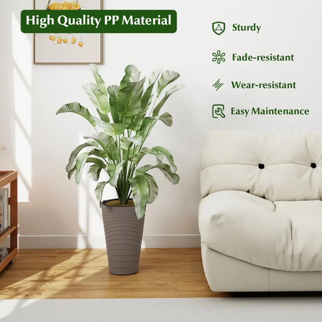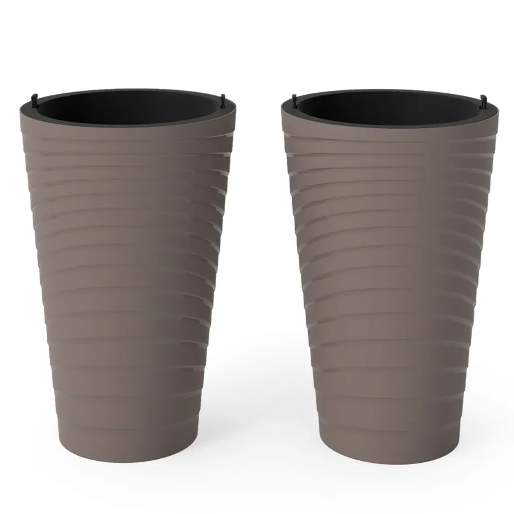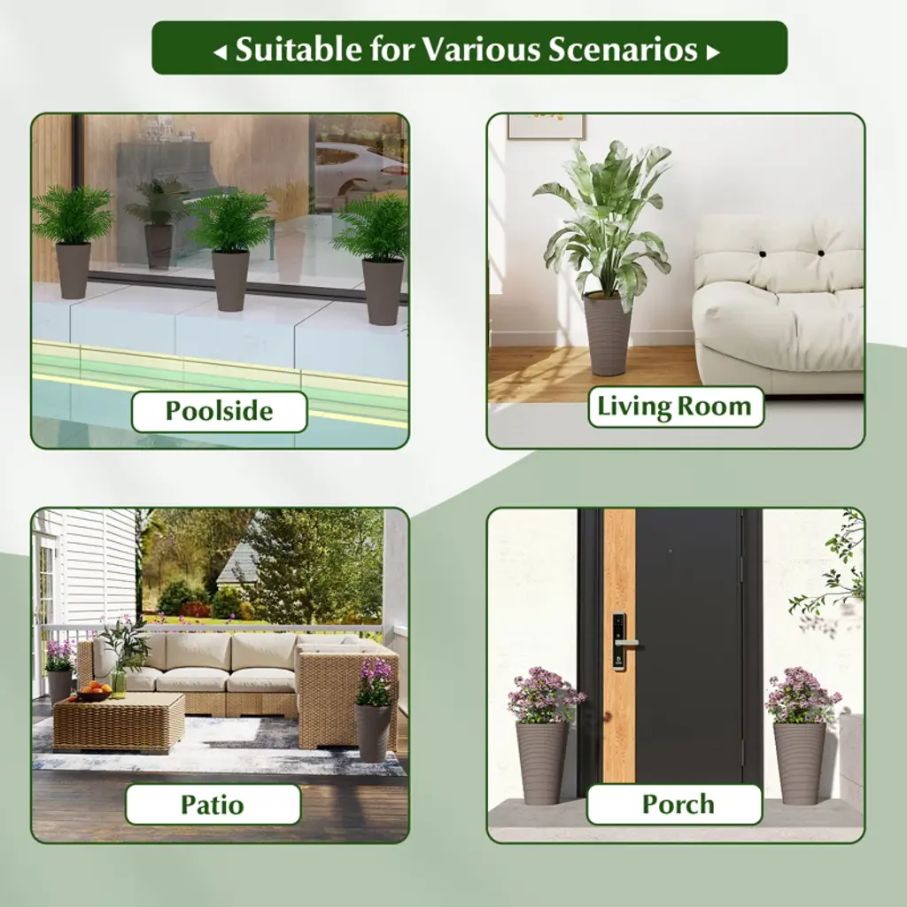 This 18" tall round spiral textured flower pot is both functional and versatile. Crafted from high-quality PP material, it is sturdy, fade-resistant, and wear-resistant, ensuring durability for daily use. The pot features an excellent drainage system with 3 large and 48 small drainage holes, plus a filter plug that allows you to drill a drainage hole as needed, effectively preventing root rot and promoting healthy plant growth. Besides, the detachable inner bucket, equipped with 2 convenient handles, can be easily removed for cleaning or soil replacement, enhancing the pot's usability. Hence, this 2-piece outdoor planter set can add natural beauty to poolside, living room, patio, or porch.Features3 large and 48 small drainage holes promoting healthy plant growth Comes with 2 handles for easy cleaning and soil replacement Made of high-quality PP material, the flowerpot is sturdy, fade-resistantSpecifications:Color: Brown, Gray Material: PP Outer Pot Dimensions :11.5" x 18" (Dia x H) Inner Bucket Dimensions: 11.5" x 9" (Dia x H) Net Weight: 5.5lbs Package Includes: 2 x Flower Pot 1 x User Guide