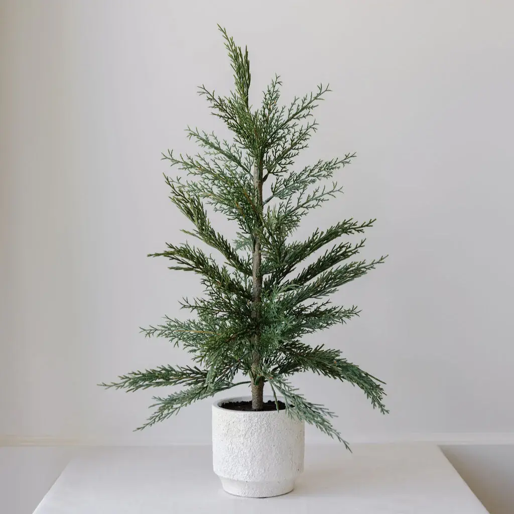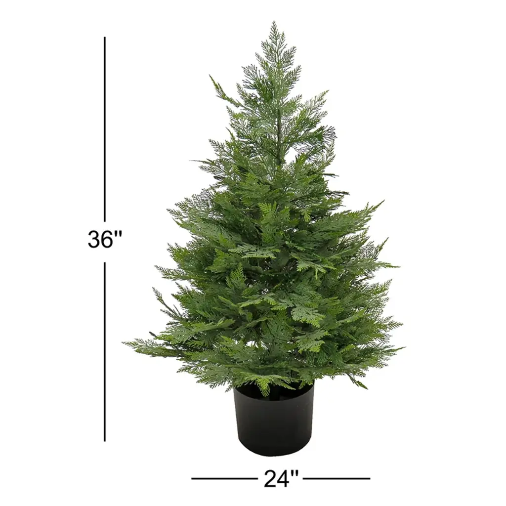 Add a hint of greenery to your front porch or sunroom with this artificial cypress tree in a pot. Featuring thick groups of lifelike PE branches, it's firmly seated in a sturdy plastic nursery pot painted in a matte black hue. It measures 3' tall and 2' wide, making it a great accent in any open corner or right in your entryway. Coming in a lush green tone, this faux plant is lush and eye-catching without the need for watering, sunlight, or extra upkeep.