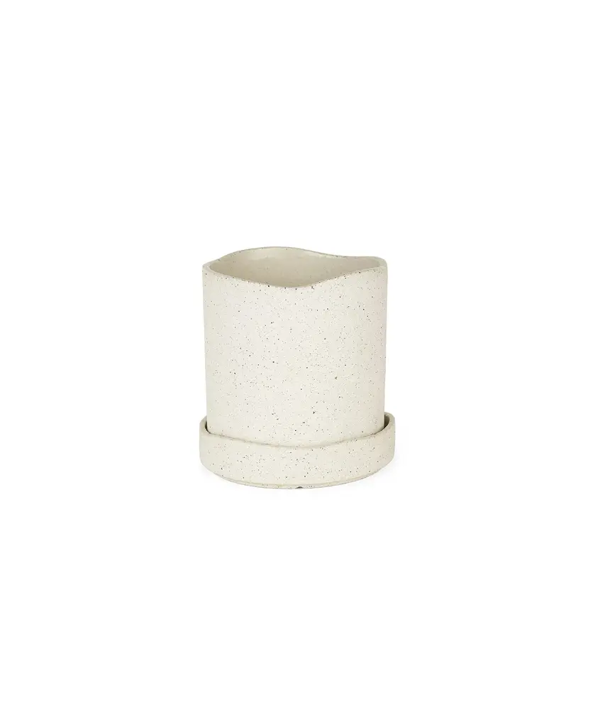 Featuring an unglazed, rough outer surface and an artfully uneven edge, the Uneru Pot and matching saucer will provide any space with a warm, tactile expression. Made from 30-40% recycled clay, the inside of the pot has been glazed, making it the ideal home for your favorite plants.Designed and produced by the Copenhagen-based studio Ferm Living.