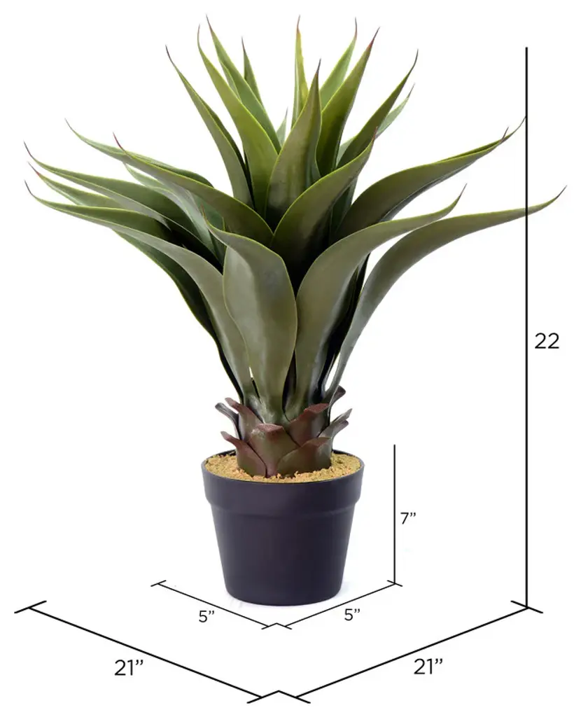Vickerman 22" Artificial Green Potted Aloe Vera. This green aloe vera plant comes in a plain black pot that can blend in with any style or placed into a decorative container of your choice. Pot is 7"H x 5"W