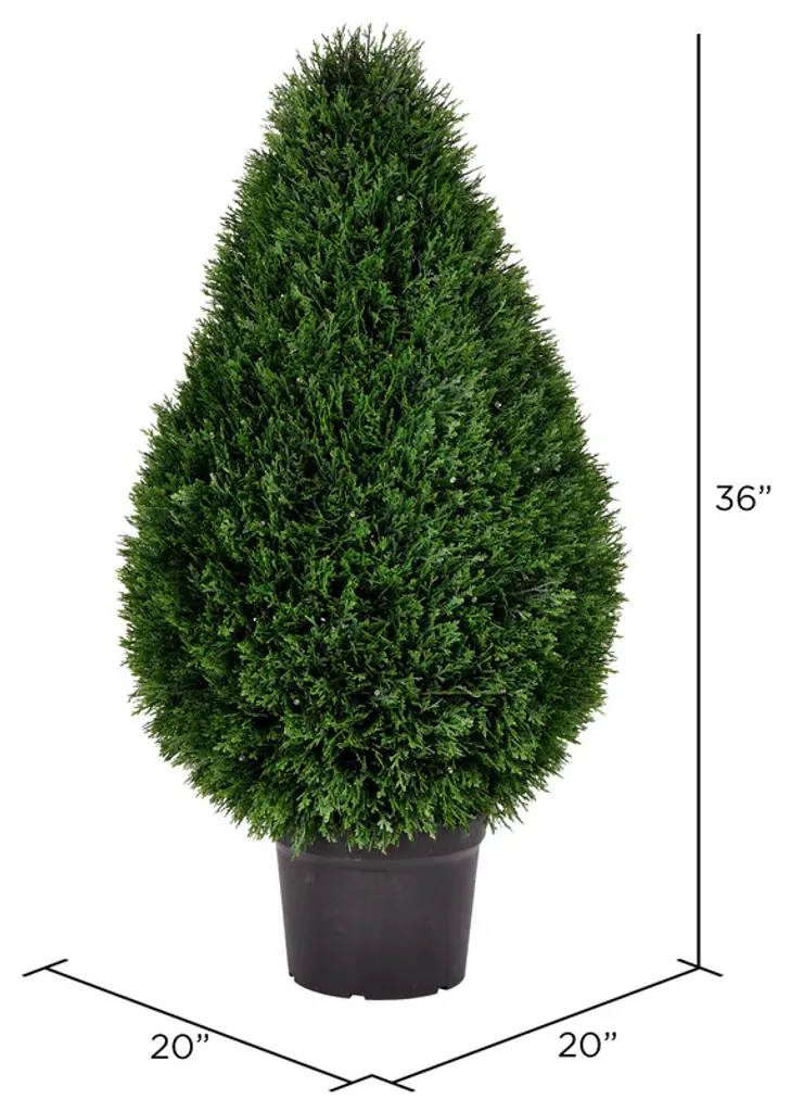 Vickerman 36" High x 20" Artificial Wide Cedar Teardrop Shaped Bush is UV Resistant, Comes In A Black Plastic Insertable Pot, Making This Plant Easy To Place In The Decorative Container Of Your Choice. Pot measures 7.5" high x 9.5" in Diameter