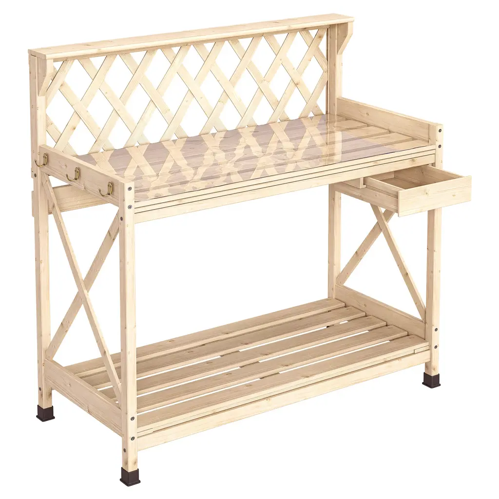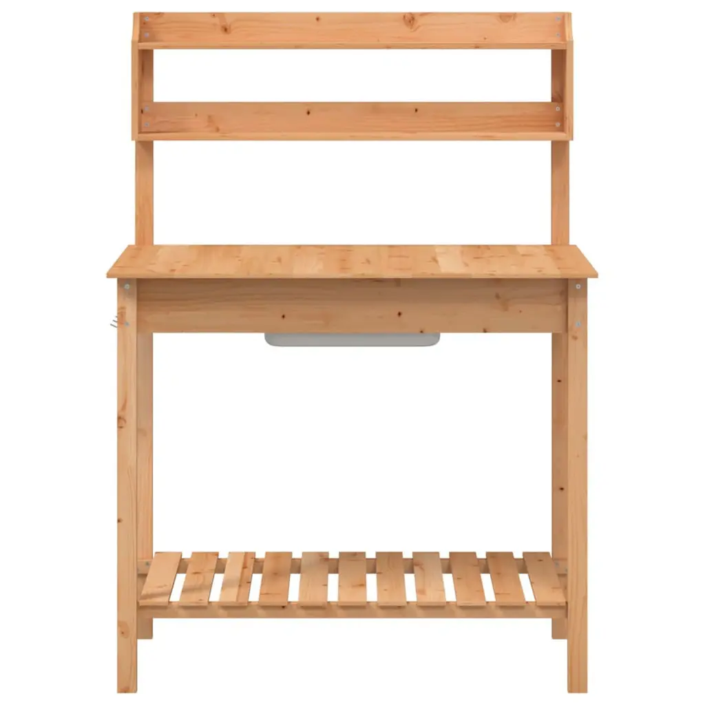 This potting table gives you a handy workspace for gardening lovers who want both practicality and a nice look. Made from solid fir wood with a rustic finish, it has an expandable top for all sorts of jobs, from potting plants to more involved gardening tasks. With a sink included for easy watering and cleaning, its natural look fits right in with outdoor areas, making it a great spot for gardening fun. Expandable Work Surface: The adjustable design lets it expand, giving you extra space for bigger jobs or multiple plant setups. Whether you're tending to small herbs or larger pots, this feature offers flexibility.Built-in Sink: Perfect for rinsing tools or watering plants quickly, the sink is a practical extra that makes gardening easier by keeping things organized and accessible.Natural Aesthetic: The smooth rustic finish not only looks good but also highlights the wood's natural texture, making it an attractive centerpiece in your garden or patio.Functional Storage: With two shelves and side hooks for tools, this potting table keeps your gardening supplies sorted and makes everything you need easy to grab while you work.Durable Material: Made from solid fir wood, this potting table is built to last and can handle different outdoor conditions, giving you year-round gardening satisfaction.