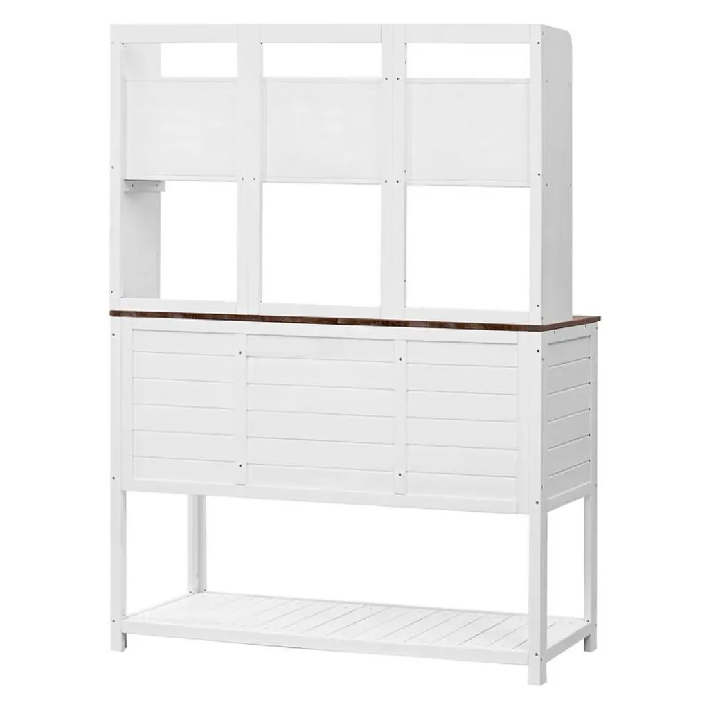 Wooden Potting Bench Table with Adjustable Shelves, Garden Workstation Outdoor Work Table with Hutch and Storage DrawerProduct Features[Durable & Spacious Design] Built from 100% natural fir wood, this potting bench combines durability with a rustic charm, perfect for outdoor use. Its large 50.2x19.7-inch countertop offers ample workspace, while the upper hutch, 3 middle grids, and 2 adjustable cabinets provide versatile storage for tools, pots, and gardening supplies, keeping everything organized and within reach.[Enhanced Functionality & Organization] This garden workstation features 1 drawer for small accessories, 2 bottom shelves, and 3 side hooks for hanging tools or gloves. The adjustable shelves in the cabinets allow customization to fit your needs, making it an efficient and practical solution for all your gardening tasks.[Stylish & Customizable Options] Available in 3 elegant colors (Natural,Brown,White), this potting bench seamlessly blends with any backyard decor. The included assembly video ensures a quick and easy setup, so you can start using your new workstation right away, whether for potting plants or organizing tools.[Ergonomic & Stable Workstation ] Designed with a counter-height surface, this potting bench reduces back strain during long gardening sessions. Its anti-tipping ground nails ensure stability on uneven surfaces, providing a comfortable and secure workspace for all your outdoor projects.[Dimension&Notice] Overall size: 50.2x19.7x66.1inch(LXWXH); Tabletop size:50.2x19.7inch(LXW);Tabletop Weight Capacity: 110lbs; Each Drawer: 22lbs;Each Shelf: 44lbs. For more size, please refer to the size image. Please feel free to contact us if any issues. Notice: The knots in the wood are naturally occurring and cannot be used as a reason for return.Weight&Dimensions&SpecificationsOverall Product Dimension: Overall: 50.2x19.7x66.1inch(LXWXH)Tabletop size:50.2x19.7inch(LXW)Tabletop to Floor: 35.4 inchDrawer Inner Size : 16.2x16.8x6.5 inch(LXWXH)Overall Weight: 66.98lbs.Weight Capacity: Tabletop: 110lbsEach Shelf: 44lbsEach Drawer: 22lbsMaterial: Fir WoodPieces Included: 1 Potting BenchAssembly Required: YesAdditional Tools Required: All Tools Included