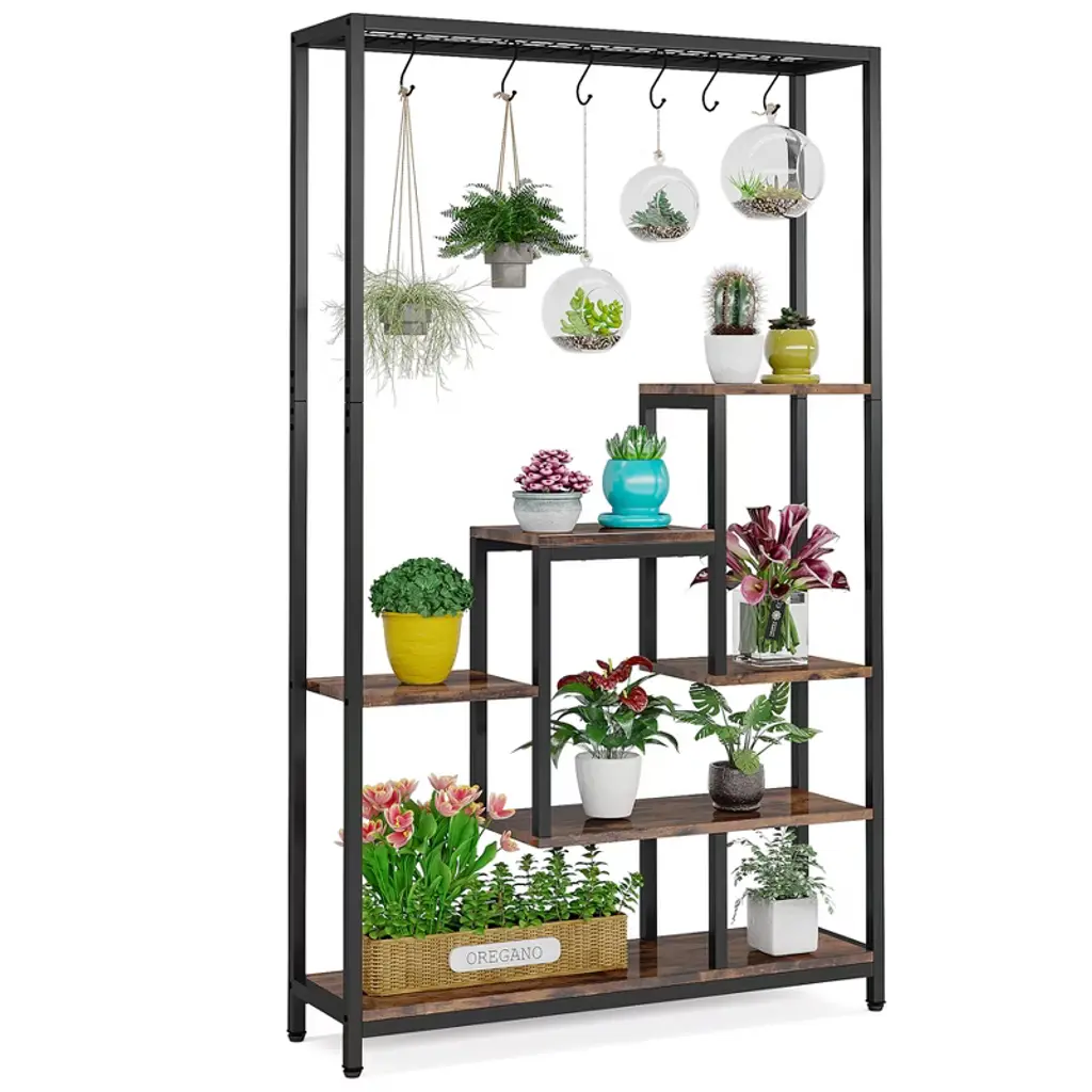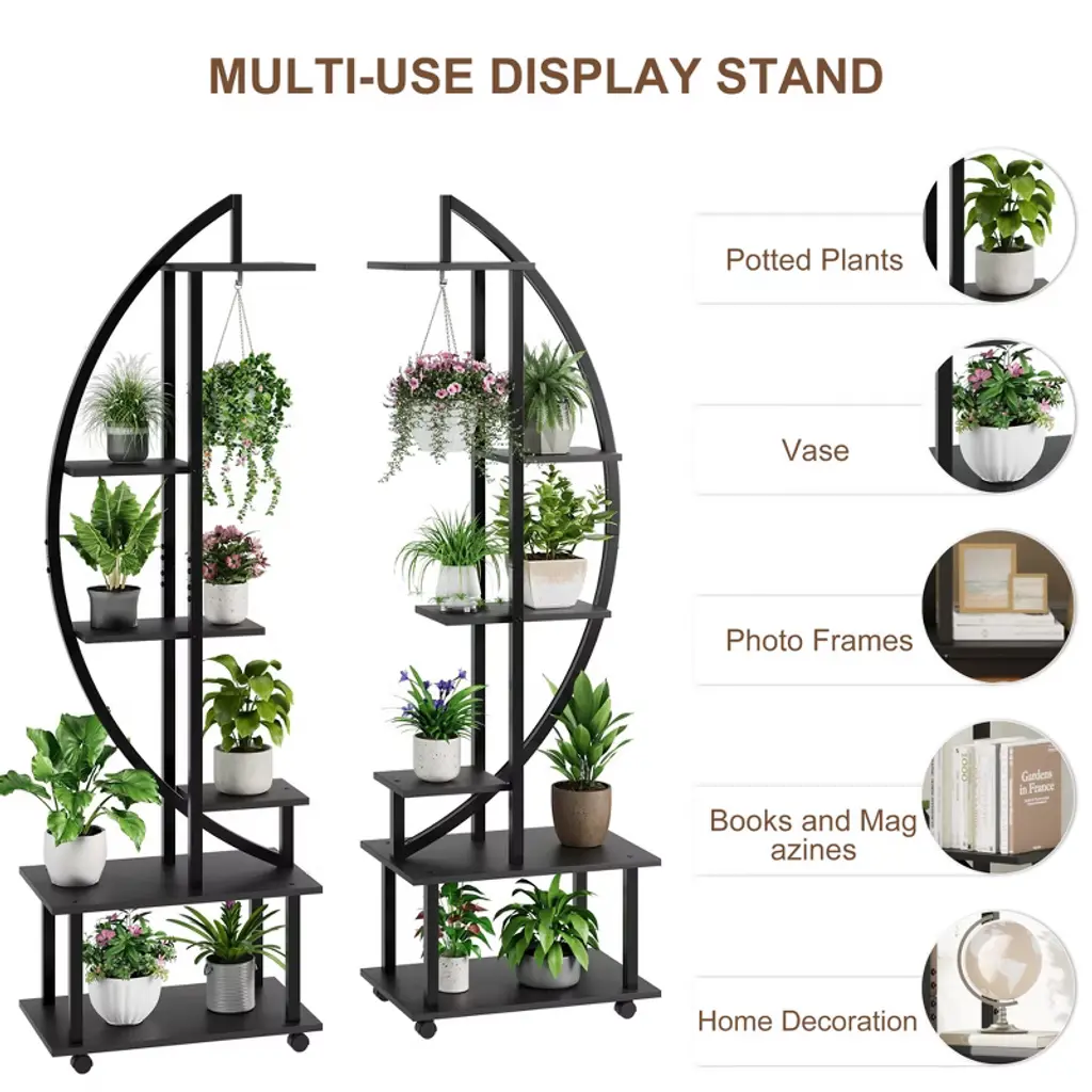 Feature:Enhance your space with this 2 pcs 6 tier metal plant stands, designed in an elegant half-moon shape. The half-moon design of this modern plant rack adds visual appeal, creating a unique and elegant focal point. With two units that can be used separately or combined, it offers flexible placement options to suit various space needs.These tall ladder display racks provide ample room for showcasing your favorite plants, books, and decorative items. Additionally, the hooks provide convenient hanging options for tools or decorations. Each plant shelf features a robust metal frame and thick shelves for exceptional durability, ensuring they can support a variety of items. The included detachable wheels offer effortless mobility, allowing you to reposition the stands with ease. Ideal for homes, gardens, and balconies, these stylish plant stands blend functionality with aesthetic appeal, transforming any area into a lively green oasis. Specification:Size: 22.1x11.8x69.2 inches Color: black / brownMaterial: metal+engineered woodPackage dimension: 39.76x14.57x7.09 inchesPackage weight: 45.97 lbs Note:Please tighten the screws after all the part are placed in their position. Packing list:Half moon shaped plant stand x2Hook x2Hardware bagsAssembly guide x1
