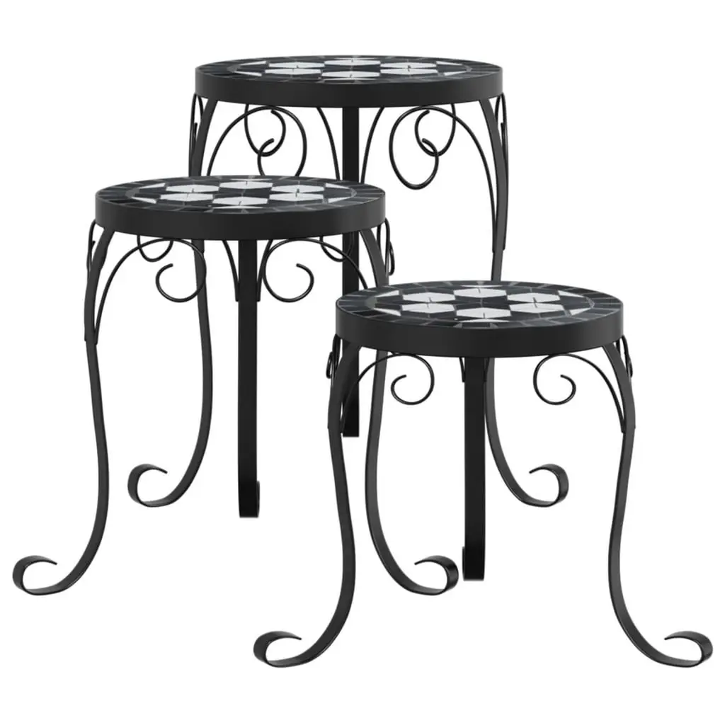 Add traditional glamour to your indoor or outdoor garden with this 3-piece set of square black metal planter stands. The decorative construction features metal vine and flower sculptures with reflective clear acrylic crystal accents. These plant holders are sturdy yet lightweight, made entirely of iron, aside from the acrylic crystals. Each square top has a metal waffle grid to let any water overflow drip through. These stylish nesting garden tables are safe in any weather, so you can display botanicals on the porch, patio, or greenhouse garden. These delightful plantstands can work together as a set or can be displayed as solo decorative pieces all around the garden and patio space. Features sturdy footed legs with circular band braces. Wipe clean with a dry cloth. Suitable for indoor and outdoor use. These stunning plantstands come in a set of 3. Traditional style. This item comes shipped in one carton. Maximum weight limit is 5 lbs. per shelf.