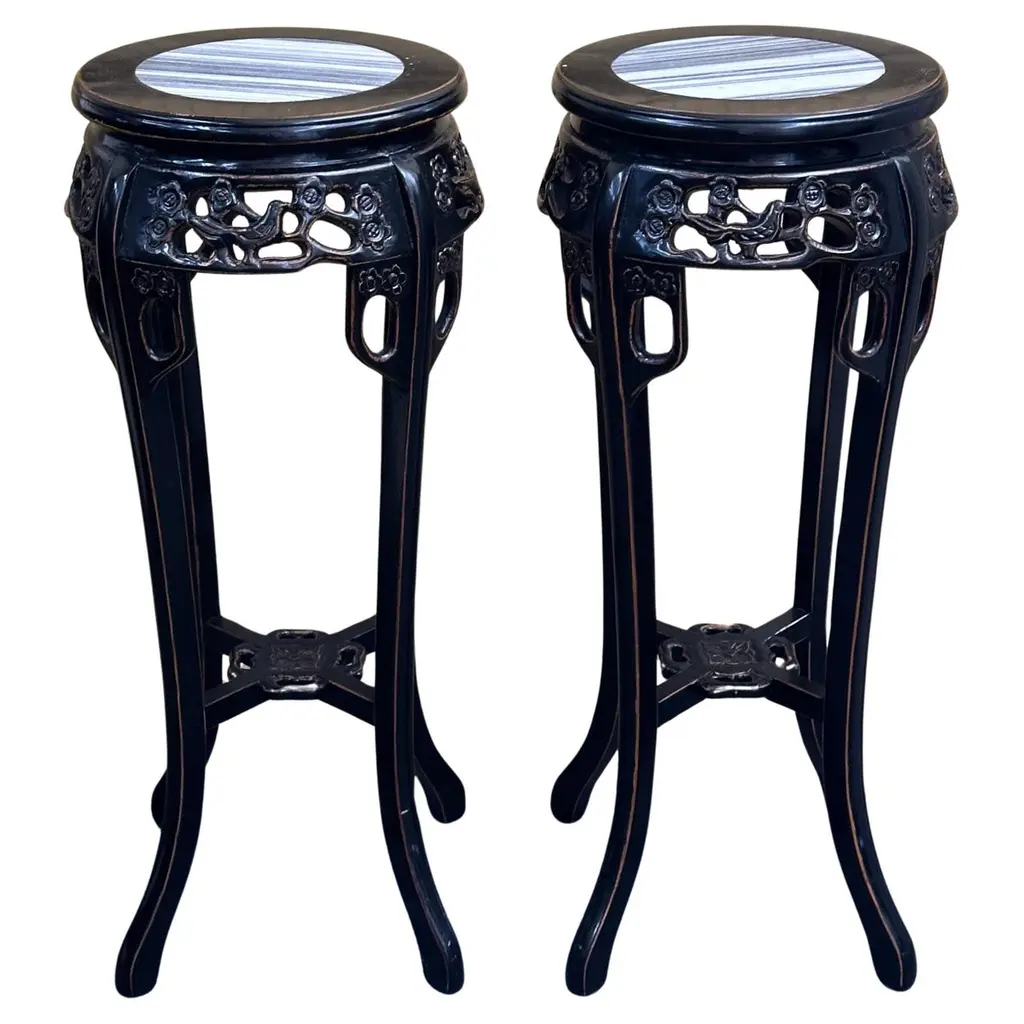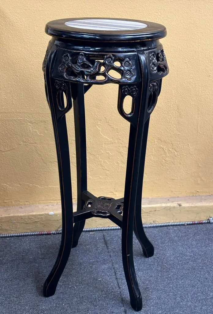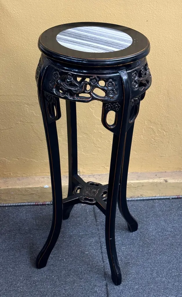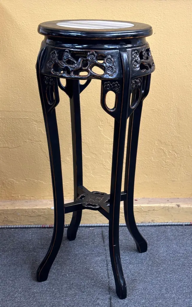 Chinese Carved Hardwood Plant Stand / Pedestal With Marble Top Insert
