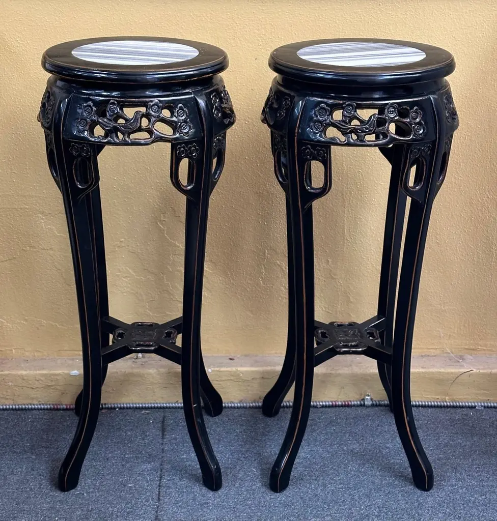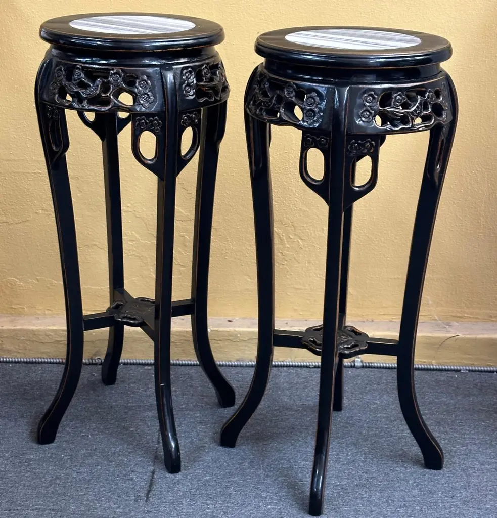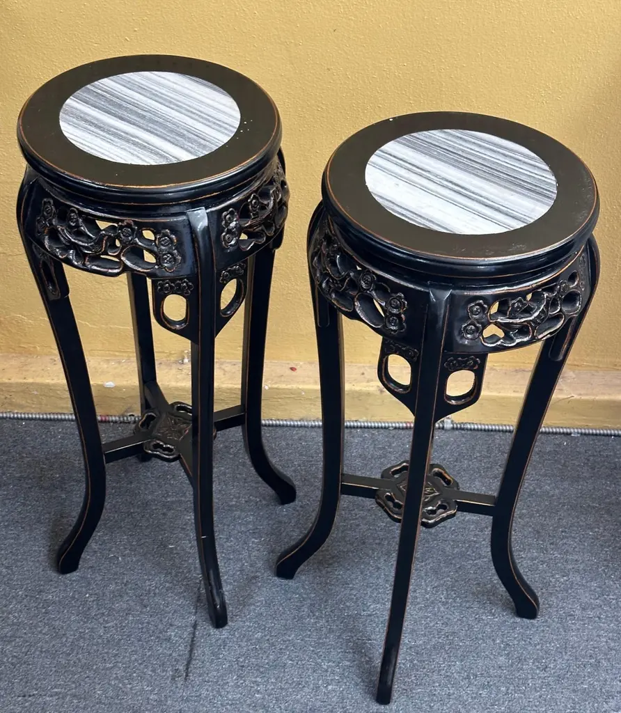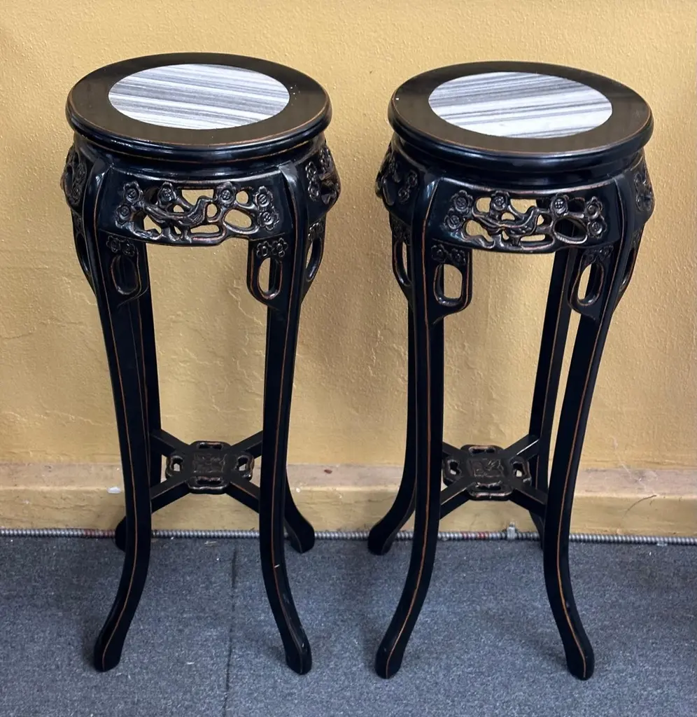 A very nice Chinese carved hardwood plant stand / pedestal with white marble top insert, circa 1980s. There are two stands available, but they are priced separately. The stands are in very good vintage condition and measures 14.25"D x 32"H. The top is 13"D and the marble inset is 8.75"D. Lovely piece! #3801