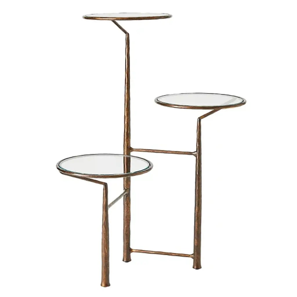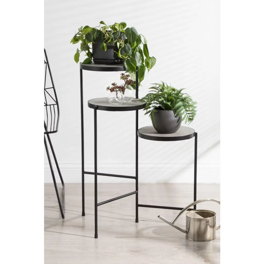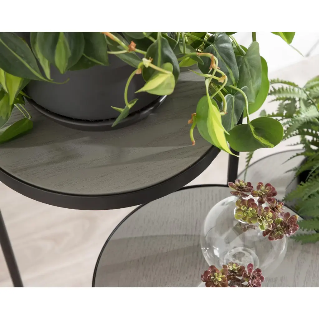 Create the cascading plant display of your dreams with the lovely Fields plant stand collection. This lovely indoor plant display stand features a minimal metal frame with three tabletops crafted from solid wood, creating a resilient yet bold accent piece that is made to last. In addition to including two premium materials, the Fields also features a two-tone finish: a bold, luxurious gold on the frame, and a unique black on each of the wood tabletops. This color combo is perfect for the modern or glamorous home, showcasing a revolutionized style for the 21st century. The overall size of the Fields is 22 inches wide by 17 inches deep by 30 inches tall, but the metal frame is adjustable to create more space in the room. Use the 10-inch diameters of the Fields to showcase plants or other accents, serve drinks on coasters, or act as a catch-all for your daily necessities. This lovely stand is a fantastic accent to add to your living room, bedroom, or entryway, showcasing your personal style while offering a refreshing touch of greenery.
