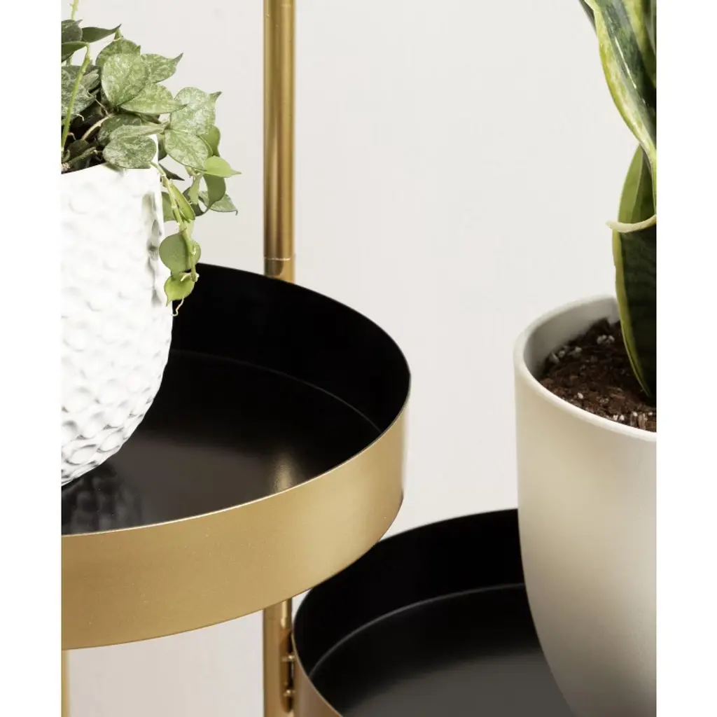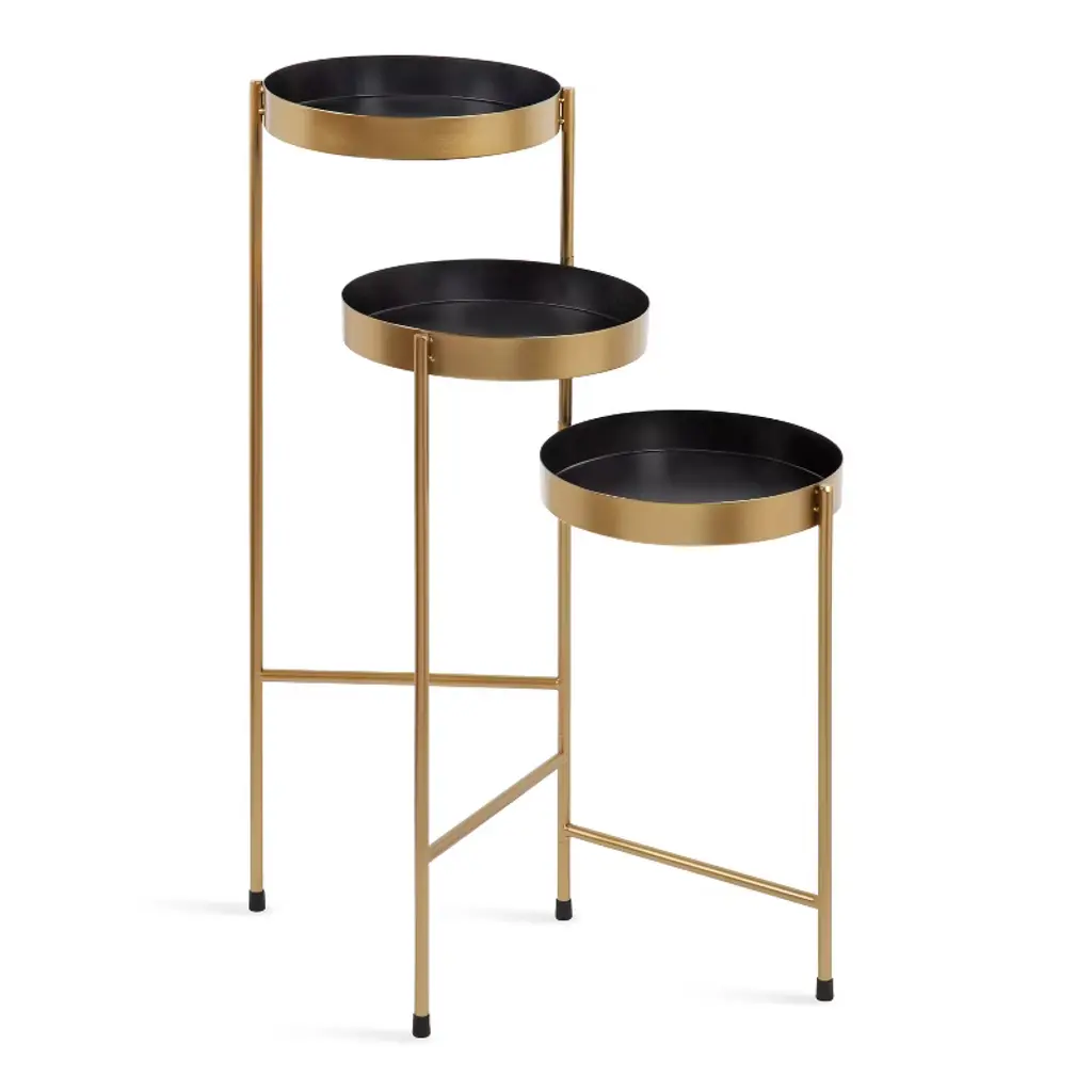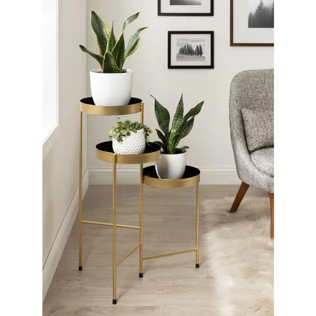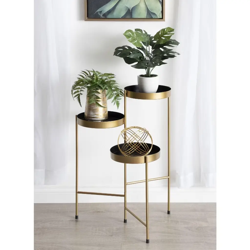 Showcase your plants with the Kate and Laurel Finn Tri-level Plant Stand. Made of a durable metal frame and beautiful round trays, the graceful triple-tiered design creates the perfect combination of function and decoration. It would be wonderfully suitable for any room in your home including your living room, bedroom, office or bathroom. The smart build features three graduated shelves with hinged legs allowing you to arrange to your satisfaction as well as allowing easy storage.