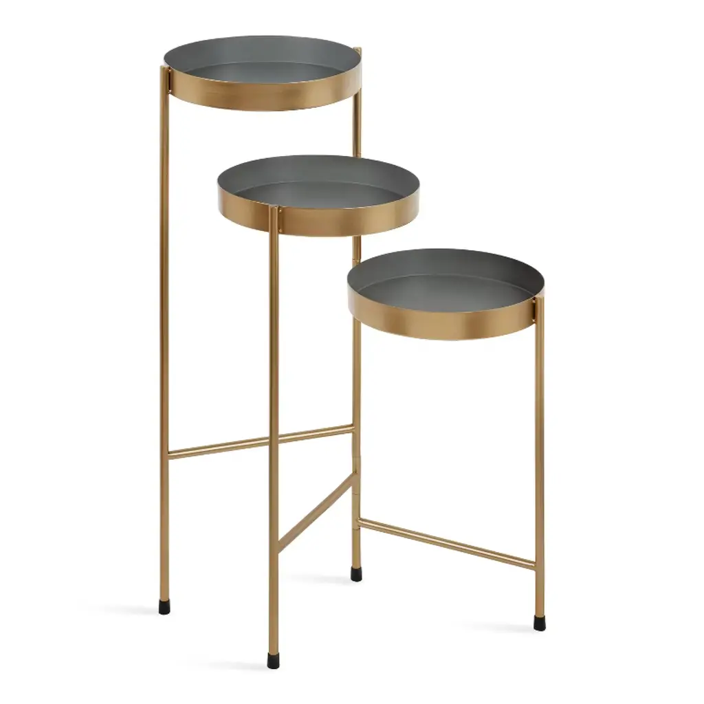 Showcase your plants with the Kate and Laurel Finn Tri-level Plant Stand. Made of a durable metal frame and beautiful round trays, the graceful triple-tiered design creates the perfect combination of function and decoration. It would be wonderfully suitable for any room in your home including your living room, bedroom, office or bathroom. The smart build features three graduated shelves with hinged legs allowing you to arrange to your satisfaction as well as allowing easy storage.