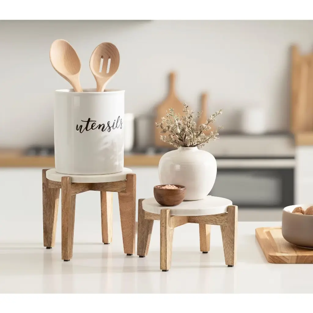 Discover a beautiful way to showcase your decorative house plants and other household items with the charming Icelyn plant stands. The Icelyn plant stands take inspiration from the sophisticated aesthetics of mid-century modern design, featuring two simple yet secure bases and trendy round tabletops. The stand of the Icelyn was crafted from natural solid mango wood, while the tabletop is a premium, authentic white marble stone. Each of the Icelyns was handcrafted in India by talented artisans, giving each piece in this collection a distinct look in terms of finish, wood grain, marble veining, and texture. The Icelyns are excellent plant stands for indoor plants, featuring two distinct sizes: the larger version is 8.25 inches wide by 8.25 inches deep by 6.75 inches tall, while the smaller Icelyn is 8.25 inches wide by 8.25 inches deep by 4.75 inches tall. These varied sizes allow you to layer your decor, with an additional capacity of displaying them together or spread throughout your home. Each of the Icelyn stands features protective footpads on the bottom to protect your hard surfaces from damage.