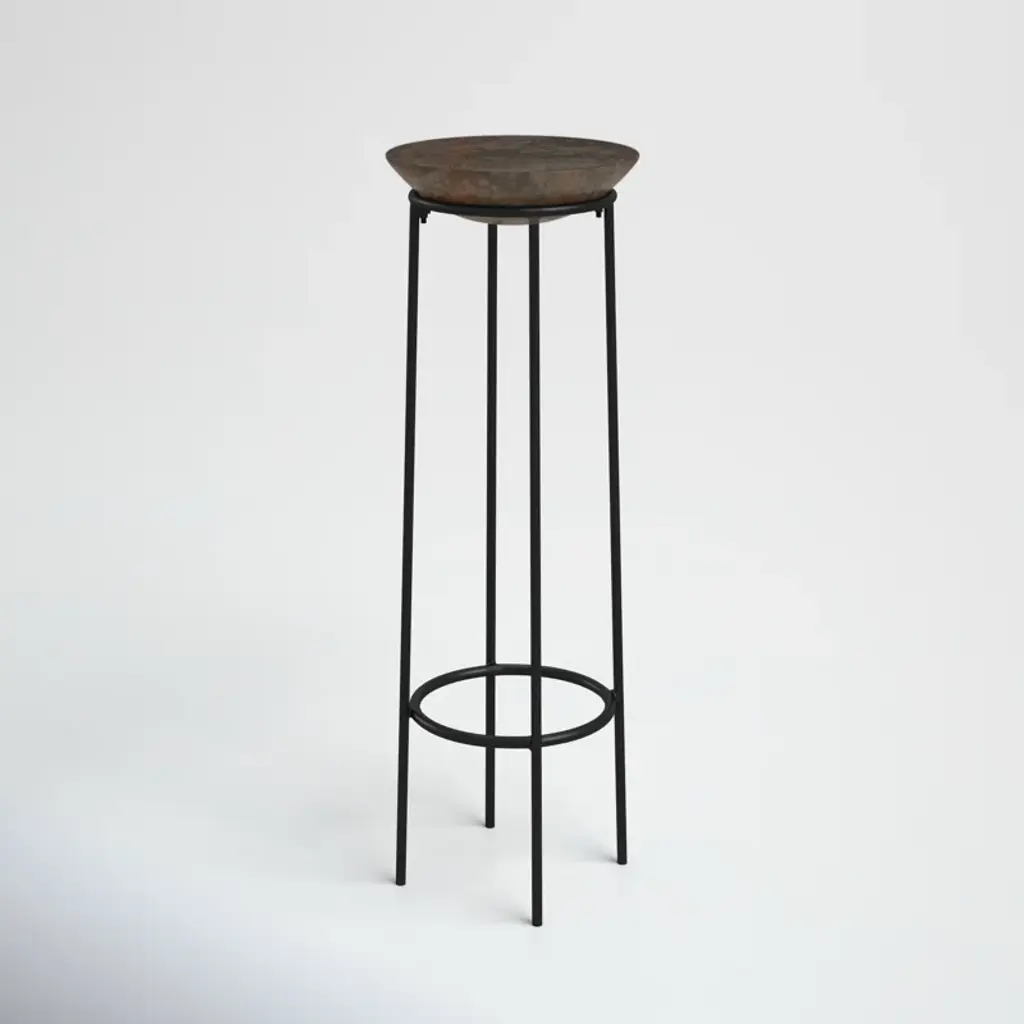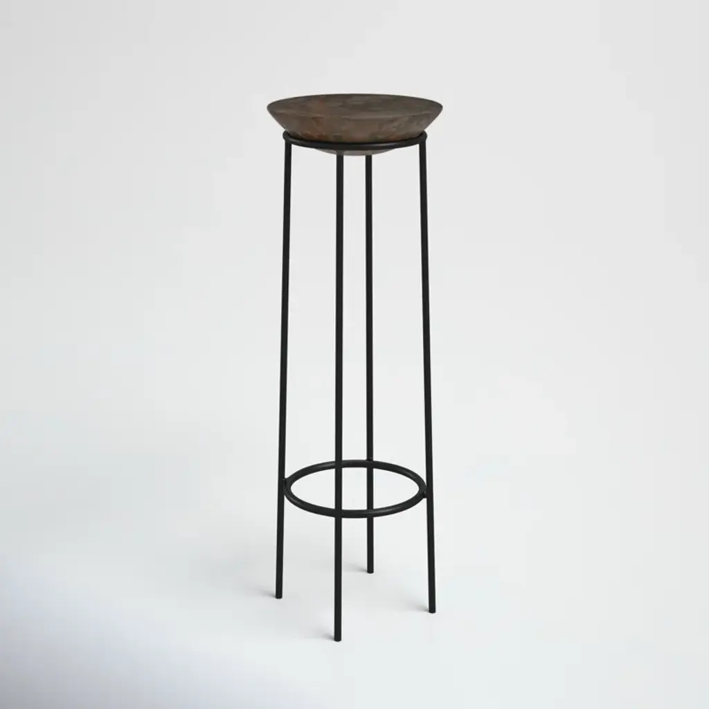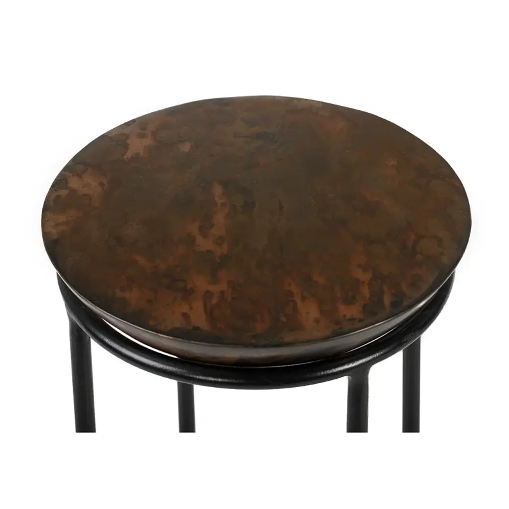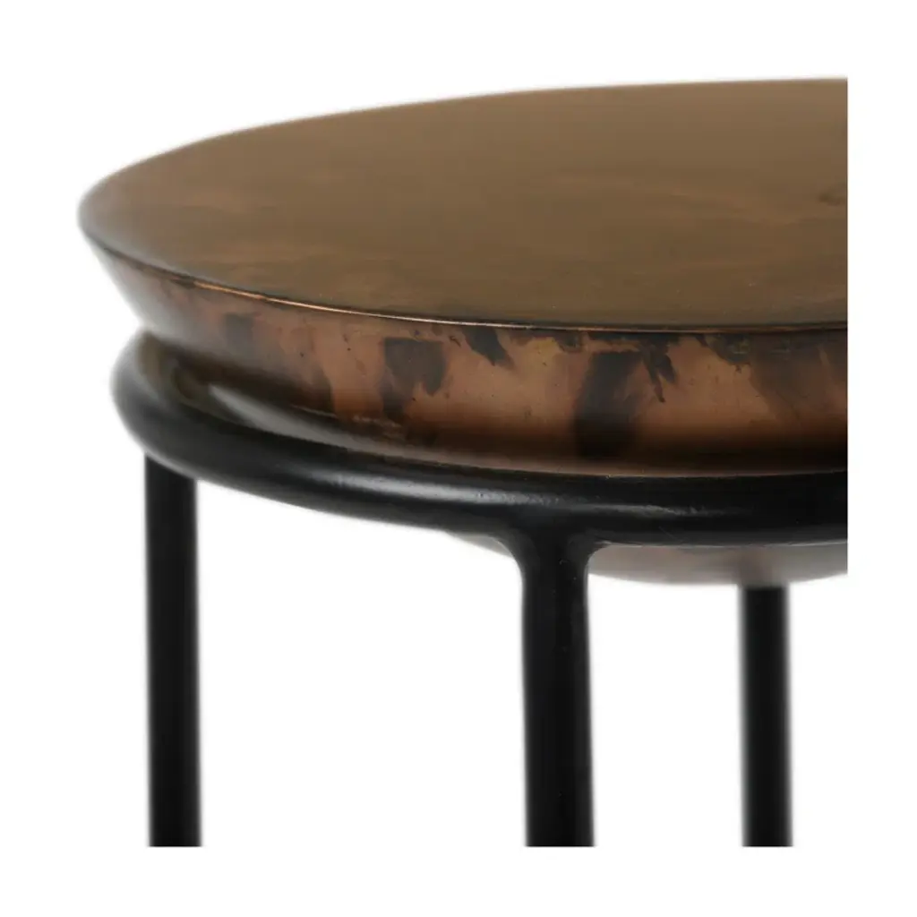This metal plant table features a powder coated metal base, supporting a contrasting metal top with a unique, reactive metal finish.