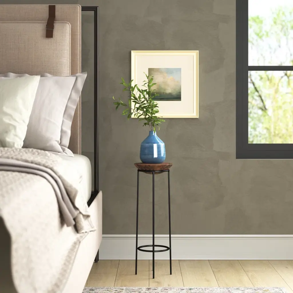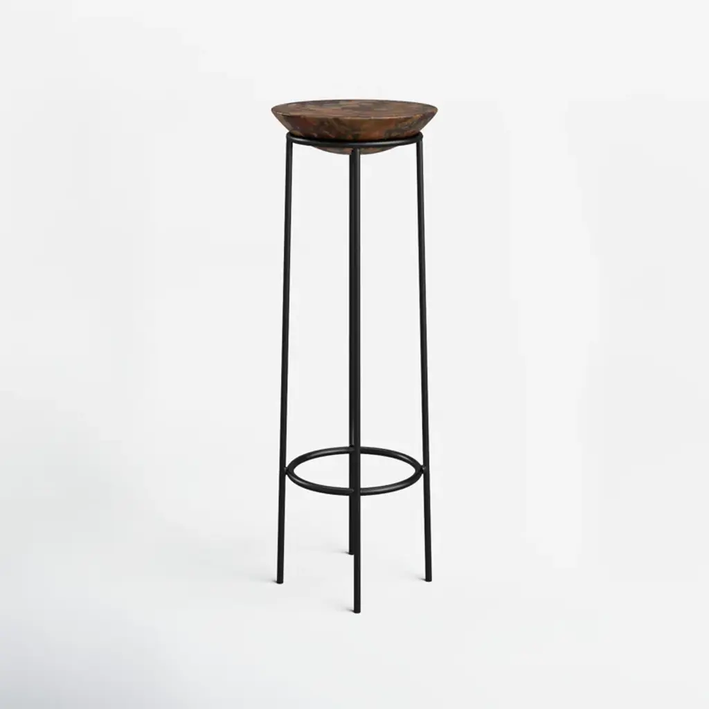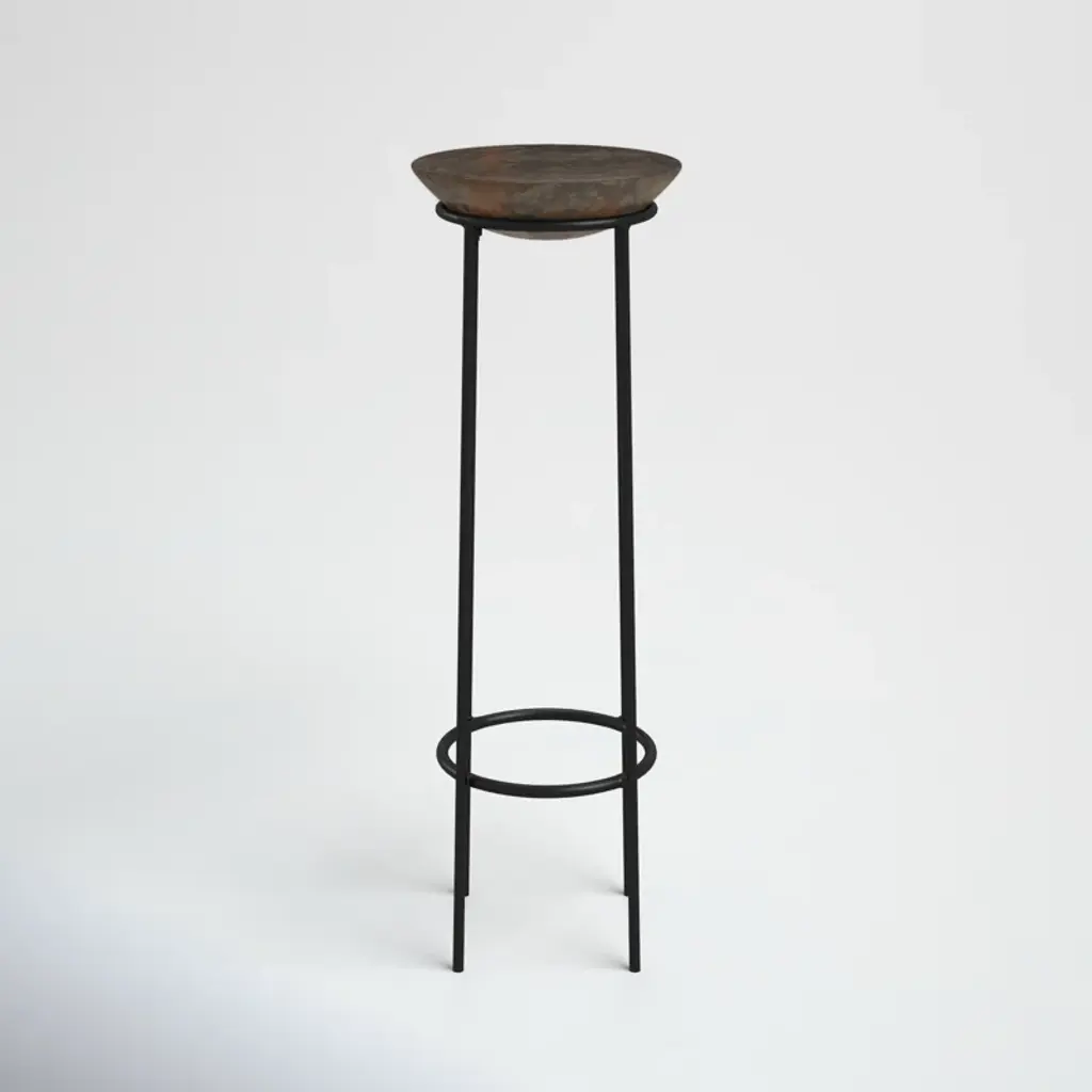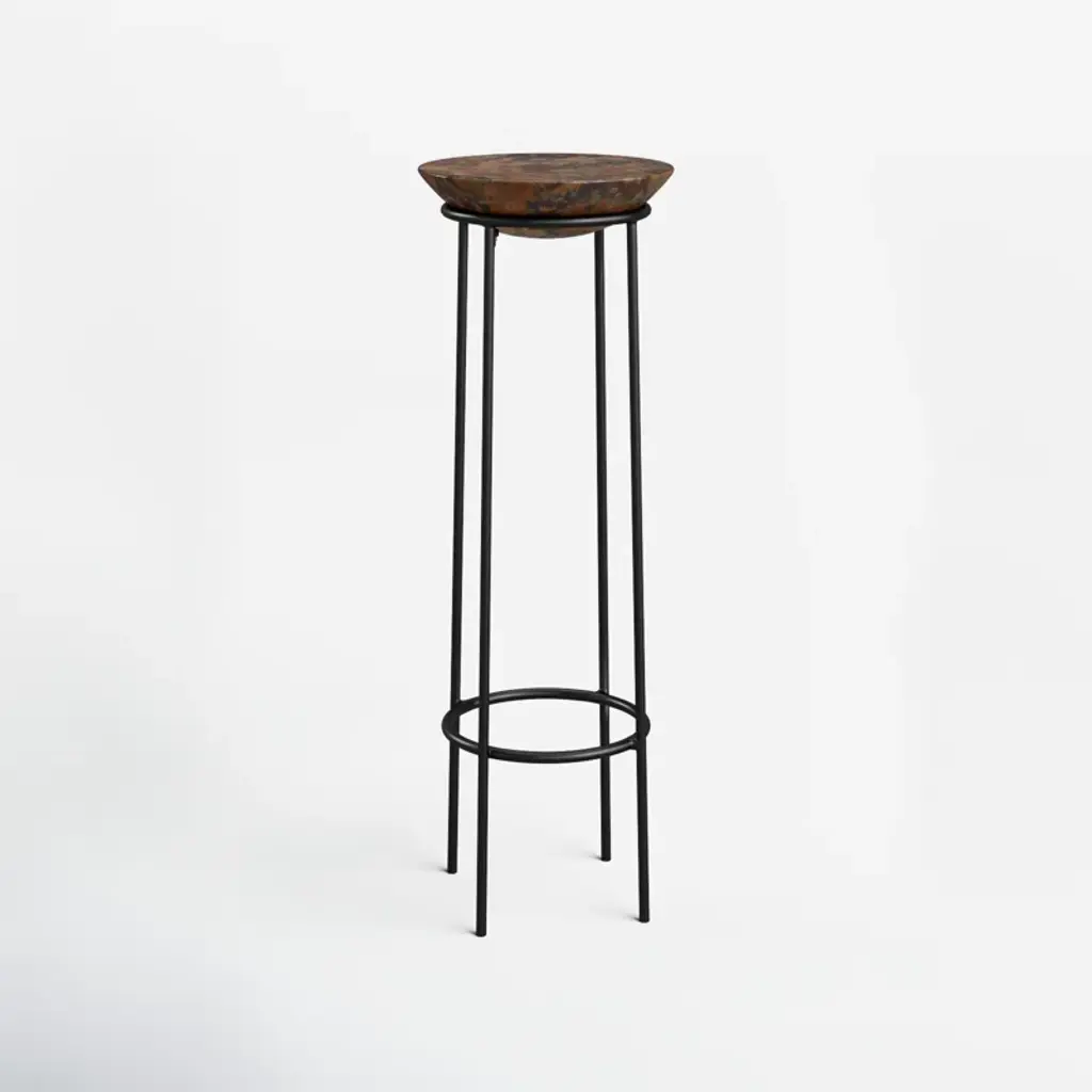 This metal plant table features a powder coated metal base, supporting a contrasting metal top with a unique, reactive metal finish.