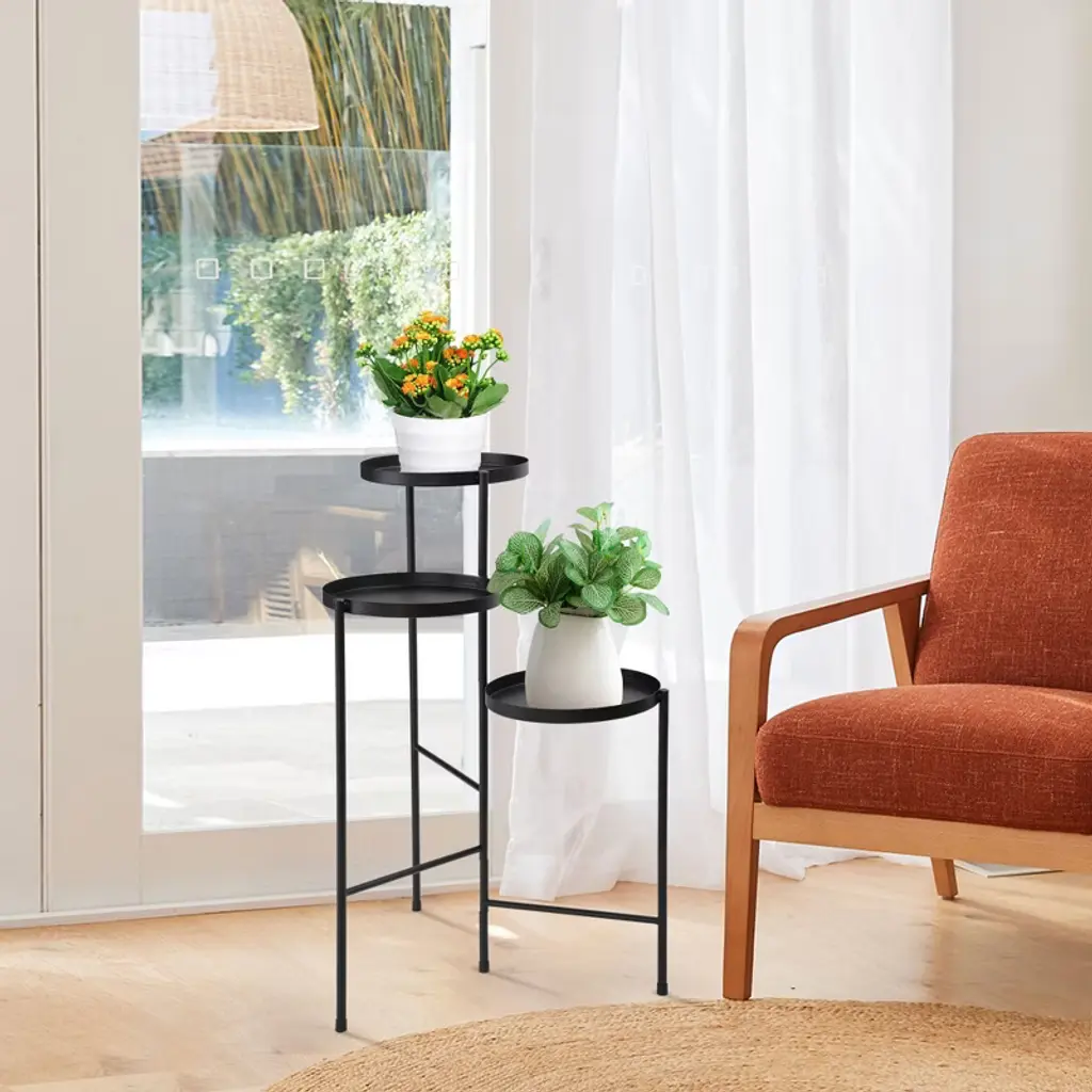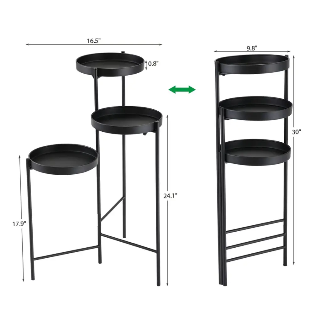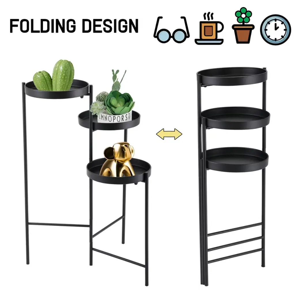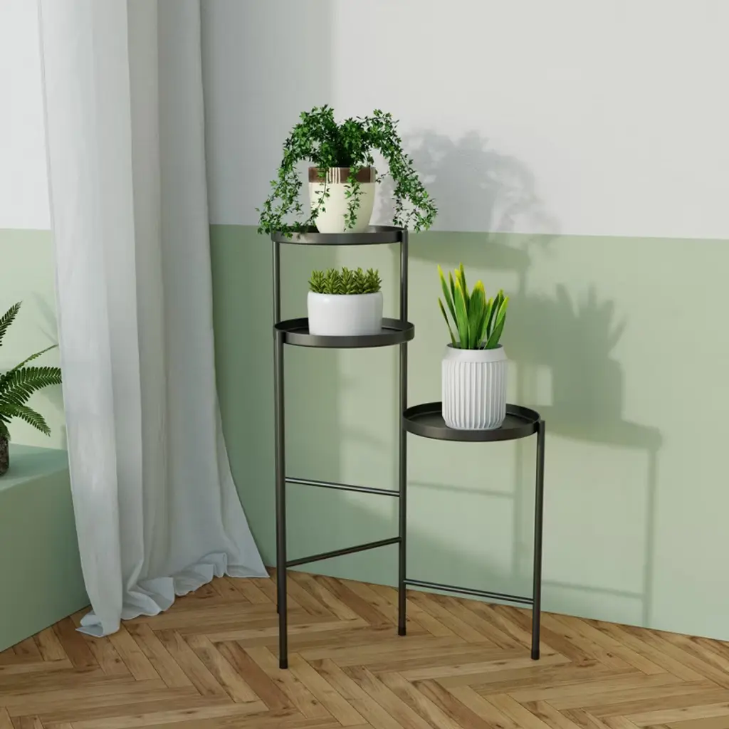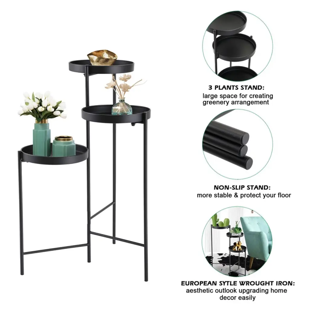 Are you still struggling with limited floor space? This 3-Tier Metal Plant Stand with a simple and elegant design is a perfect option. Not only can the metal shelves be used as a plant stand to hold potted flowers or plants indoors or outdoors, but also as a storage rack in the bathroom or kitchen, complementing any home decoration. The top trays can be removed for separate use according to your needs. Features: 3-tier plant stand for living rooms, offices, balconies, entryway, and more Made of heavy-duty iron with a powder-coated finish to ensure durability The stable triangular structure maintains balance without bending or tipping Perfect height and size for windows to allow the plants to get more sunlight Round trays with elevated edges on the top can be removed for separate use Easy to clean and easy to fold for space-saving storage and convenient carry