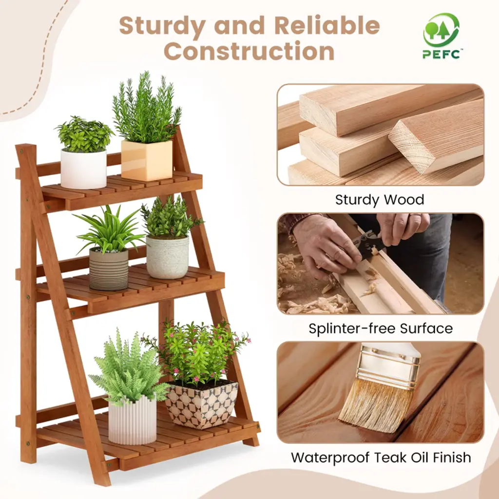 Tangkula 3-tier Wood Plant Stand Folding Flower Rack W/ladder Design Anti-falling Bars