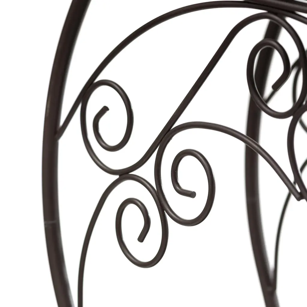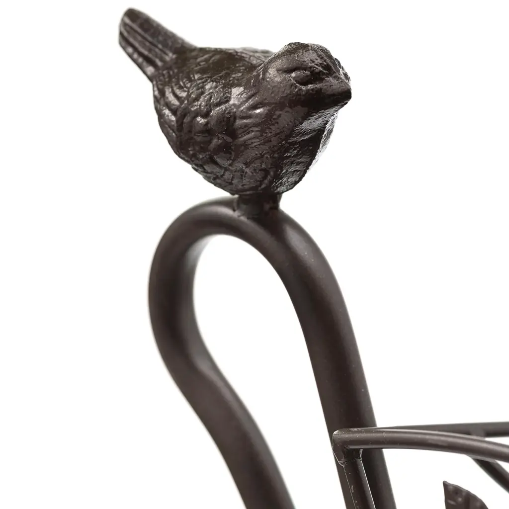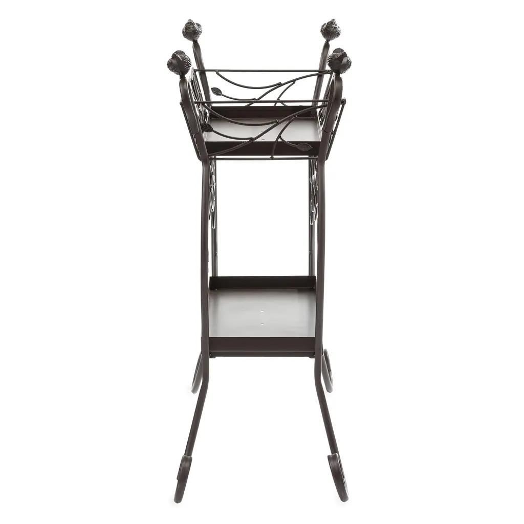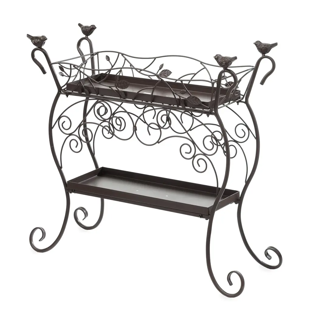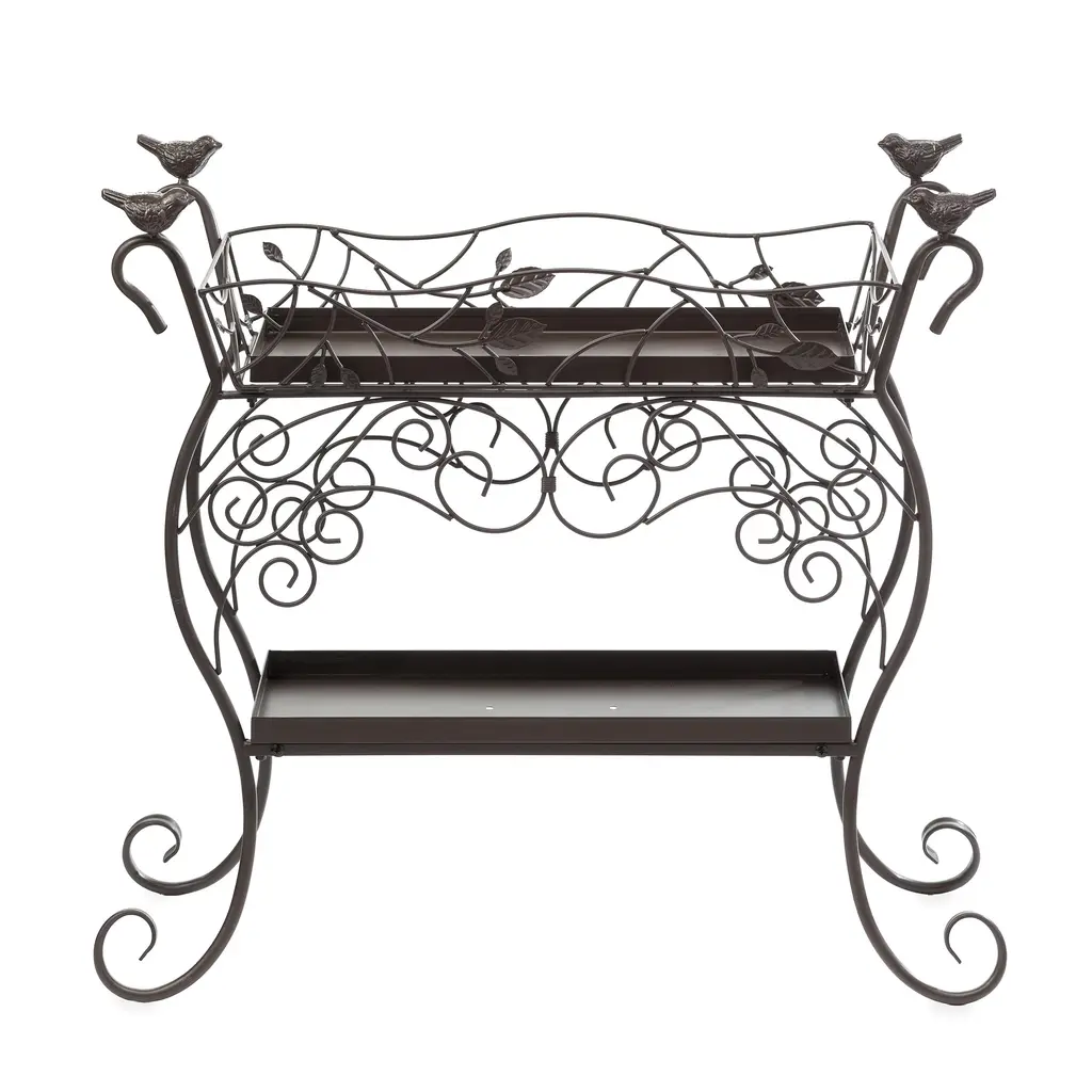 This Two-Tiered Cast Iron Plant Stand with Birds will be the new star of your outdoor decor with its beautiful scrolling vines and charming bird details. The cast iron and metal construction with powder-coat finish makes it a great indoor/outdoor accent, and it's built to last. Use both shelves, designed like trays to prevent water run-off, to display your favorite plants. You can even use it as a stationary bar cart or entertainment piece for inside or out. Weight limit per shelf is 25 lbs.