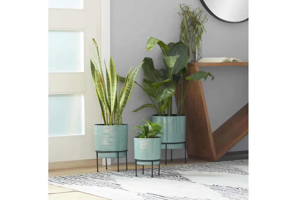 Enhance your living space with the 10" 13" 14" Teal Metal Novogratz Indoor Outdoor Planter with Removable Black Stand Set of 3. These planters are designed to bring a touch of modern elegance to any decor, whether indoors or outdoors.