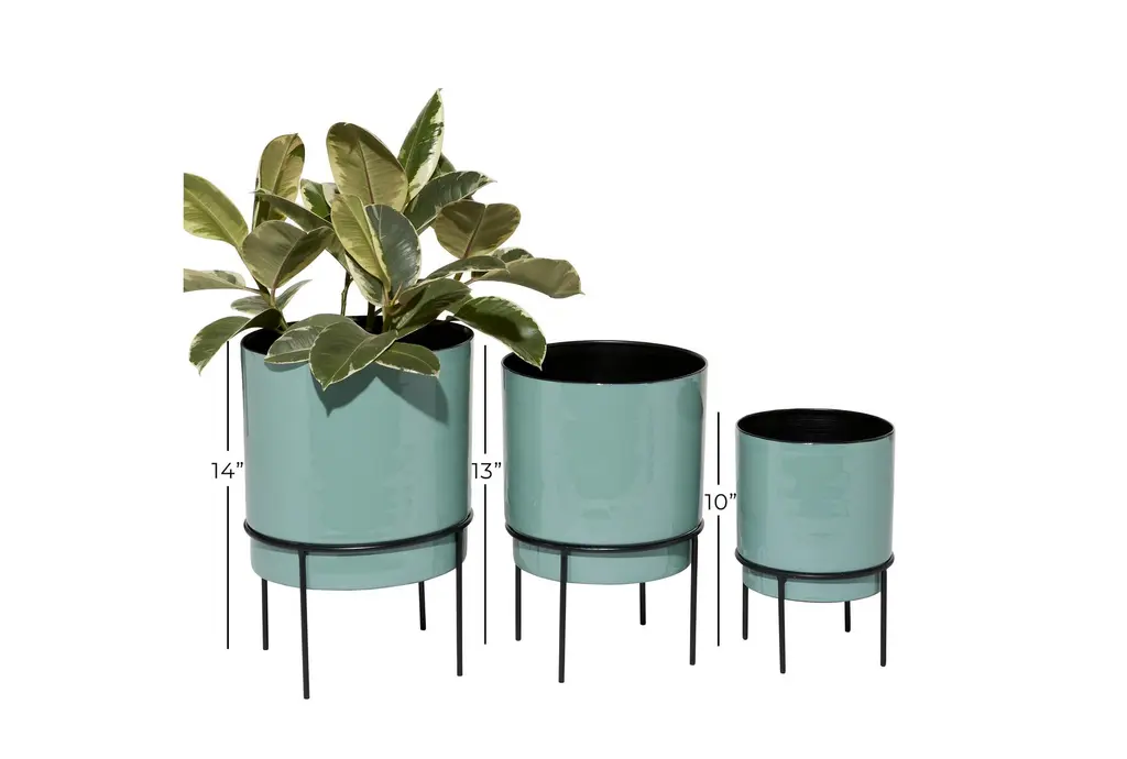 10" 13" 14" Set Of 3 Indoor Outdoor Teal Metal Planter With Removable Black Stand