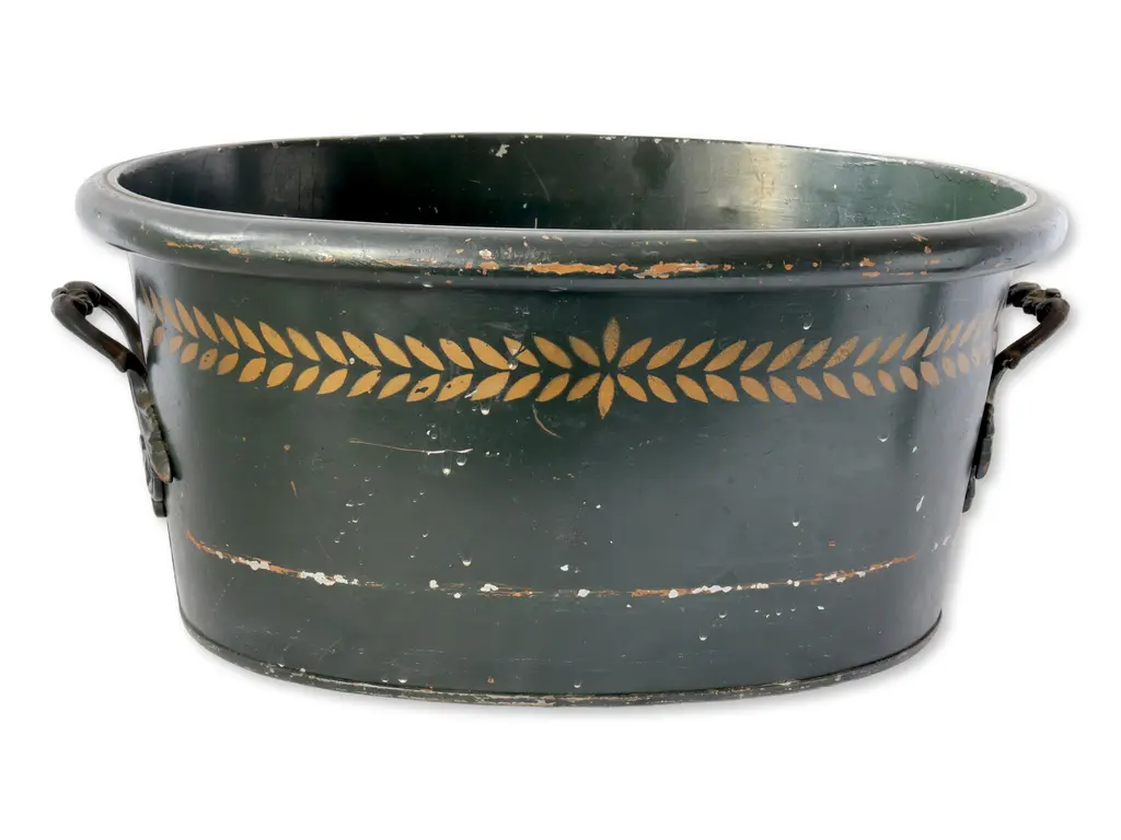The distressed white finish with decorative chipping and rust accents of this large planter brings an authentic Farmhouse and antique feel to your garden area, patio, or indoor space. The neutral white hue with black markings adds texture while complementing any color palette or pattern. Easily transport indoors and out by the sturdy metal handle. The double planter construction lets you display 2 of your favorite plants side by side for a full foliage look with a Farmhouse feel.