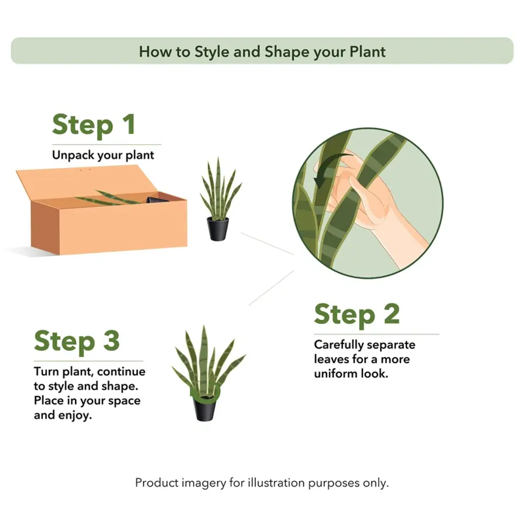 Shh… No one will know your secret about this artificial plant. The waxy, variegated leaves, resemble the real one’s intricate detailing that is unique to the Sansevieria. Bring vertical foliage to your space with upward-facing, sword-like leaves, maintenance-free. Standing from a terracotta planter - included in height, add this faux snake plant to compact spaces. Item will need to be re-shaped when removed from the box, this artificial plant can easily bend for reshaping purposes - please separate and fluff the stems to achieve the desired fullness.