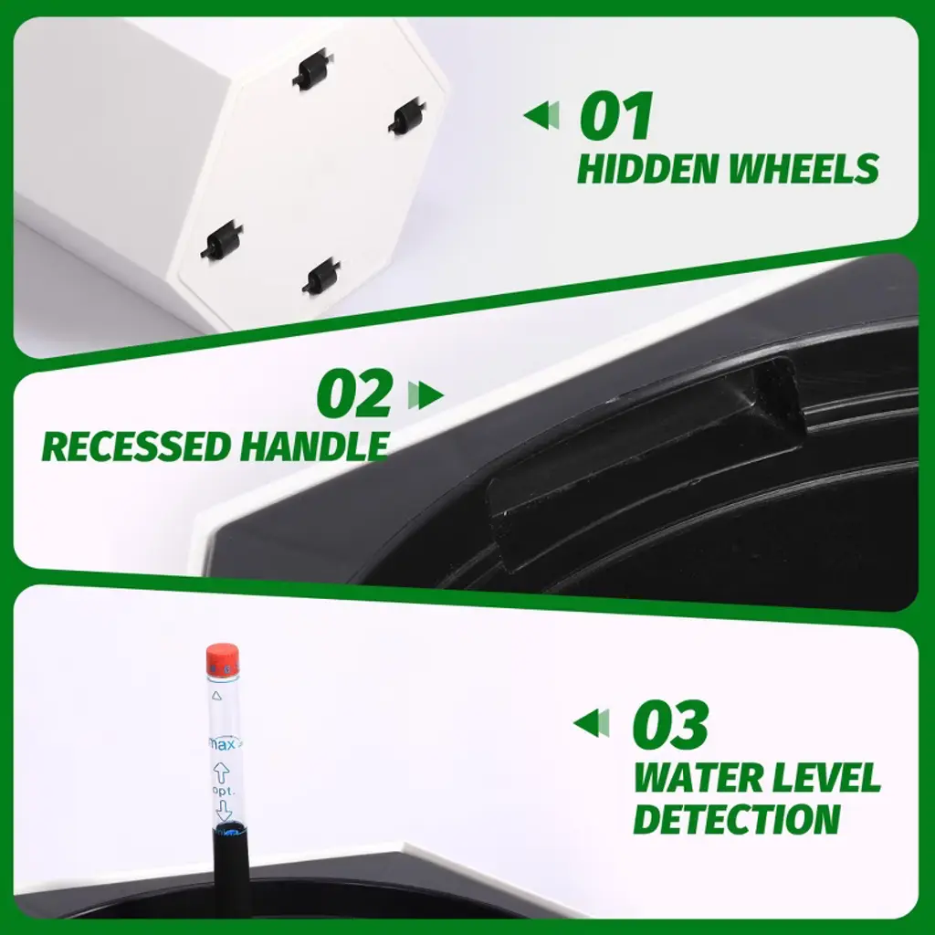 Simplify your plant care routine with this set of two stylish 16-inch tall hexagonal self-watering planters Designed with a built-in water storage tank, these pots provide continuous moisture through evaporation, reducing the need for frequent watering¡ªideal for busy lifestyles or frequent travelers The included water level monitor and safety drain allow you to easily check and adjust water levels, ensuring your plants receive optimal hydration while preventing over- or under-watering Spacious dimensions (15" deep x 14" wide x 16" high) offer ample planting room for flowers and greenery, breathing life into any garden, balcony, or indoor space Each planter features four smooth-rolling bottom wheels for flexible mobility, making it effortless to reposition your plants to capture sunlight or enhance d¨¦cor Beyond functional, these elegant hexagonal planters add a modern touch and visual appeal to patios, lounges, living rooms, and more Dimensions & Features: Size: 16" Height x 14" Width x 15" Depth Set Includes: 2 hexagonal self-watering planters with water level monitors and trays Watering System: Built-in water reservoir for continuous plant hydration Water Level Monitor: Easy-to-read gauge and safety drain prevent watering errors Drainage: Built-in drainage holes to promote healthy root growth Mobility: Four bottom wheels for smooth, flexible movement indoors or outdoors Material: Durable construction suitable for both indoor and outdoor environments Usage: Ideal for gardens, patios, balconies, lounges, and living rooms Design: Modern hexagonal shape combining style and functionality What You Get: 2 Hexagonal self-watering plant pots with water monitors, drainage, and wheels for versatile use After-Sales Service: Care instructions and customer support included to help maintain healthy plants and planter durability