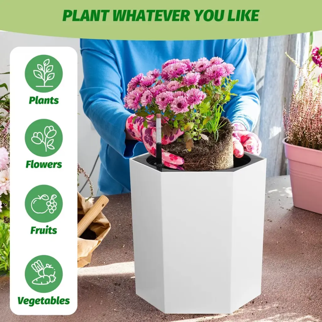 16" Tall Hexagonal Self-watering Planters Set Of 2 With Water Level Monitor, Bottom Wheels & Drainage Hole ̈C Indoor & Outdoor Plant Pots, White