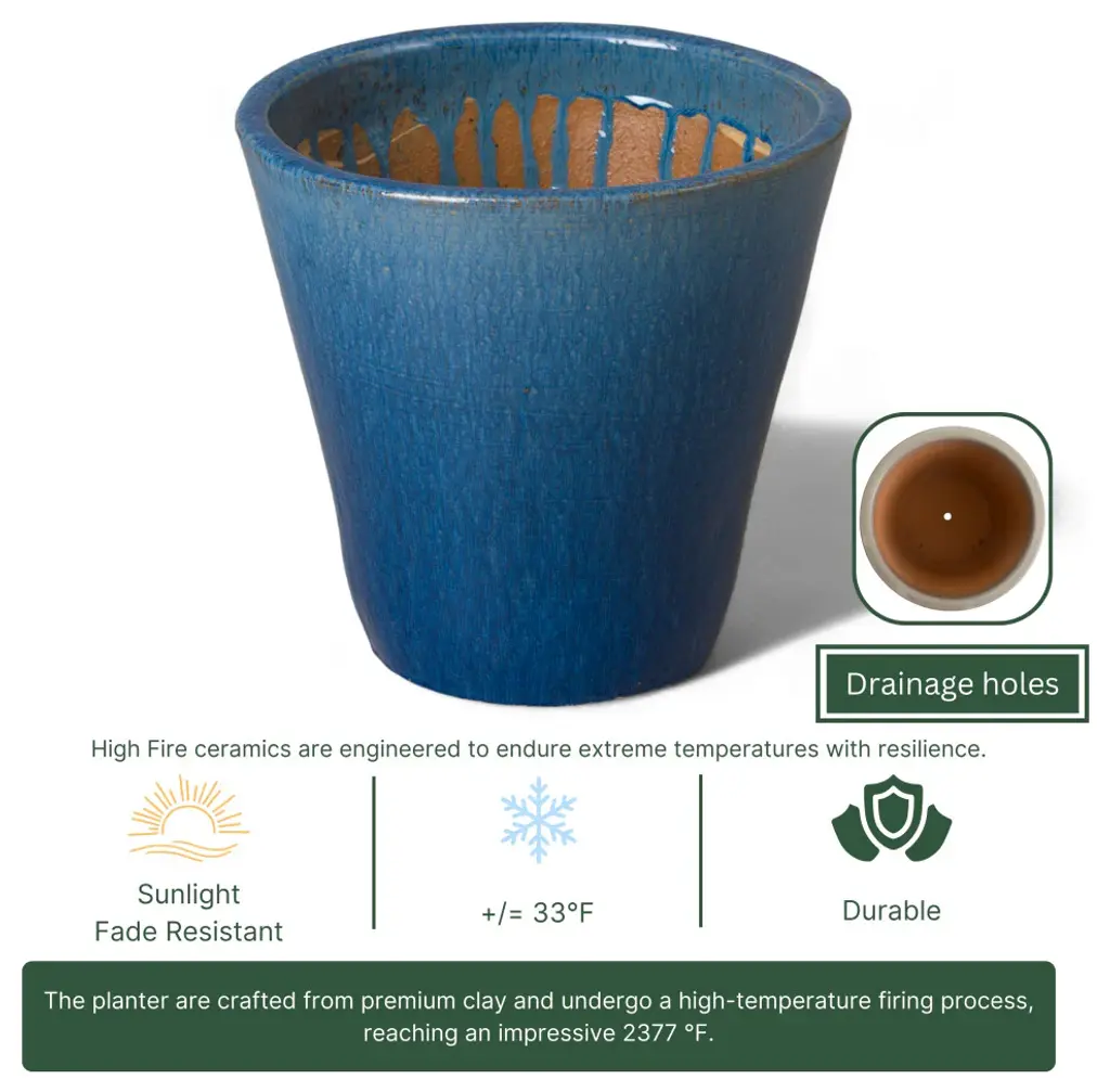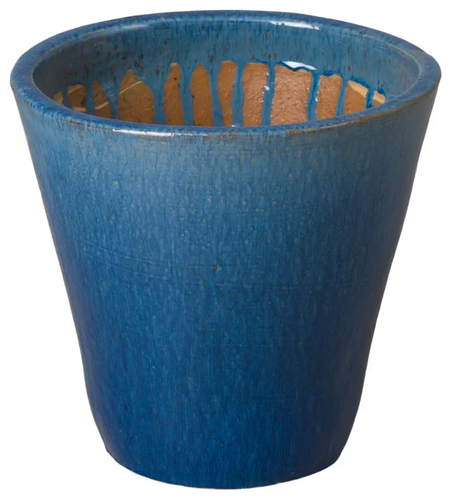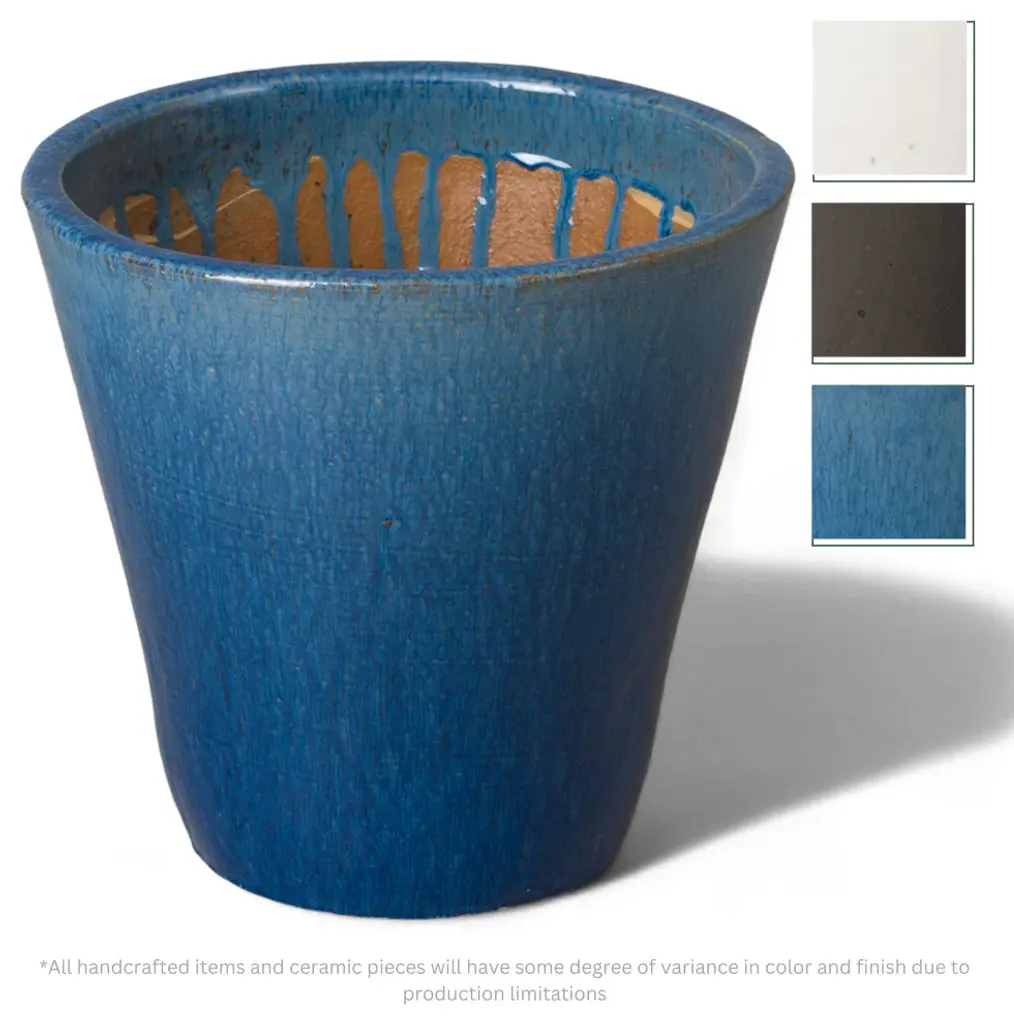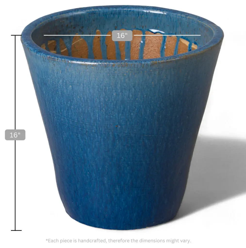 This tapered ceramic planter is handcrafted and finished in a glossy blue glaze. Starting at 16 inches wide at the mouth of the piece, the sides of the planter steadily taper down to a 9.5 inch wide base. Made from heavy and durable red clay, this planter is able to be used both indoors and outdoors. The base of the planter has a one inch diameter drainage hole to help prevent over watering. This simple and sleek planter is the perfect addition to any modern or contemporary living space.