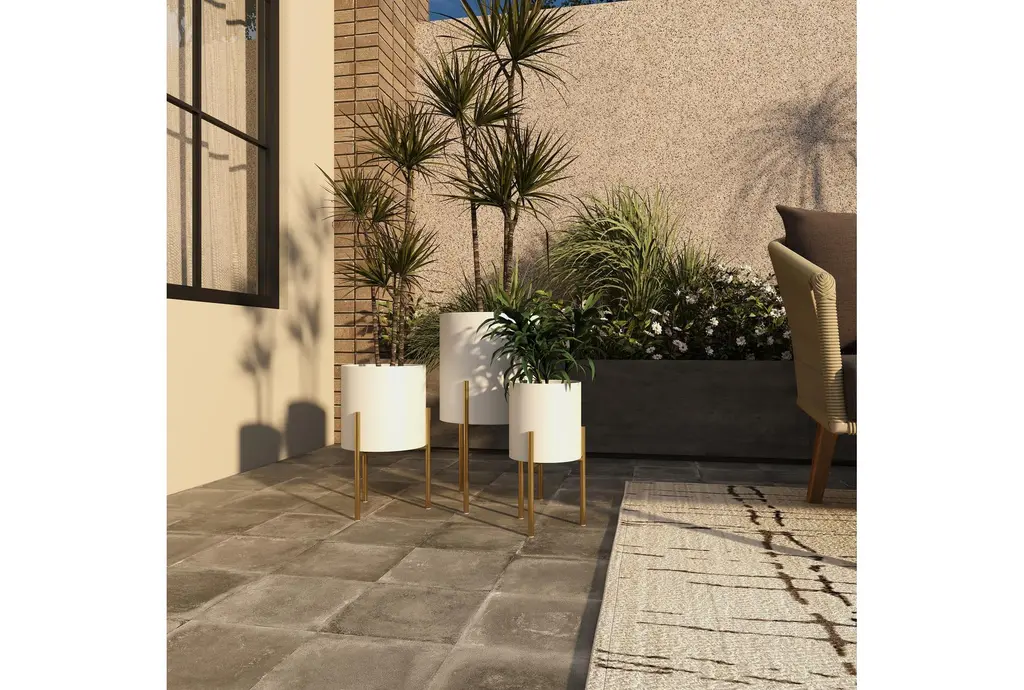 18" 14" 12" White Metal Indoor Outdoor Planter with Removable Stand Set of 3 offers a straightforward way to display plants on a patio or in a living room. Each white iron planter sits on a removable stand that lifts pots off surfaces to improve drainage and help protect floors. The three sizes let you create layered groupings for tall, trailing and compact plants so you can style a cohesive arrangement with ease.