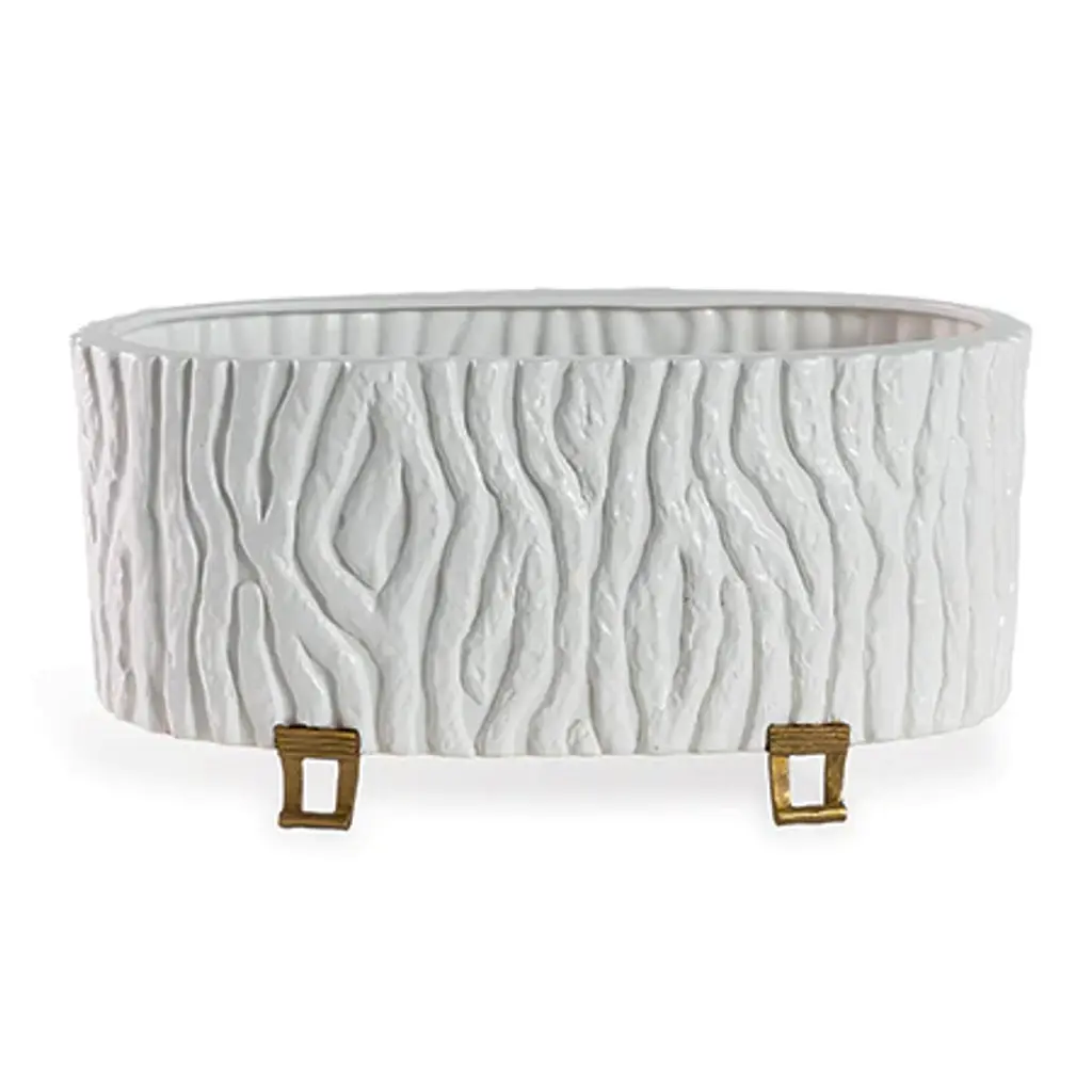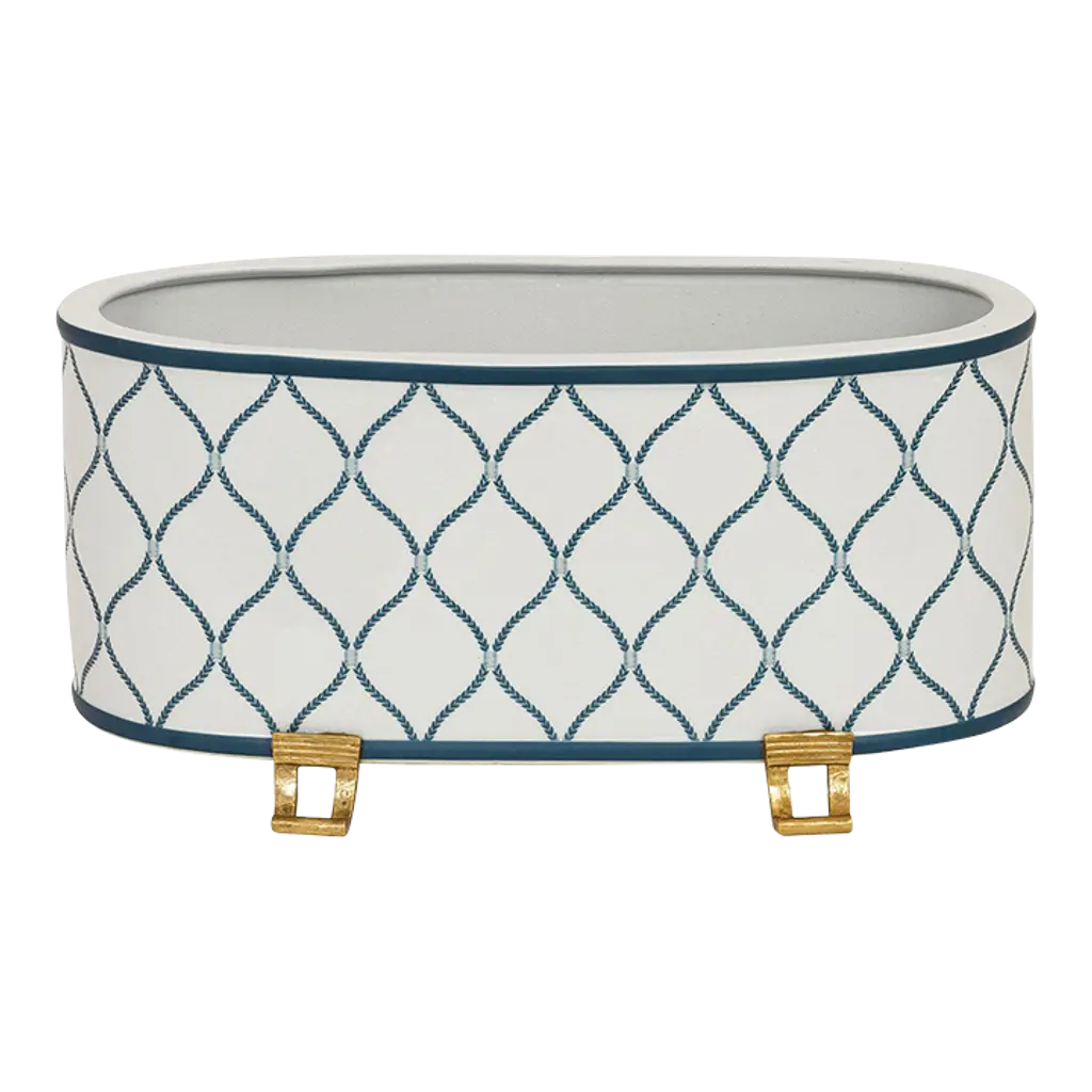 Beautifully shaped of porcelain with a slate-blue trellis repeat, crackled glaze, and brass feet, this planter looks just as stylish on its own as it does displaying fresh greenery.