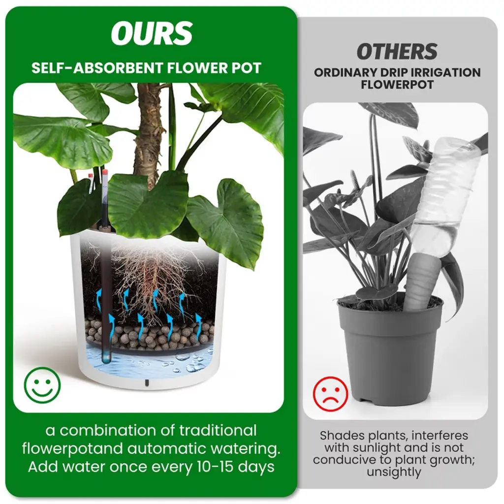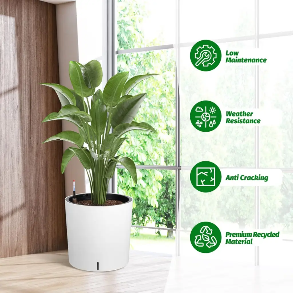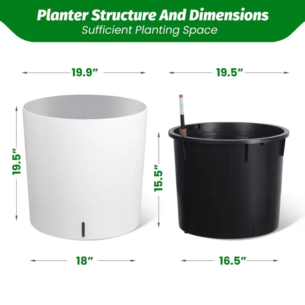 This set includes two planters. These self-watering planters are extremely durable, the outer planter creates a barrier to the inner planter, which prevents the soil from overheating in the summer and reduces heat loss in the winter, standing up to any weather and ensuring that your outdoor space stays vibrant and beautiful throughout the seasons. The self-watering planter is designed with a hidden storage tank, which effectively stores water to meet the needs of your plants and enhance the overall aesthetics of the planter while maintaining a neat appearance. The self-watering planter can realize even and continuous water supply, which is especially suitable for those plants that prefer a relatively moist environment, avoiding problems such as plant rot caused by improper watering. The visual water level design of the planter allows you to easily check the water levels to ensure they stay within the optimal range and allows for quick replenishment - saving you up to two weeks of watering time. Solves the problem of overwatering and replenishment time, suitable for first time growers or less experienced growers, ideal for modern gardening.