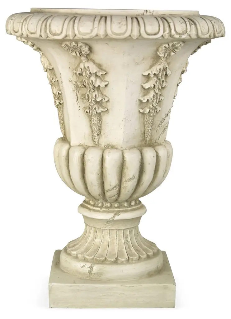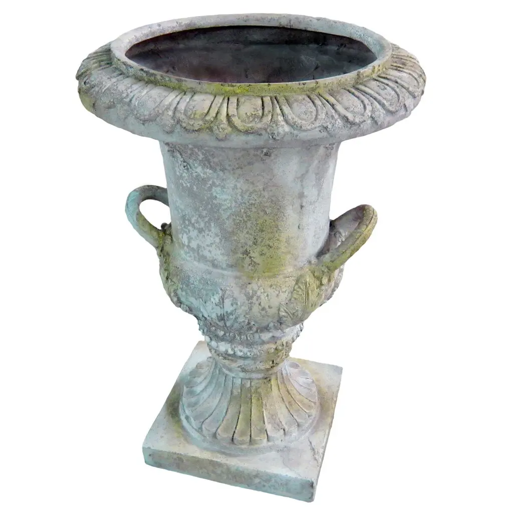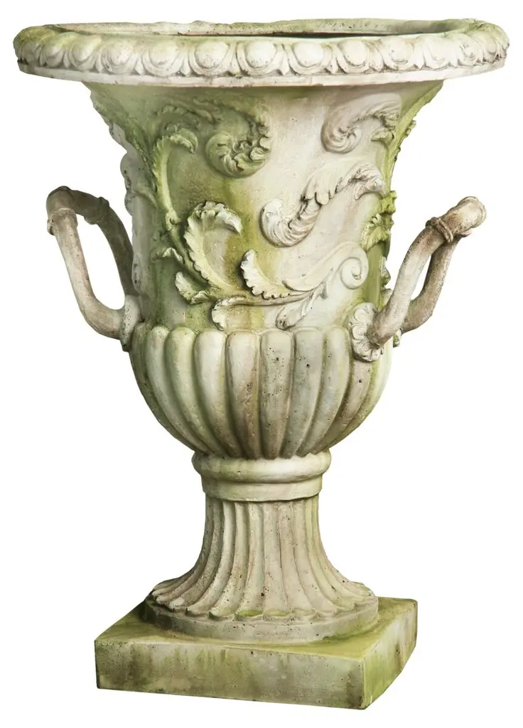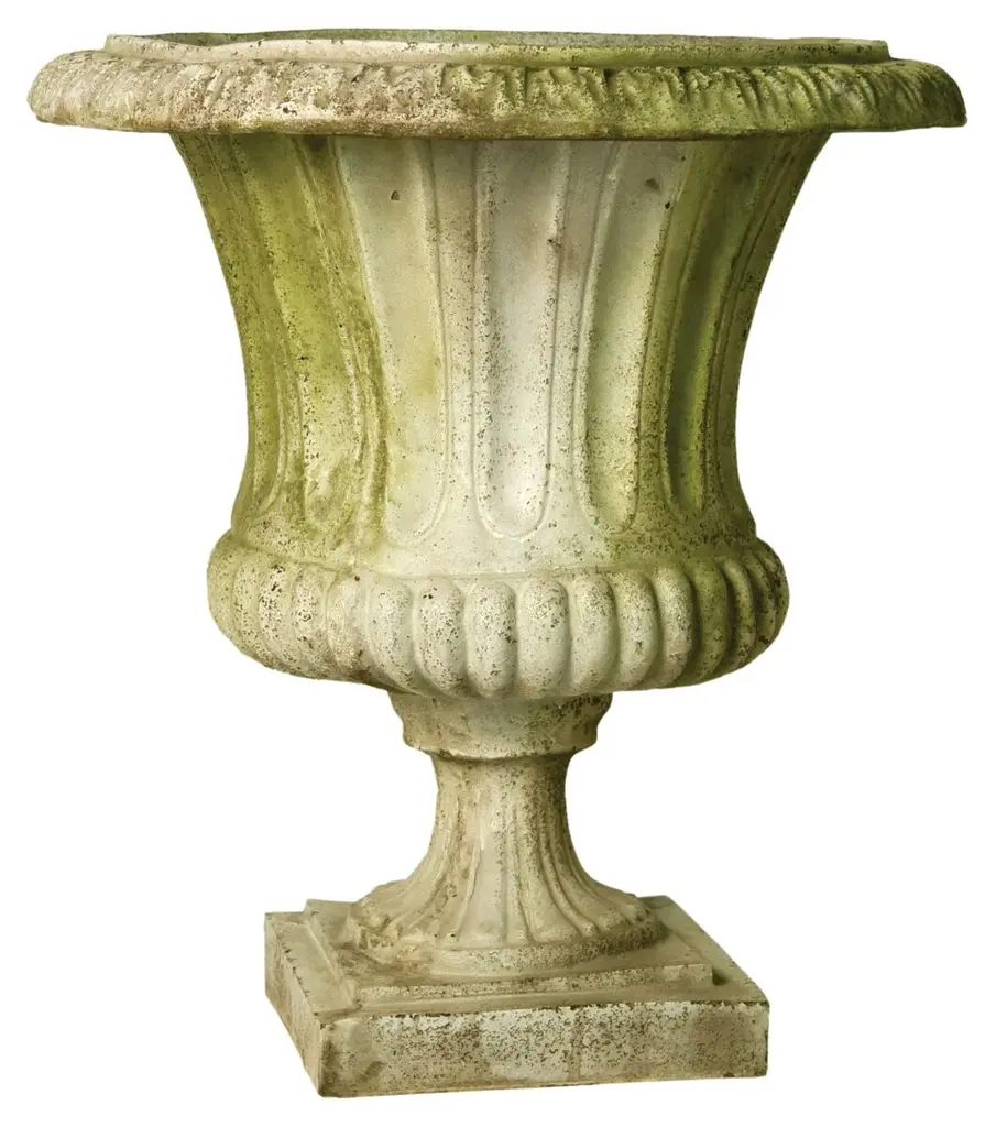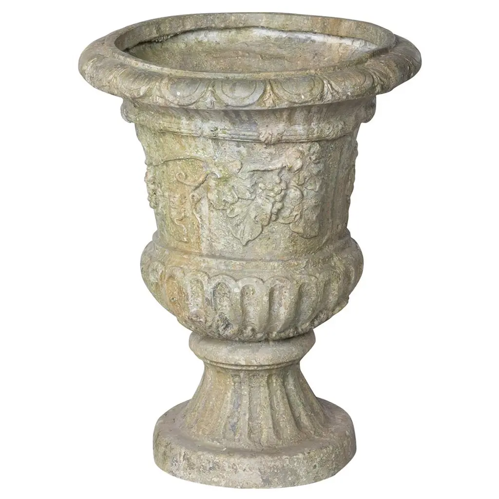 A realistically weathered finish gives this distinctively sculpted urn the look of an antique find. Crafted of Fiber Stone, in which sand and pebbles are cast into fiberglass to create the appearance of aged stone, it weighs much less than stone and is more durable than concrete. Made in the USA.