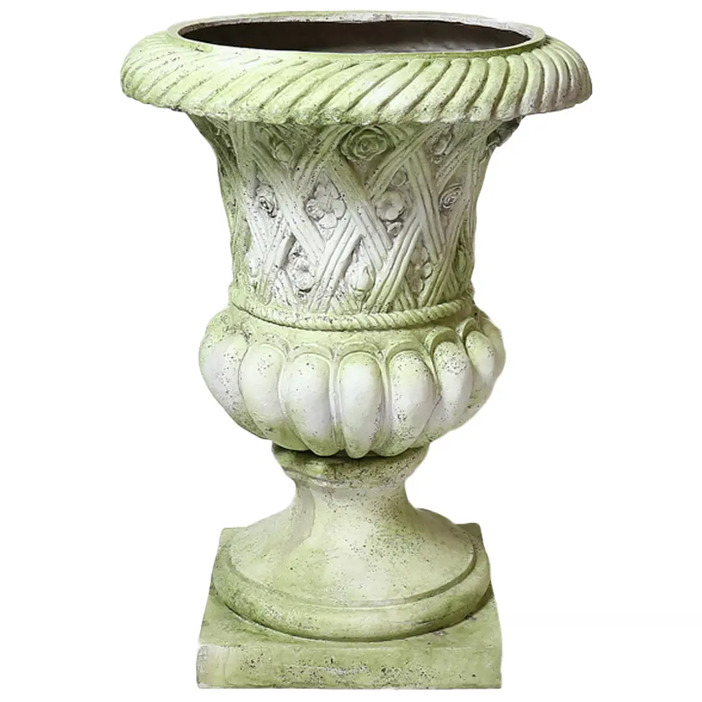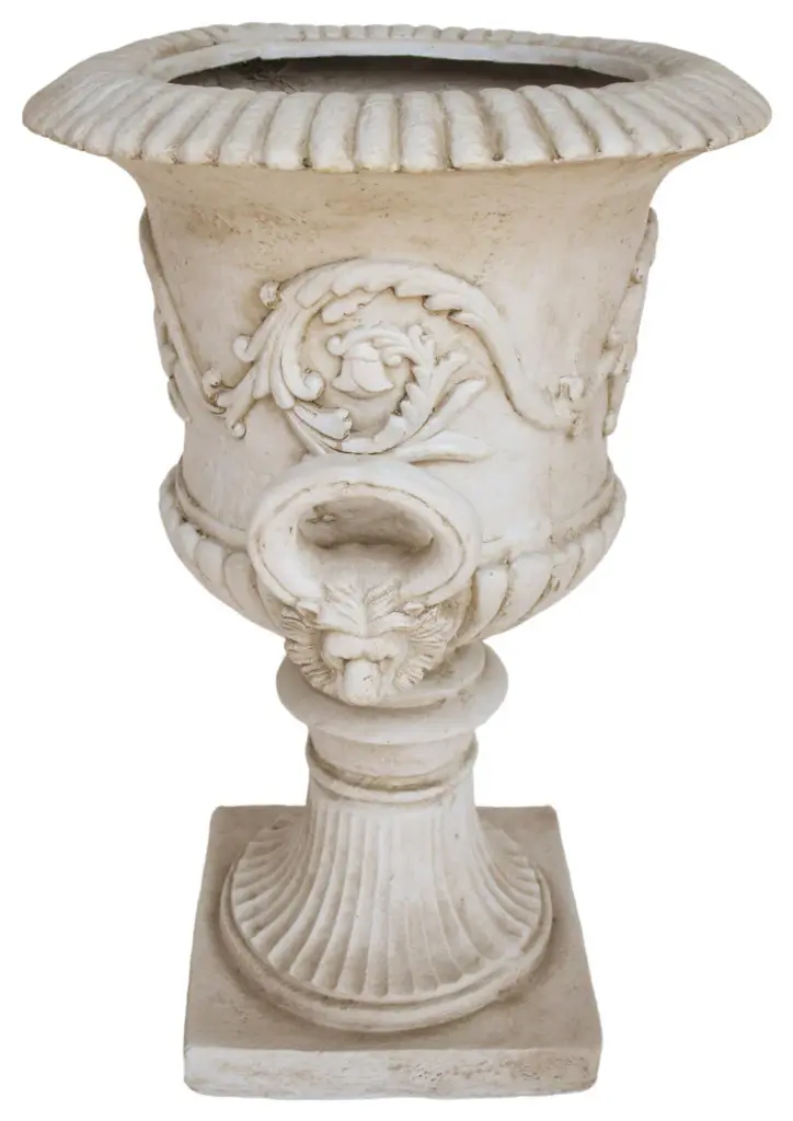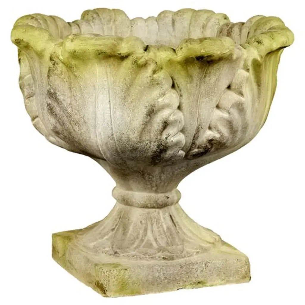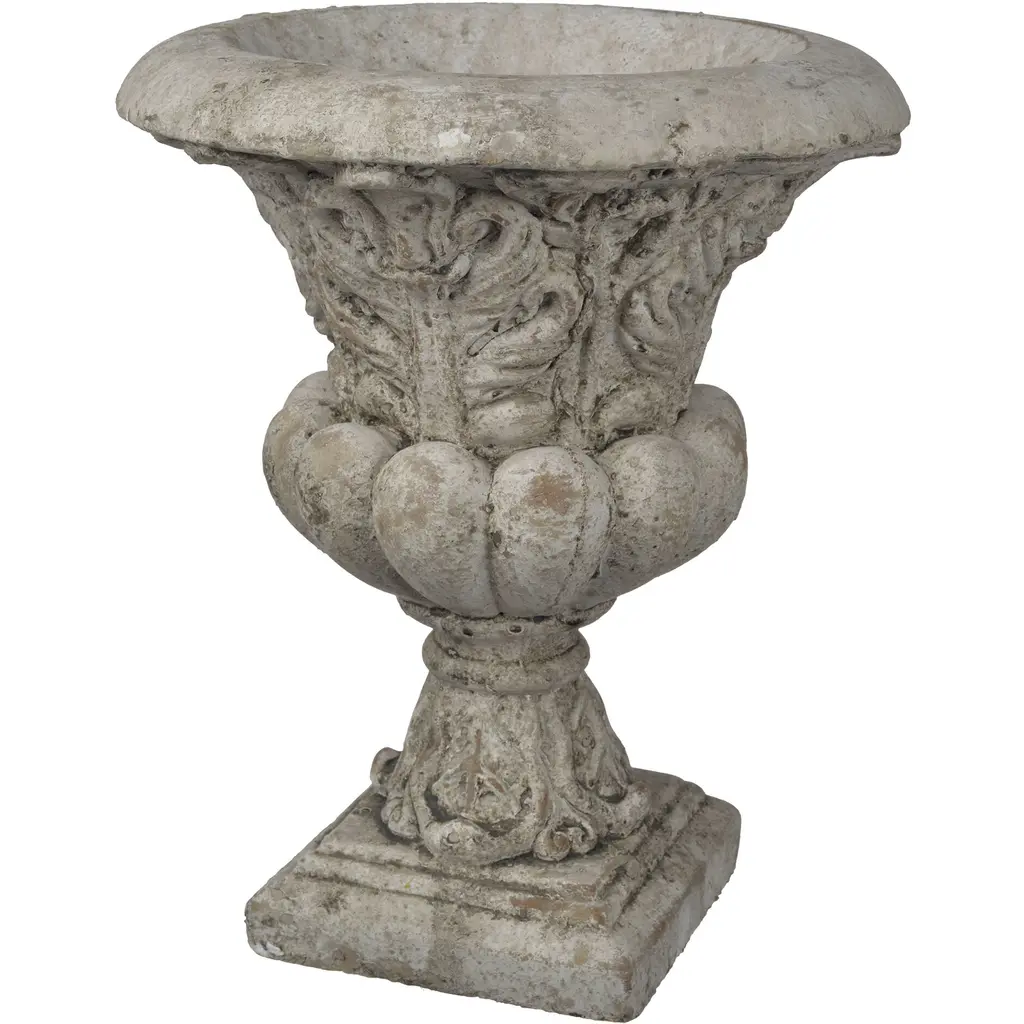 A realistically weathered finish gives this distinctively sculpted urn the look of an antique find. Crafted of Fiber Stone, in which sand and pebbles are cast into fiberglass to create the appearance of aged stone, it weighs much less than stone and is more durable than concrete. Made in the USA.