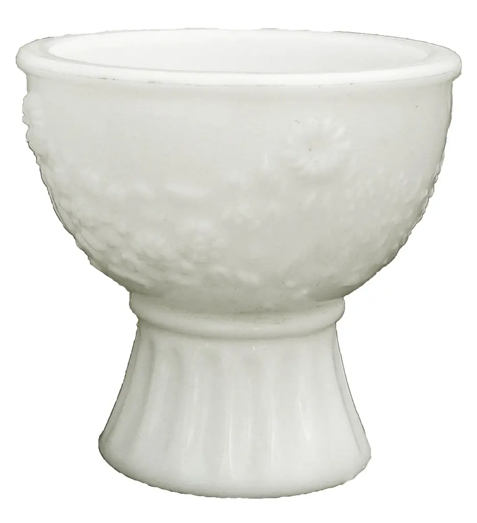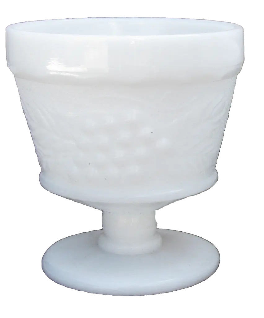 Two mid-century milk glass / opaline vessels. This form is referred to as "pedestal planters"; perfect for planting small succulents. One has a grape motif & footed pedestal base; the other a floral swag design with fluted, flared base. The former has a raised "B 9" mark on the underside, believed to be a 1950s Indiana Glass piece. The second has no marks. Dimensions: 3.6"Dia. x 3.75"H; 3.25"Dia. x 3.75"H. Small fabrication flaw/chip on base.