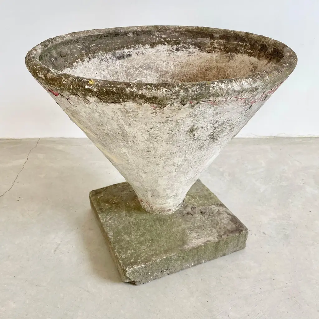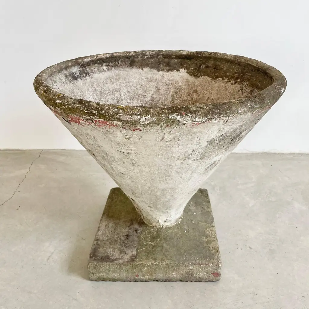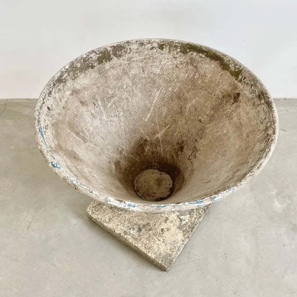 Substantial concrete cone planter by Swiss architect Willy Guhl. Thick cement pedestal base for stability. Heavy and substantial. Unusual shape. Made in the 1960s in Switzerland. Only 1 still available.