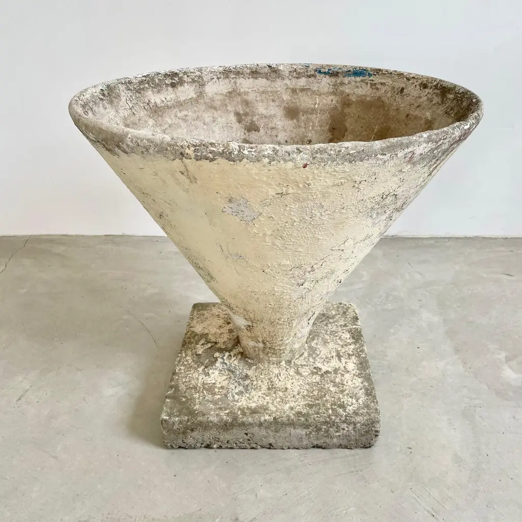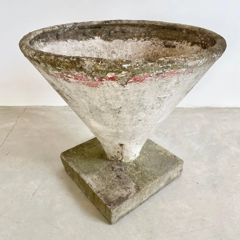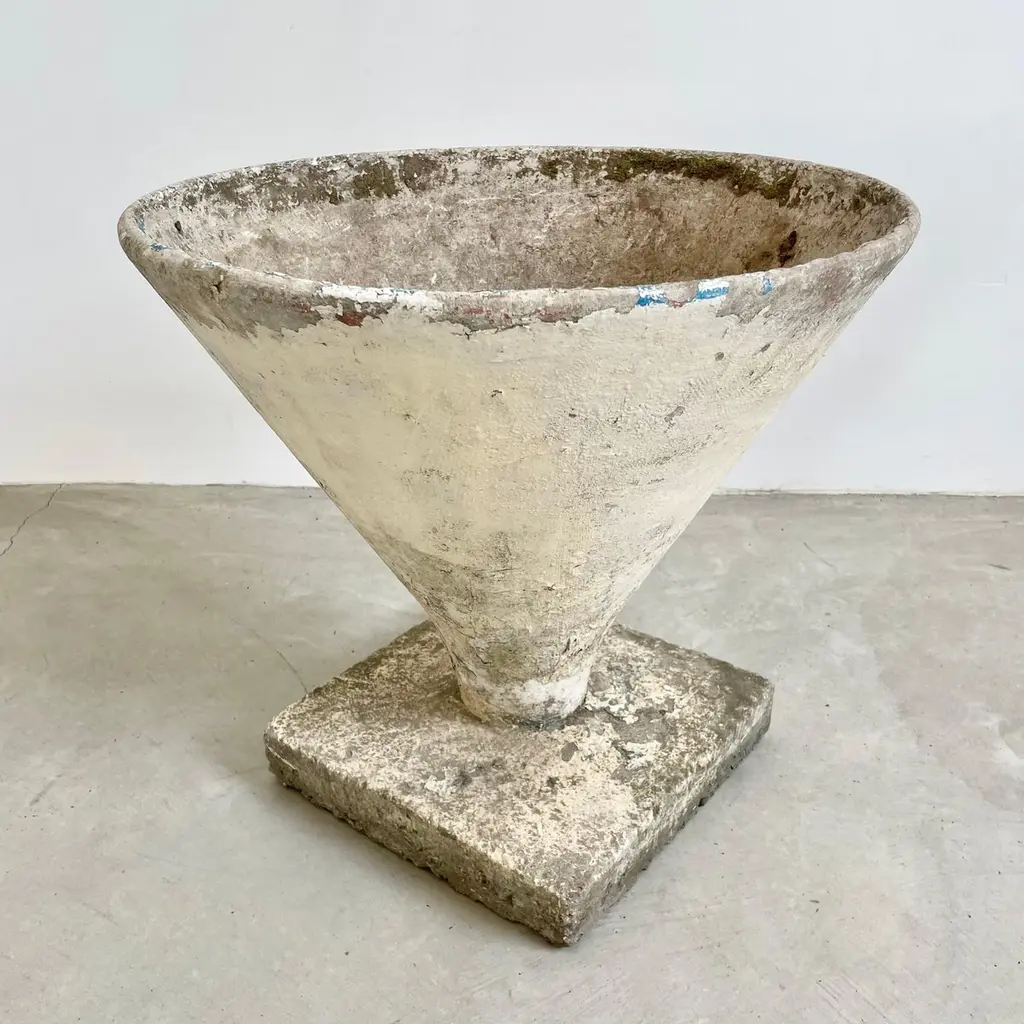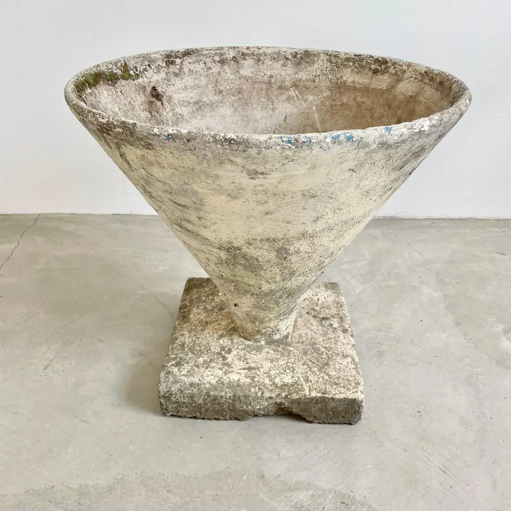 Substantial concrete cone planter by Swiss architect Willy Guhl. Thick cement pedestal base for stability. Heavy and substantial. Unusual shape. Made in the 1960s in Switzerland. Only 1 still available.