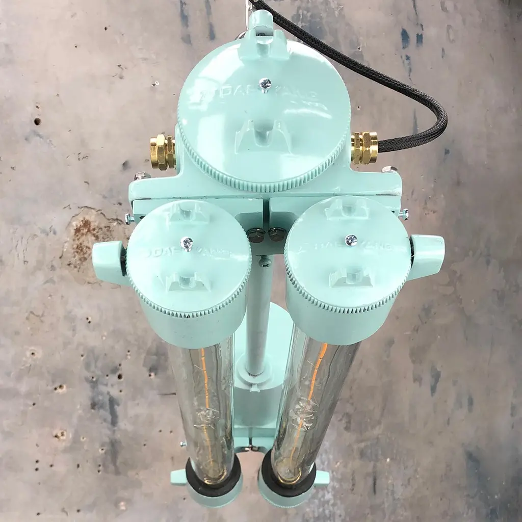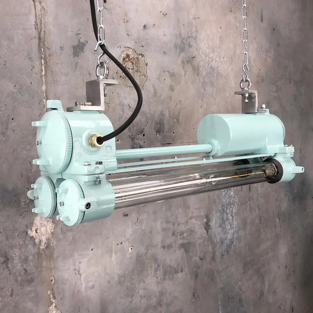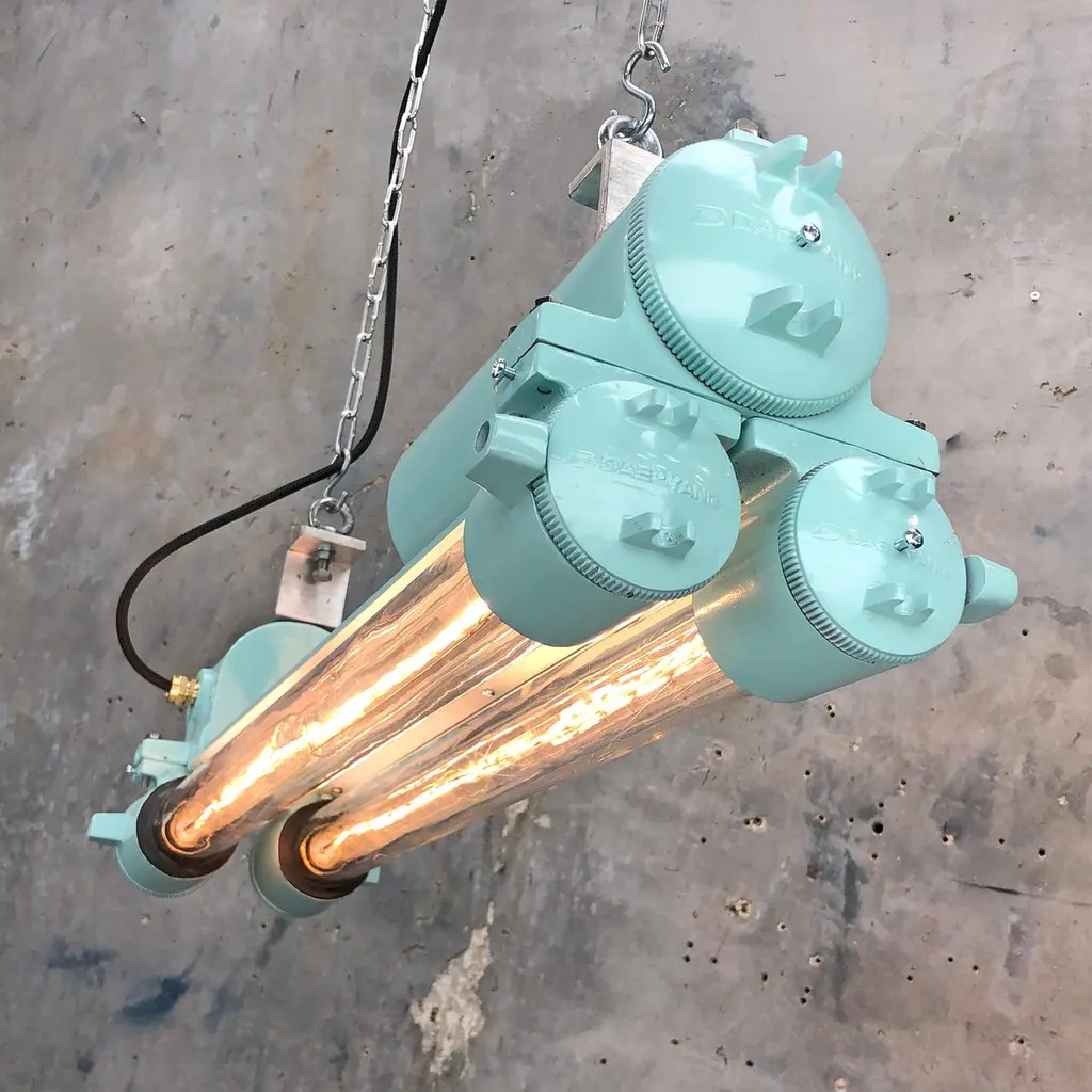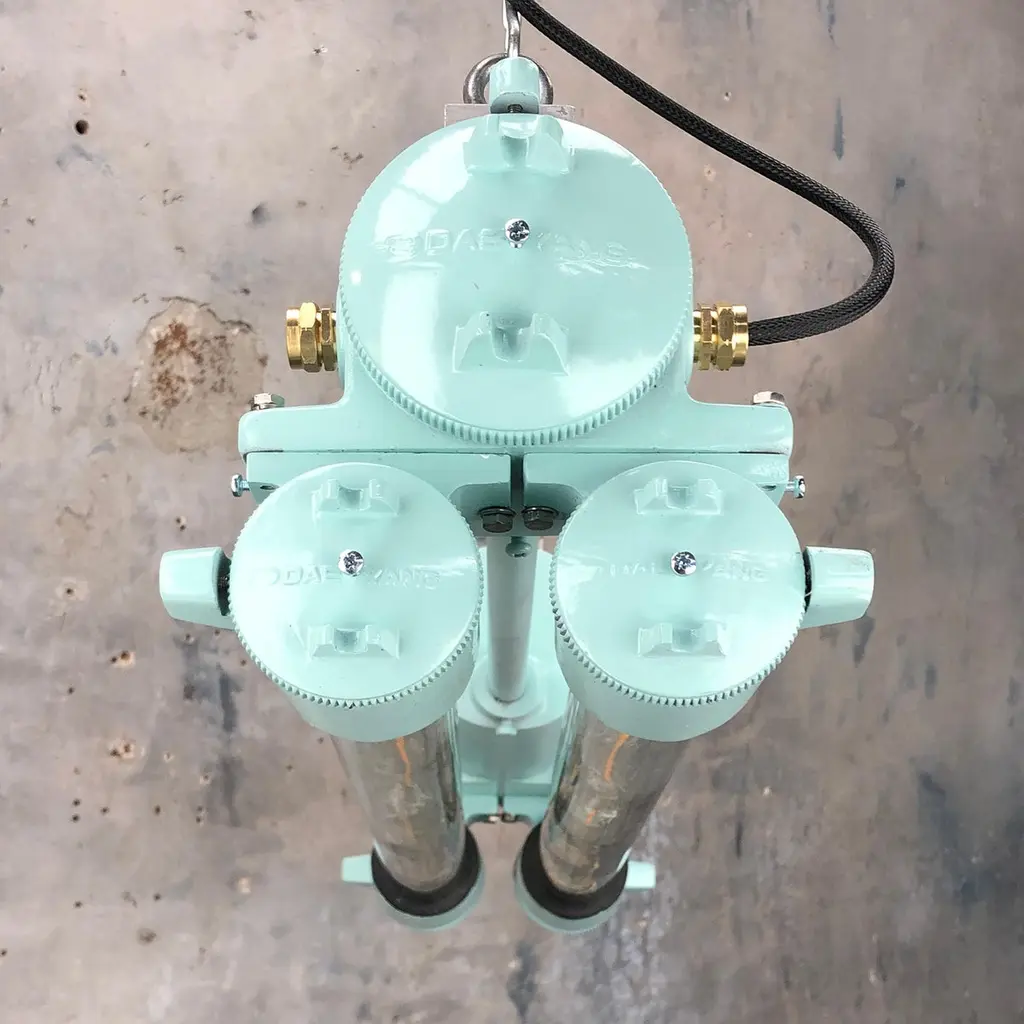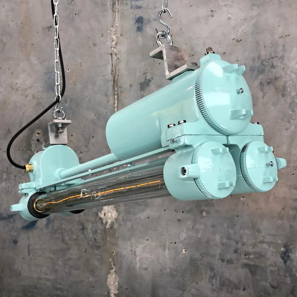 Reclaimed vintage Industrial Korean flameproof striplight made by Daeyang in the 1970's painted in duck egg. Original item salvaged from supertankers and military vessels then professionally restored by Loomlight in the UK ready for installation into modern interiors. Specifications:Height 30cmWidth 30cmLength 70cmWeight 10kgBulb: 4x Edison 300mm E27 tungsten filament. Compatible with 110v USA voltage (LED lamps available on request) The main body is cast aluminum with steel and brass fittings, the tubes are formed from glass and are also flameproof. All lights are professionally re-wired by our in-house team to exceed British Standards using CE approved components. Dimensions and weights are approximate. For all orders to USA, UL listed bulb holders and 100v bulbs will be fitted. All lights are sold ready for use in your home or commercial installation. For any specific requirements please get in touch. We are happy to discuss your individual project.