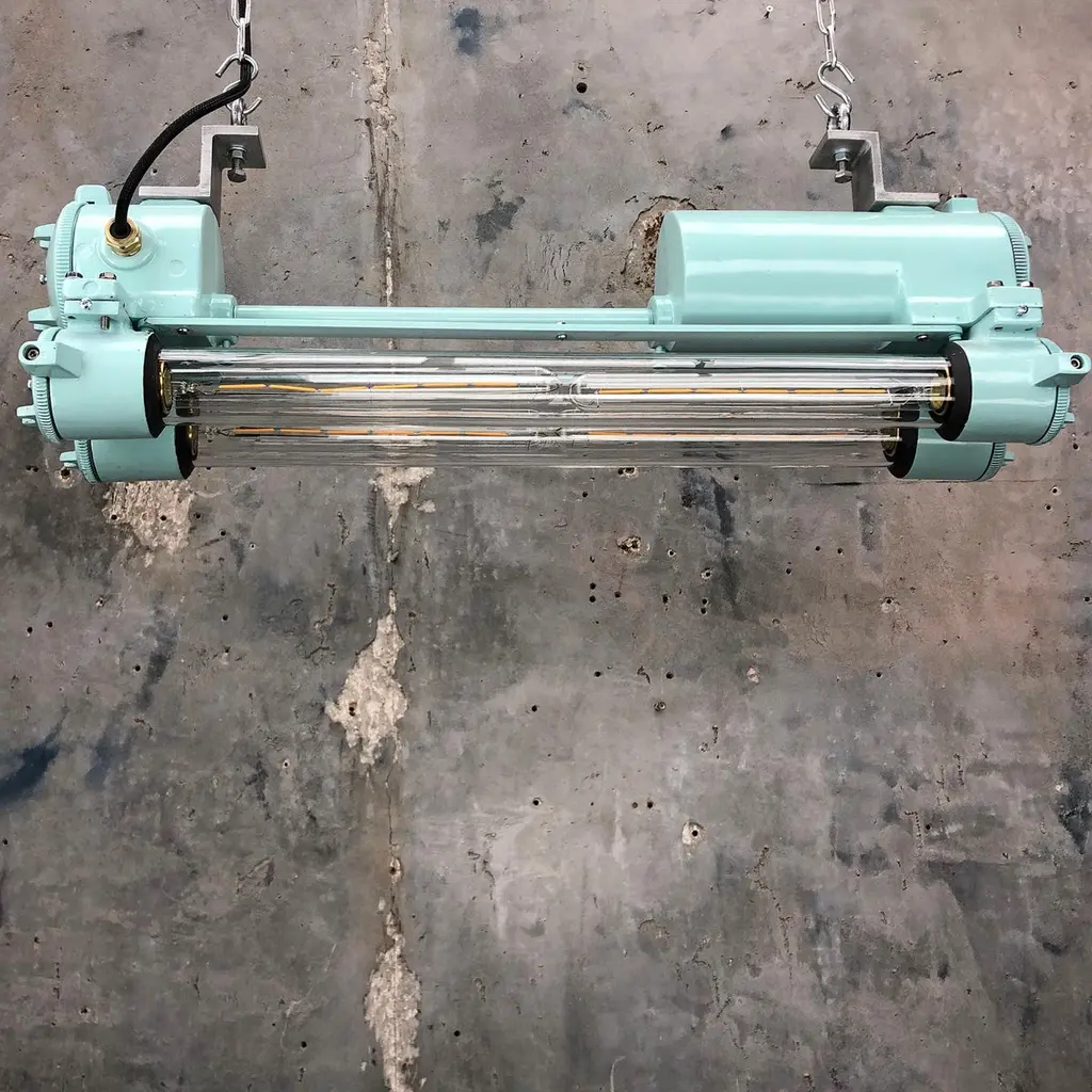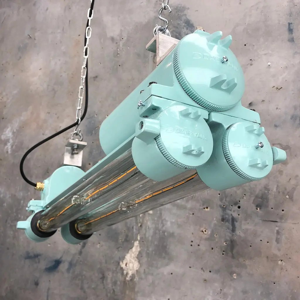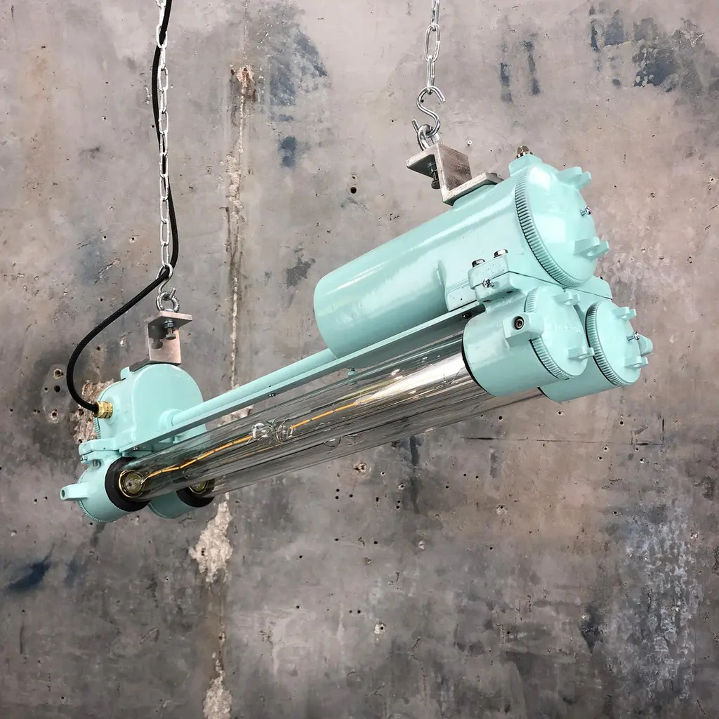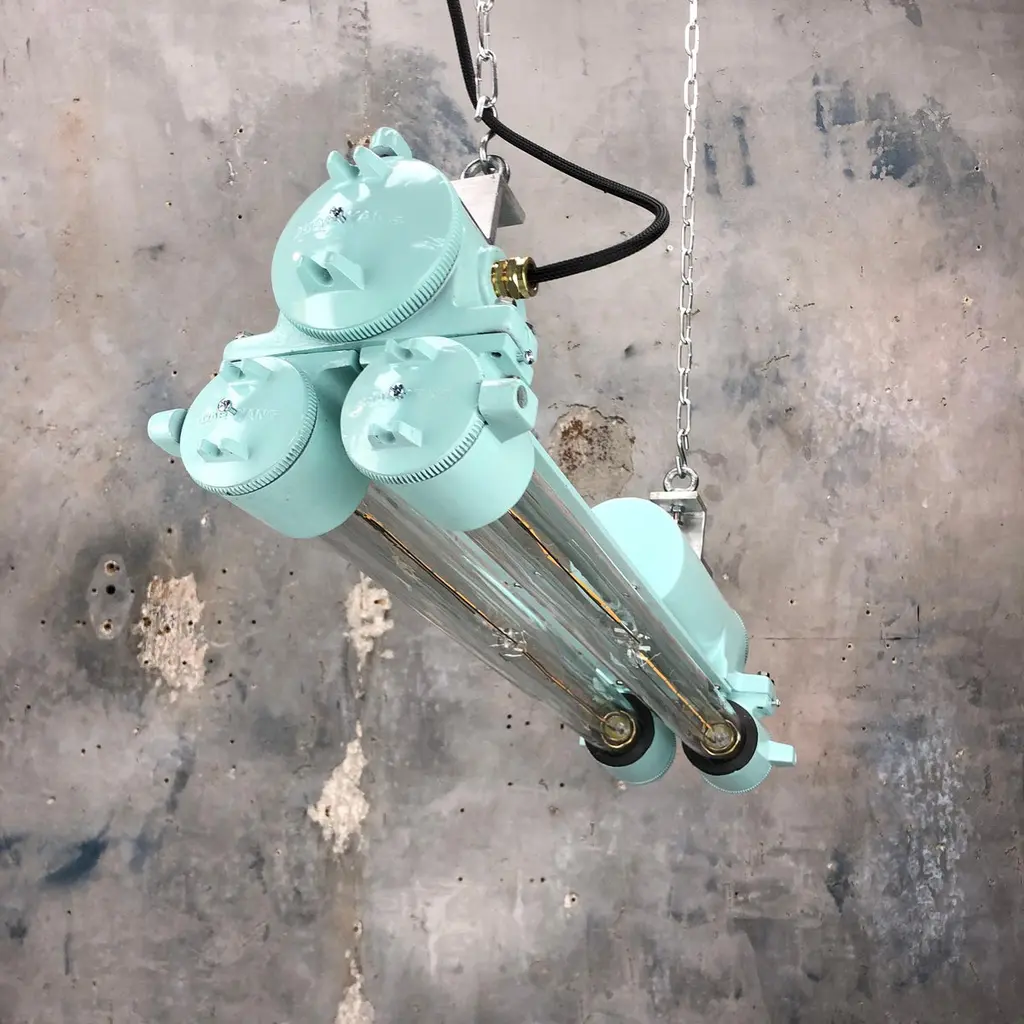 Reclaimed vintage Industrial Korean flameproof striplight made by Daeyang in the 1970's painted in duck egg. Original item salvaged from supertankers and military vessels then professionally restored by Loomlight in the UK ready for installation into modern interiors. Specifications:Height 30cmWidth 30cmLength 70cmWeight 10kgBulb: 4x Edison 300mm E27 tungsten filament. Compatible with 110v USA voltage (LED lamps available on request) The main body is cast aluminum with steel and brass fittings, the tubes are formed from glass and are also flameproof. All lights are professionally re-wired by our in-house team to exceed British Standards using CE approved components. Dimensions and weights are approximate. For all orders to USA, UL listed bulb holders and 100v bulbs will be fitted. All lights are sold ready for use in your home or commercial installation. For any specific requirements please get in touch. We are happy to discuss your individual project.