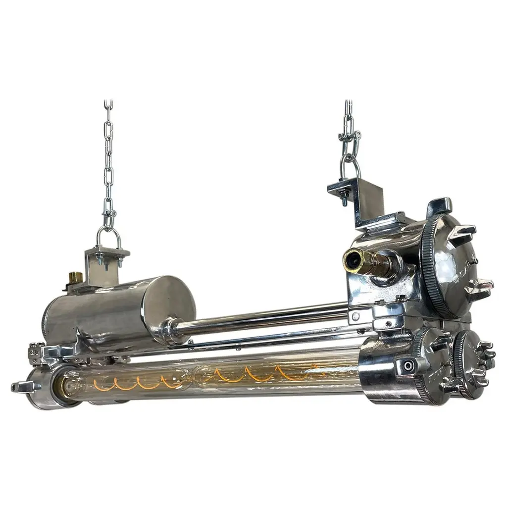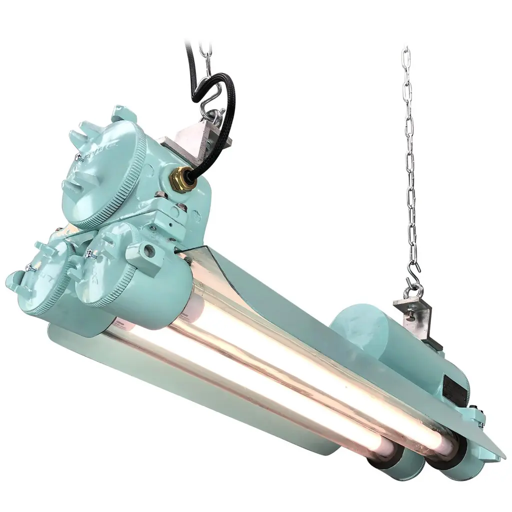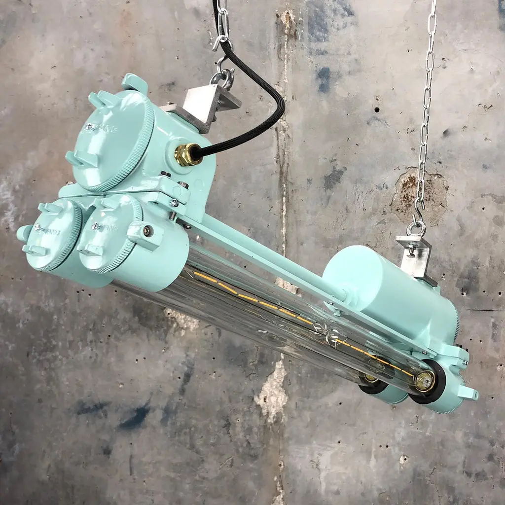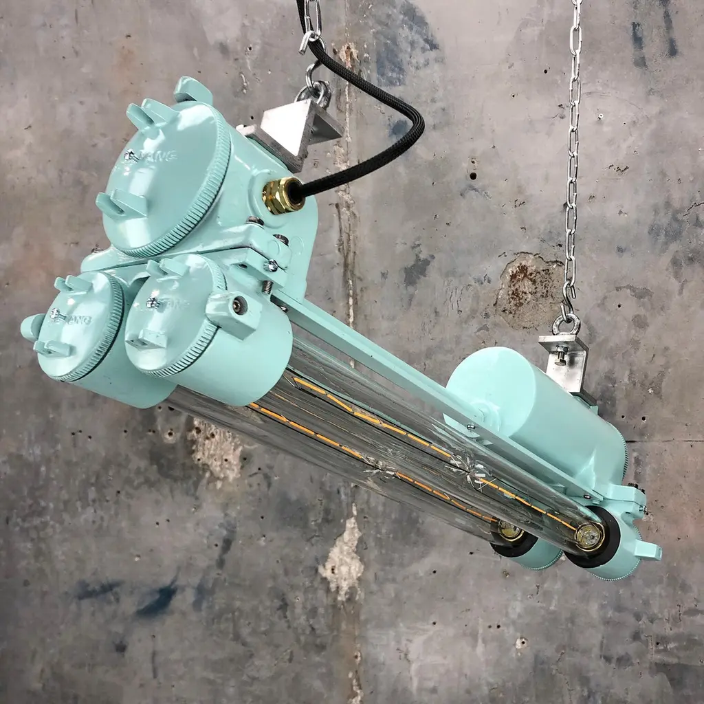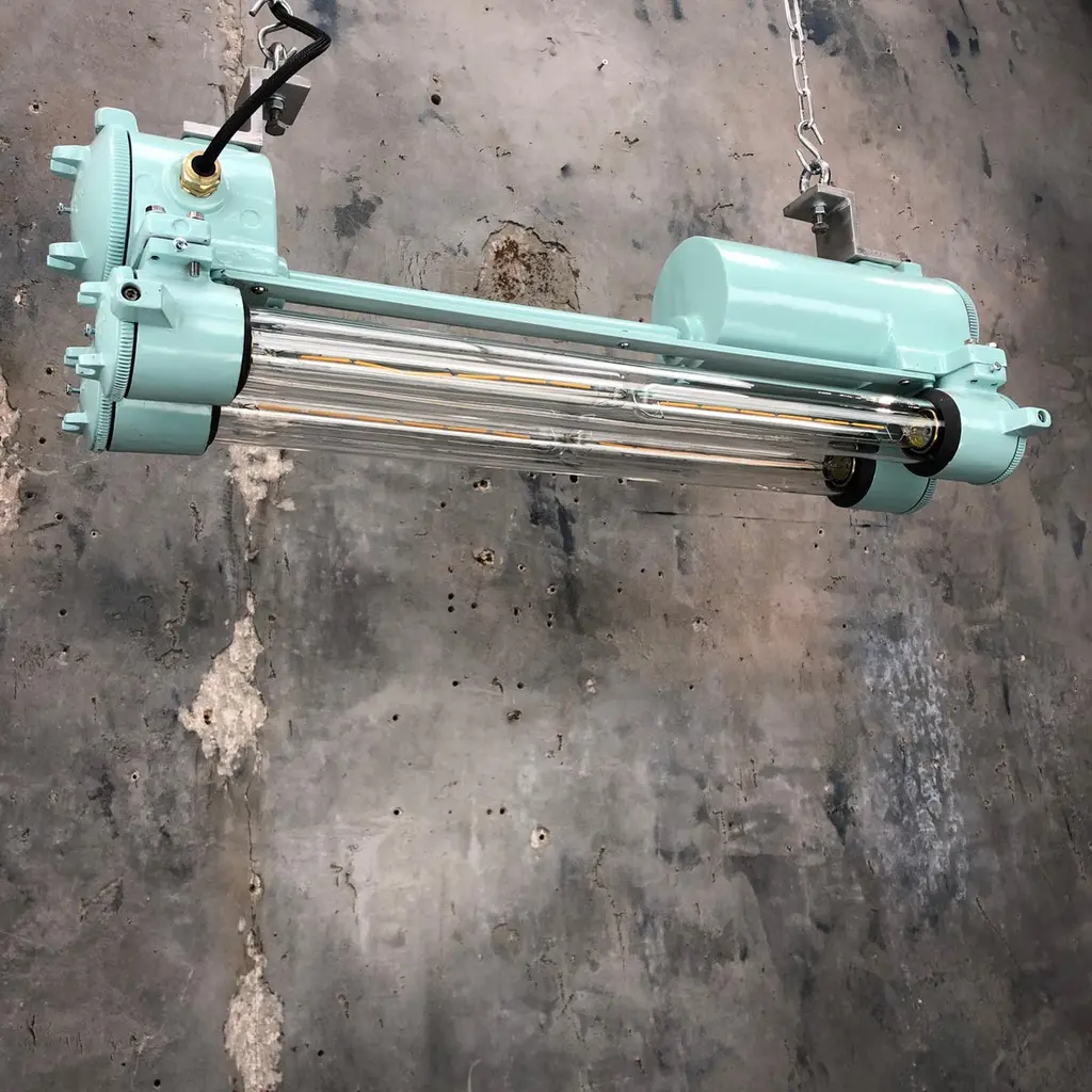 Reclaimed vintage Industrial Korean flameproof striplight made by Daeyang in the 1970's painted in duck egg. Original item salvaged from supertankers and military vessels then professionally restored by Loomlight in the UK ready for installation into modern interiors. Specifications:Height 30cmWidth 30cmLength 70cmWeight 10kgBulb: 4x Edison 300mm E27 tungsten filament. Compatible with 110v USA voltage (LED lamps available on request) The main body is cast aluminum with steel and brass fittings, the tubes are formed from glass and are also flameproof. All lights are professionally re-wired by our in-house team to exceed British Standards using CE approved components. Dimensions and weights are approximate. For all orders to USA, UL listed bulb holders and 100v bulbs will be fitted. All lights are sold ready for use in your home or commercial installation. For any specific requirements please get in touch. We are happy to discuss your individual project.