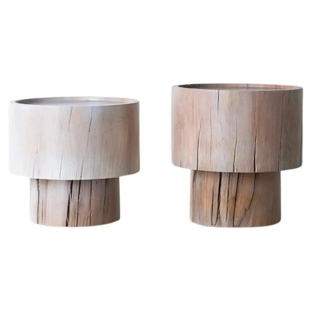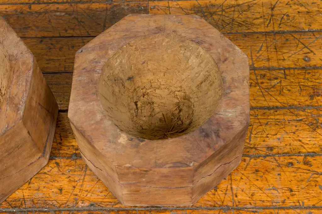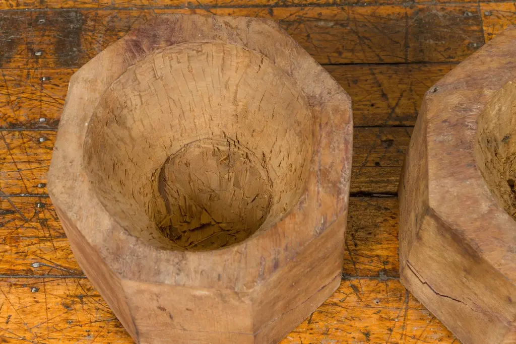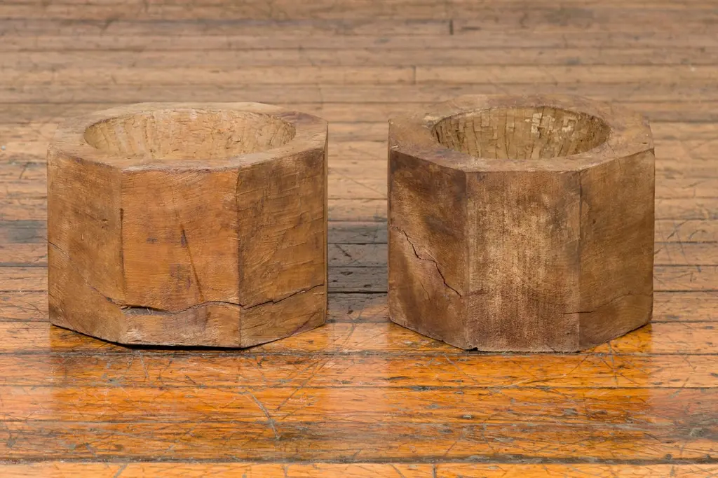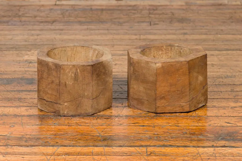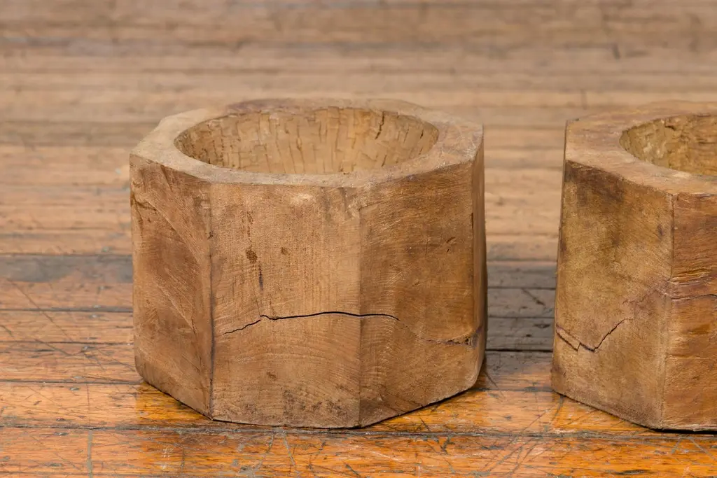 This pair of antique rustic octagonal wooden planters, priced and sold individually at $350 each, captivates with their authentic charm and simple yet striking design. Carved from tree trunks, these planters showcase a unique octagonal shape, reflecting the natural beauty and imperfections of the wood. The exterior, weathered by time, exudes a rustic appeal that speaks to the craftsmanship and natural materials used in their creation.Each planter has been meticulously hollowed out to create a functional interior space, perfect for showcasing plants or decorative arrangements. The wood's rich, earthy tones and the subtle texture of the tree bark enhance the organic feel of these pieces, making them ideal for adding a touch of nature to any setting. Whether placed indoors or outdoors, these planters offer a versatile design that can complement a wide range of styles, from rustic and bohemian to minimalist and contemporary.Their octagonal form adds a geometric interest that contrasts beautifully with the natural wood grain, making each piece a unique statement in its own right. Perfect for a garden, patio, or interior space, these planters can be used to house plants, flowers, or even as unique storage solutions. The timeless appeal and sturdy construction ensure that these antique rustic wooden planters will be cherished additions to any decor, offering both functionality and aesthetic appeal. With two available, they provide an excellent opportunity to create a cohesive look in pairs or to use individually as eye-catching focal points.