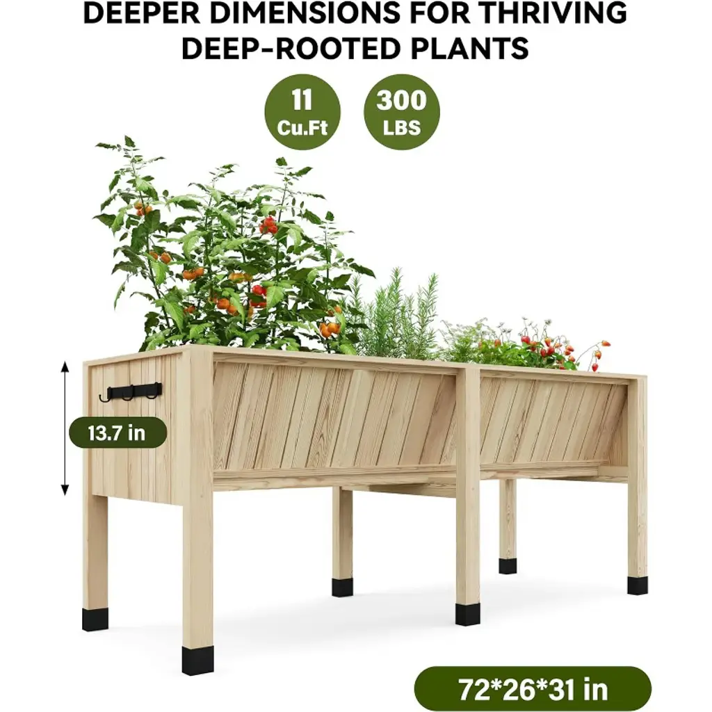 This cedar wood planter measures 45.9×26×31in with 35cm (13.7in) planting depth and 136kg (300lbs) capacity. Constructed with reinforced crossbars and thicker boards for outdoor durability. Includes practical hooks for tool storage and complimentary weed barrier fabric. The ergonomic height reduces back strain, suitable for growing vegetables, herbs and flowers. Two-person assembly within 30 minutes using basic tools.