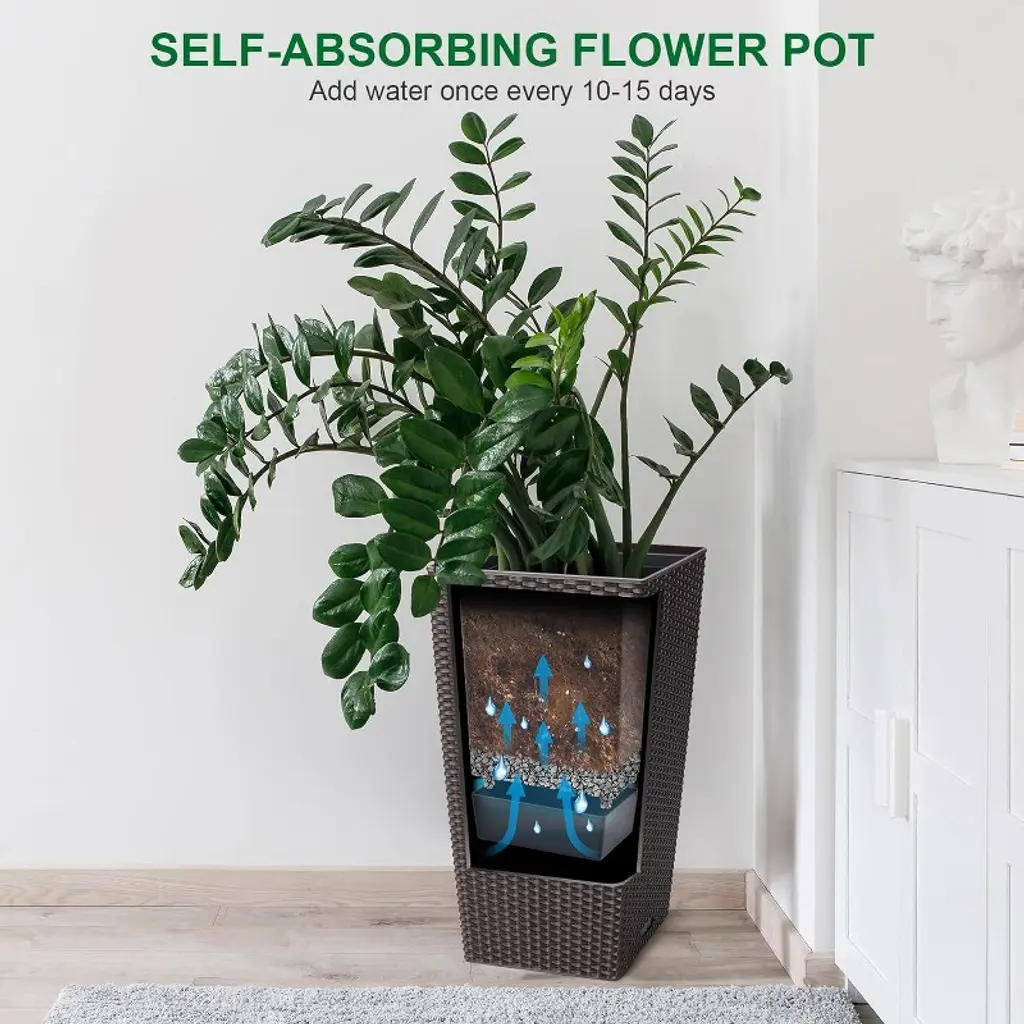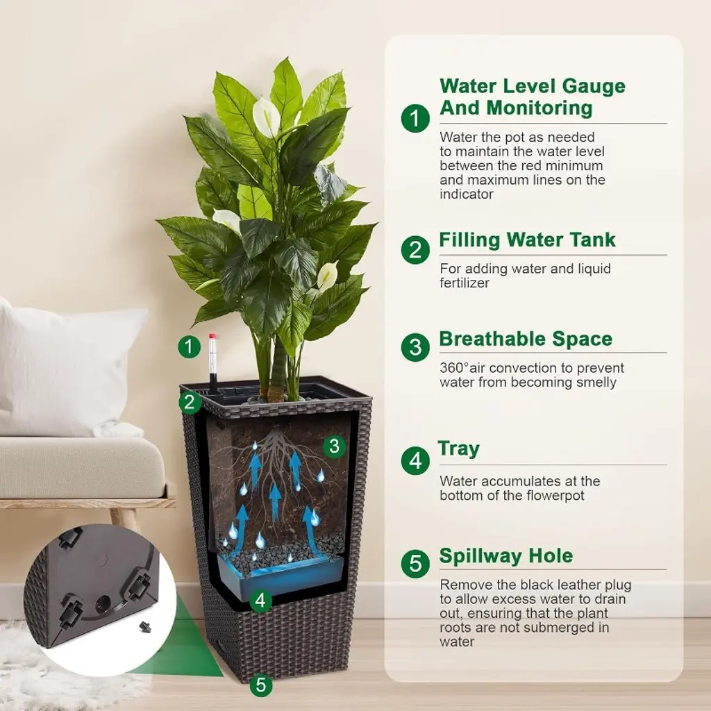 These elegant rattan-inspired planters combine style and functionality for both indoor and outdoor use. Featuring a clear water level monitor, you can easily track moisture levels and save up to two weeks of watering time—just refill when needed for optimal plant hydration. The practical inner pot design eliminates the hassle of moving the planter for soil changes or transplanting, while four drainage holes and a leak-proof layer prevent waterlogging and root rot. Hidden wheels make it effortless to move these planters to sunlight or refresh your decor, whether on your patio, porch, or in your living room. Built to last, their UV-resistant, crack-proof construction withstands rain, frost, and harsh sunlight, maintaining their vibrant rattan texture year-round. Perfect for adding rustic beauty and rugged resilience to any space.