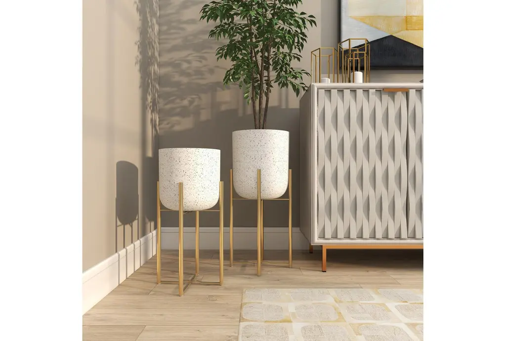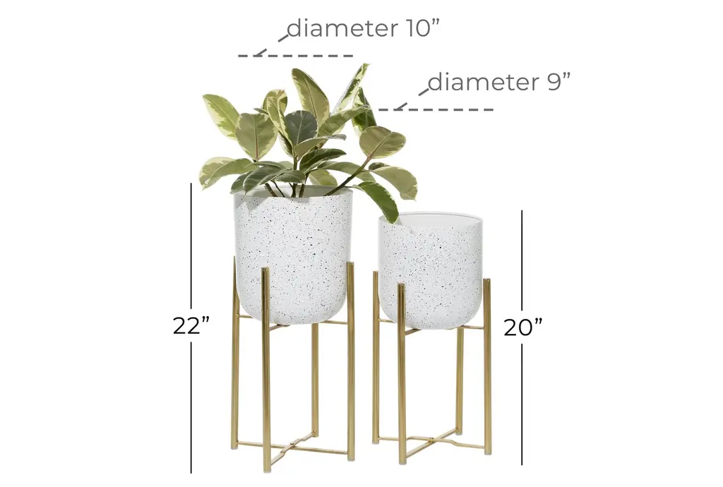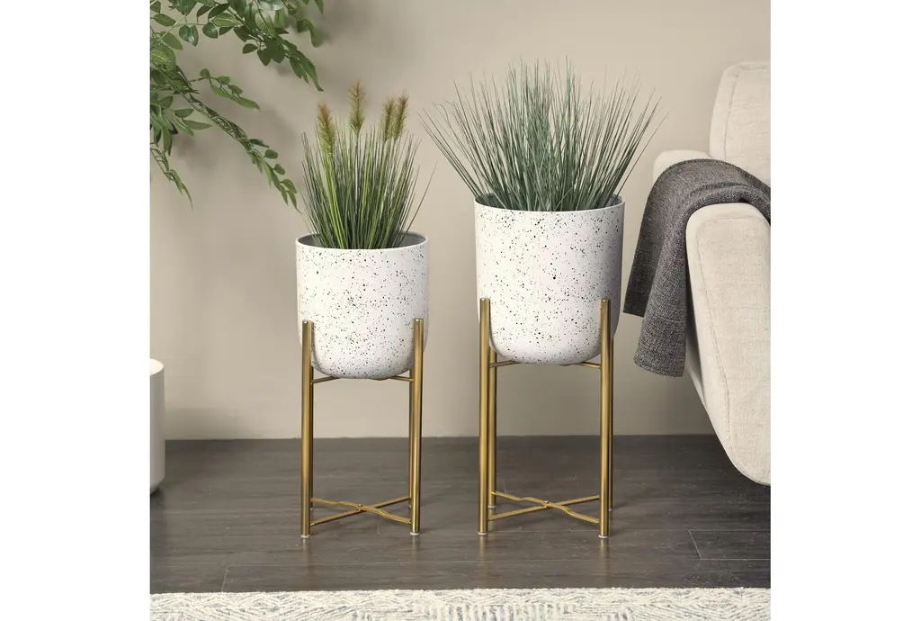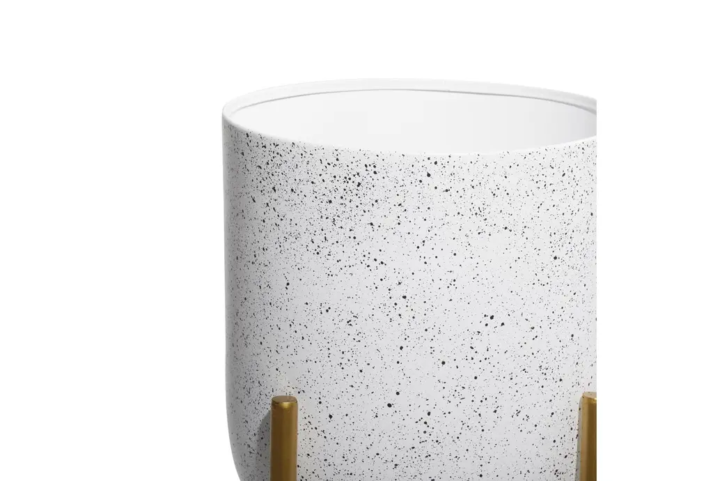 Enhance your indoor or outdoor space with this set of 2 white metal deep dome speckled planters. These contemporary planters come with removable stands, making them versatile and easy to place anywhere. The neutral white color and modern design will complement any decor style.