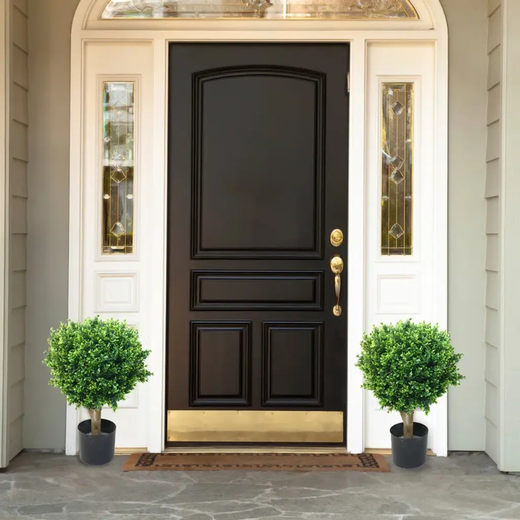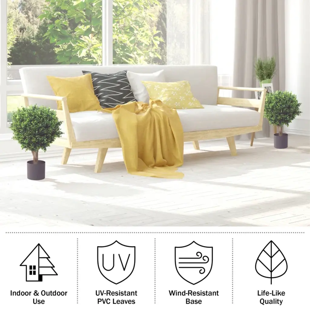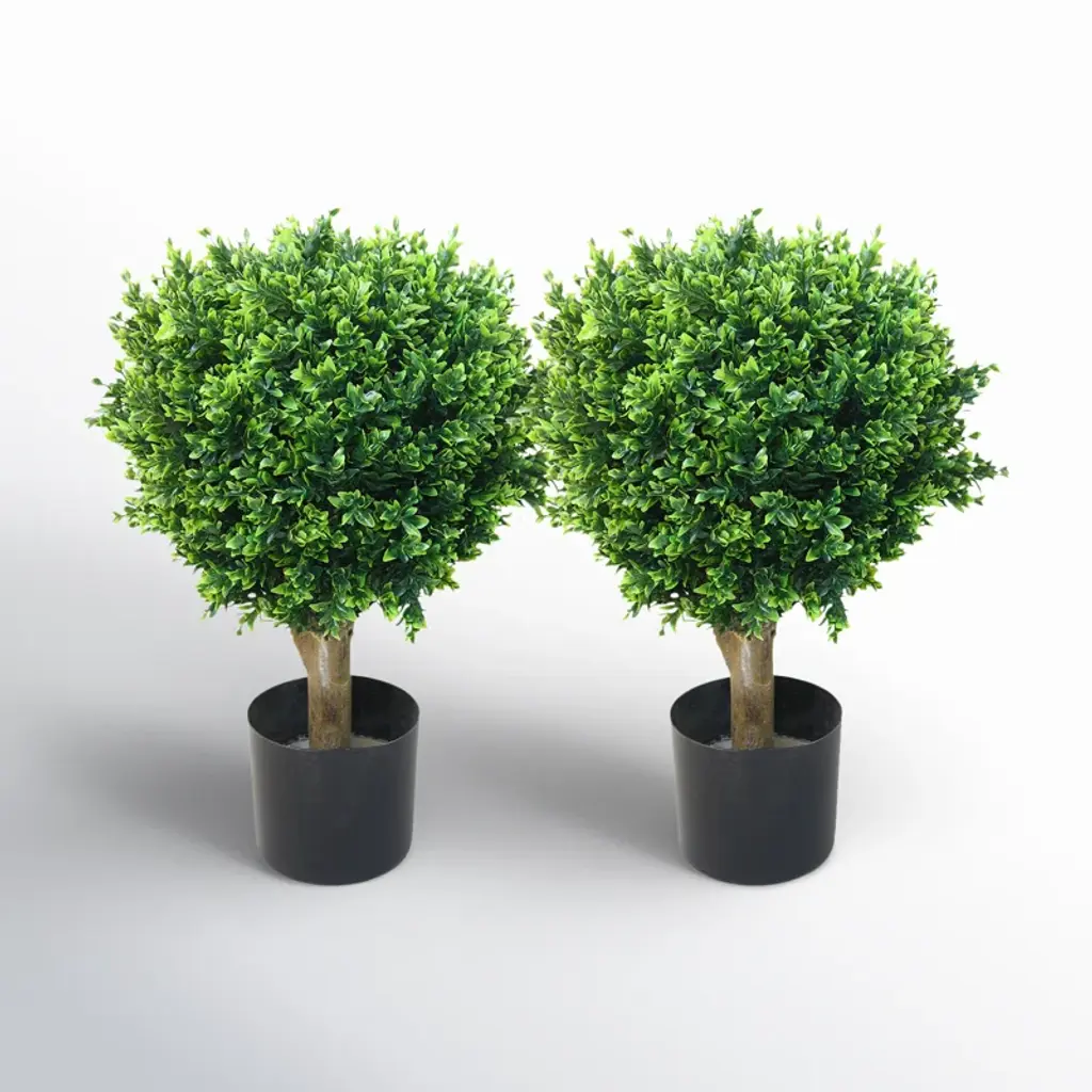 Bring a bit of greenery to your porch, patio, deck, or home decor with this Set of Two Hedyotis Artificial Topiary Trees by Romano. These low-maintenance plastic plants are great for busy folks who don't have time to care for delicate living shrubs and liven up any indoor or outdoor space with beautiful shrubbery that's easy to care for. An attractive addition to your front porch decor, the bottom of each faux plant is weighted to withstand wind in outdoor spaces while still being light enough to be carried with ease.