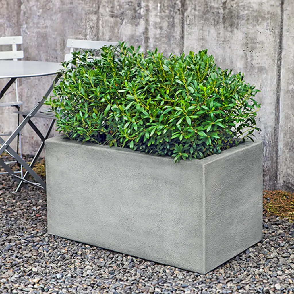 This planter looks as if it's made of stone or concrete, but it's much lighter in weight and easily as durable. It's crafted of glass fiber reinforced concrete (GFRC) that is resistant to extreme temperatures, rust, and fire. The planter has a hand-applied finish and a bottom drainage hole, and it does not require a plastic liner.