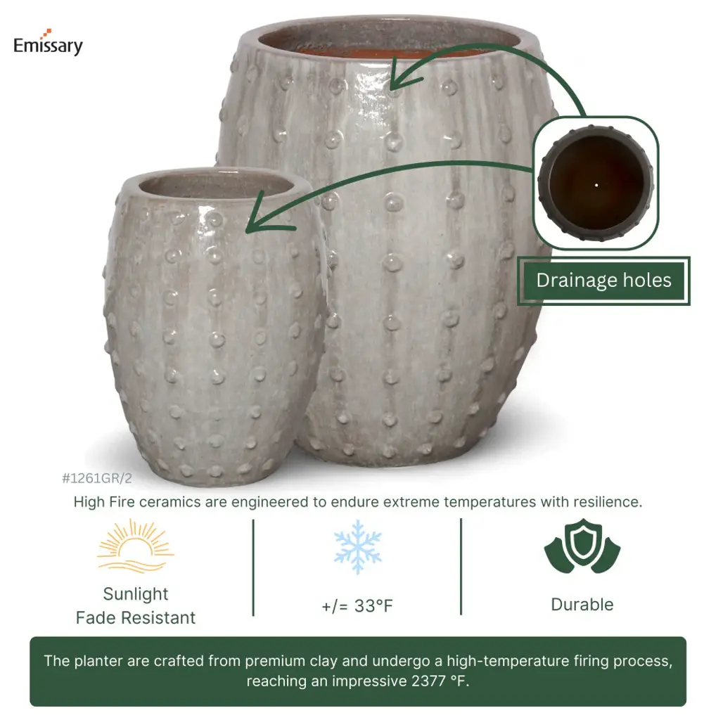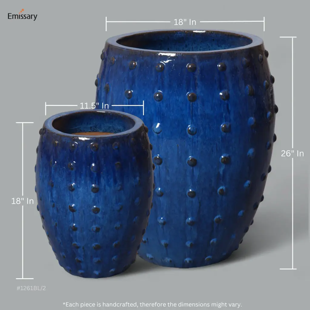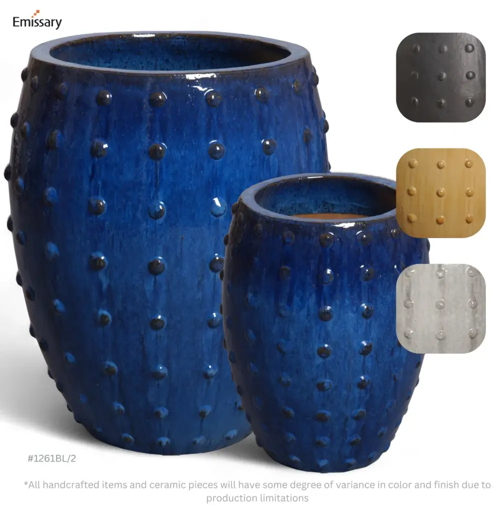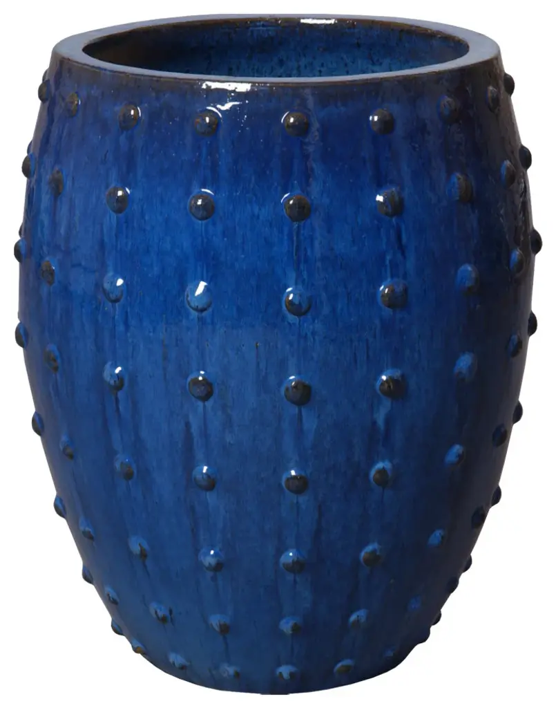 This Round Studded Planter is crafted of ceramic with a blue glaze. Suitable for outdoor and indoor use. Adds color and texture to your home or garden.- Weather-resistant for indoor/outdoor use, avoid extreme temperature and store indoors during long periods of freezing weather- Wipe with a damp cloth, avoid the use of chemicals and household cleaners as they may damage the finish- Please note: the digital images and product dimensions on our website are as accurate as possible. Due to differences in computer monitors and the glazing process, some colors/finish may vary slightly, we do our best to provide you with an exact measurement, but please be advised that some variation exists