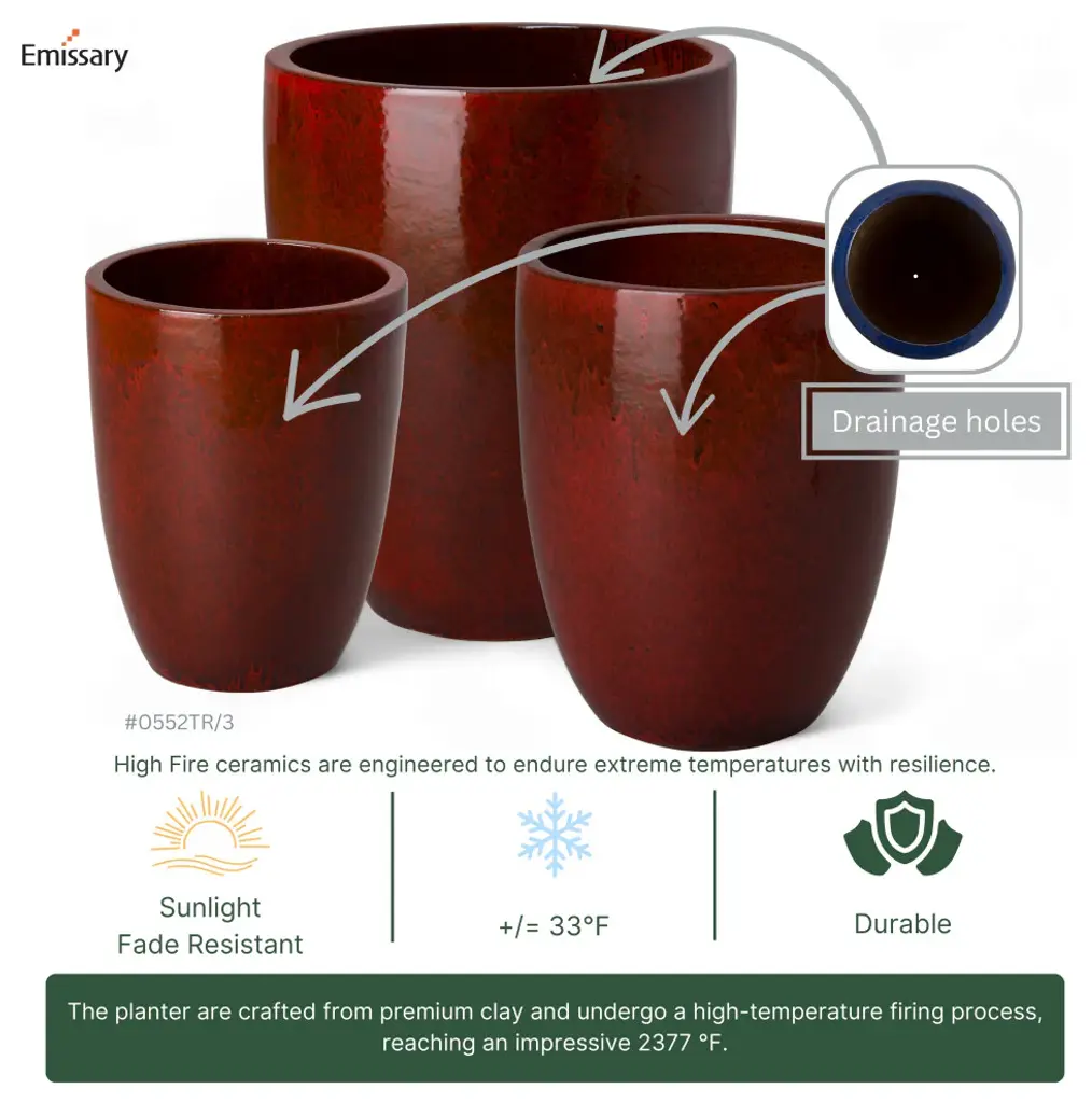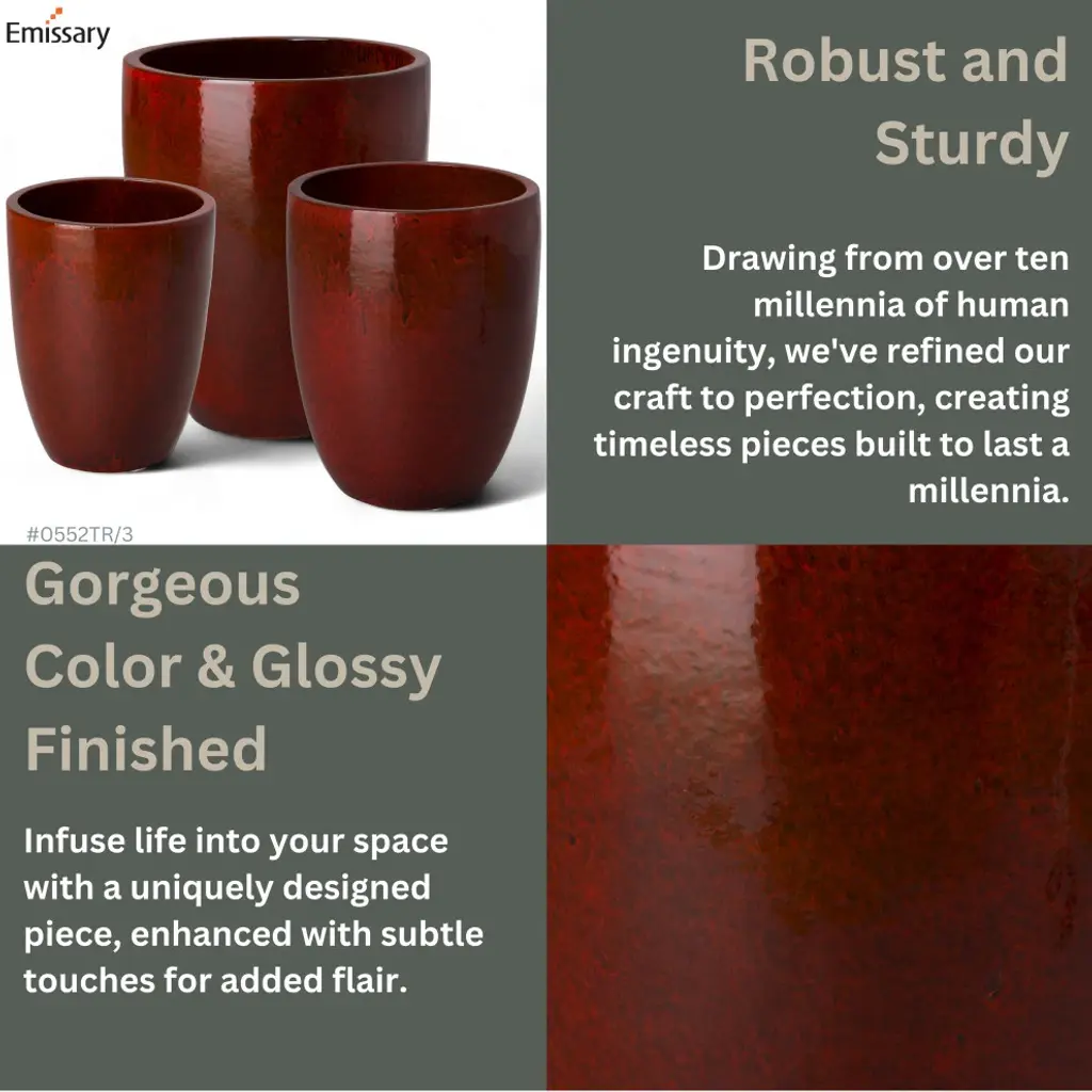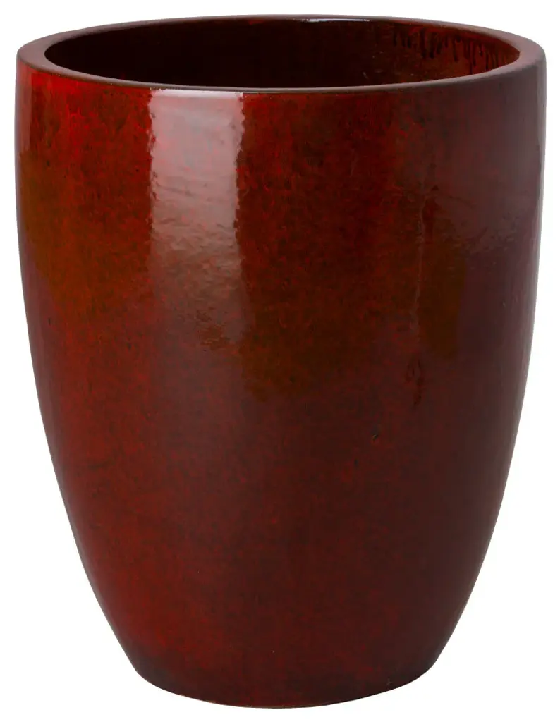 This Round Tall planter is crafted of ceramic with a Tropical Red glaze. Suitable for outdoor and indoor use. Adds color and texture to your home or garden.