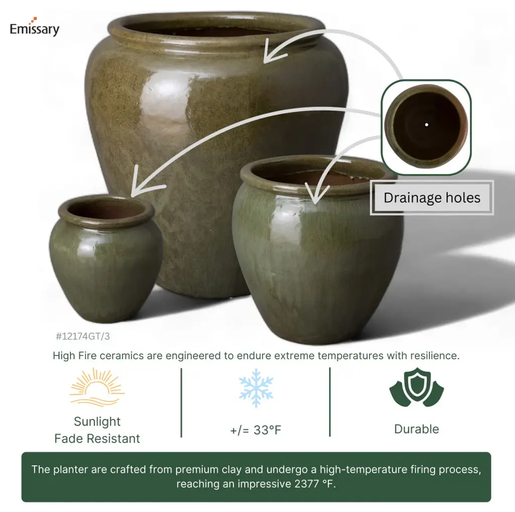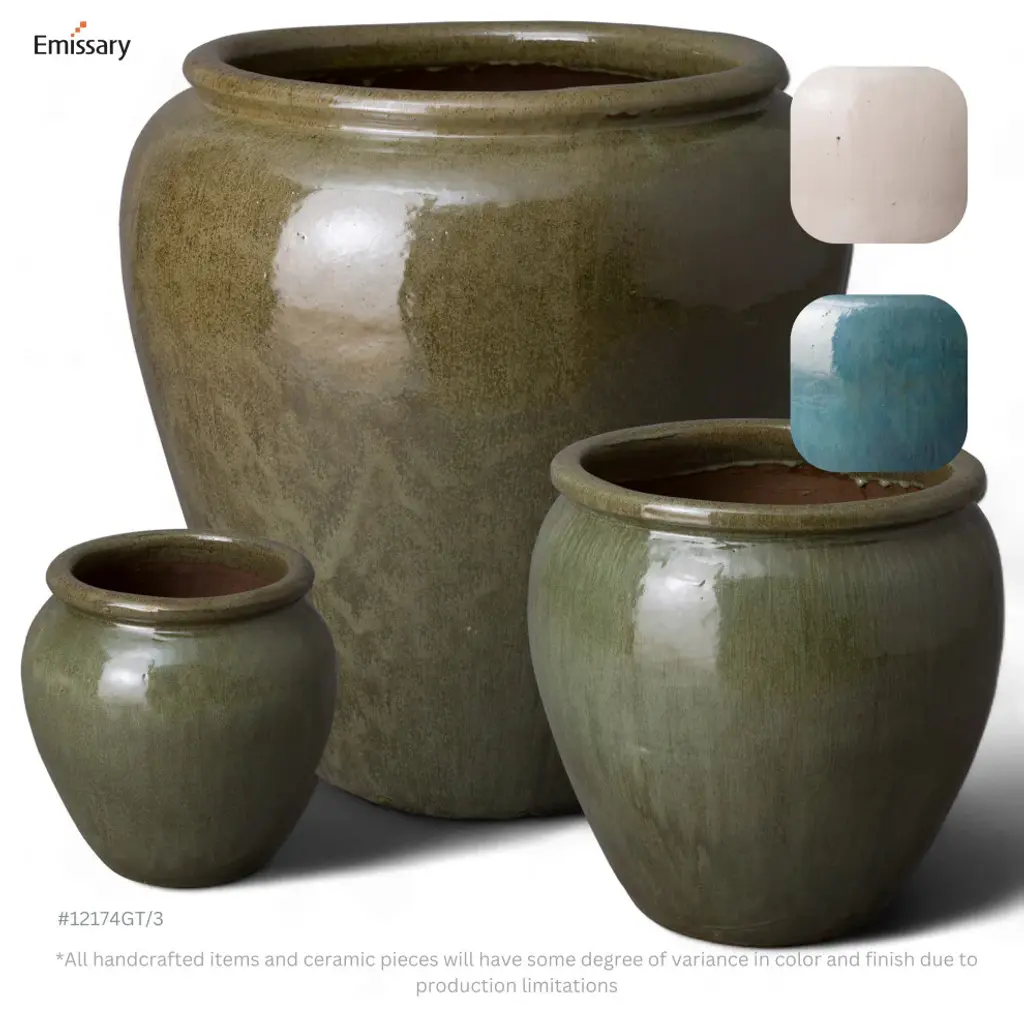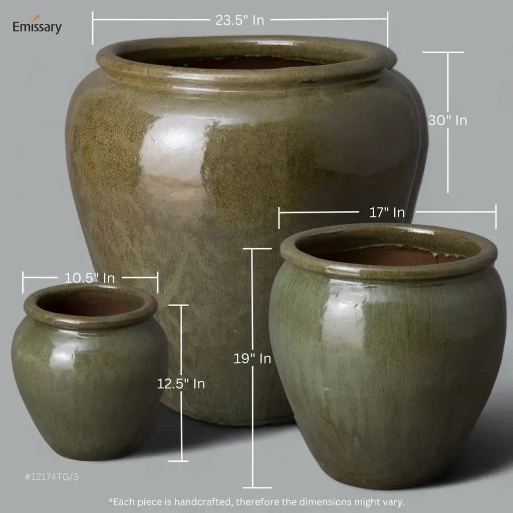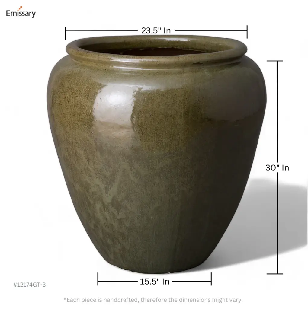 This ceramic round rimmed planter is handcrafted and finished with a tea green glaze. Made from heavy and durable red clay, this planter is suitable for both outdoor and indoor use. Elevate any living space with a touch of simple elegance and bold color.- Handcrafted- Finished in tea green glaze (glossy)- Dimensions: 30 in. L x 30 in. W x 30 in. H- Weather-resistant for indoor/outdoor use, avoid extreme temperature and store indoors during freezing weather- Wipe with a damp cloth, avoid the use of chemicals and household cleaners as they may damage the finish- Please note: the digital images and product dimensions on our website are as accurate as possible. Due to differences in computer monitors, some colors/finish may vary slightly. We do our best to provide you with an exact measurement, but please be advised that some variation exists