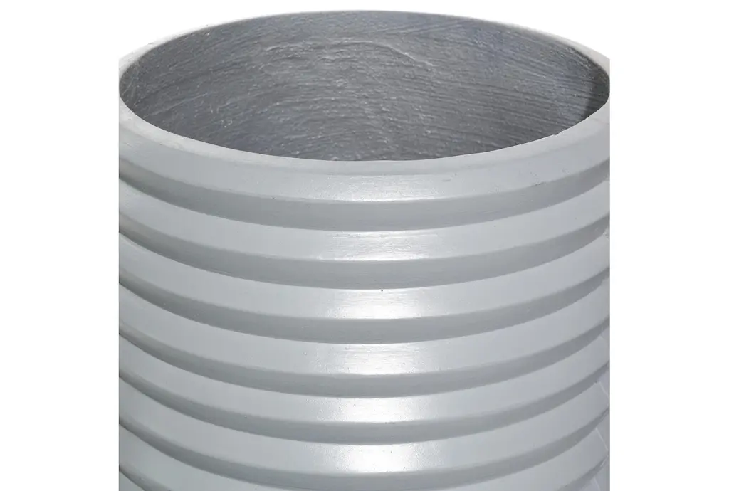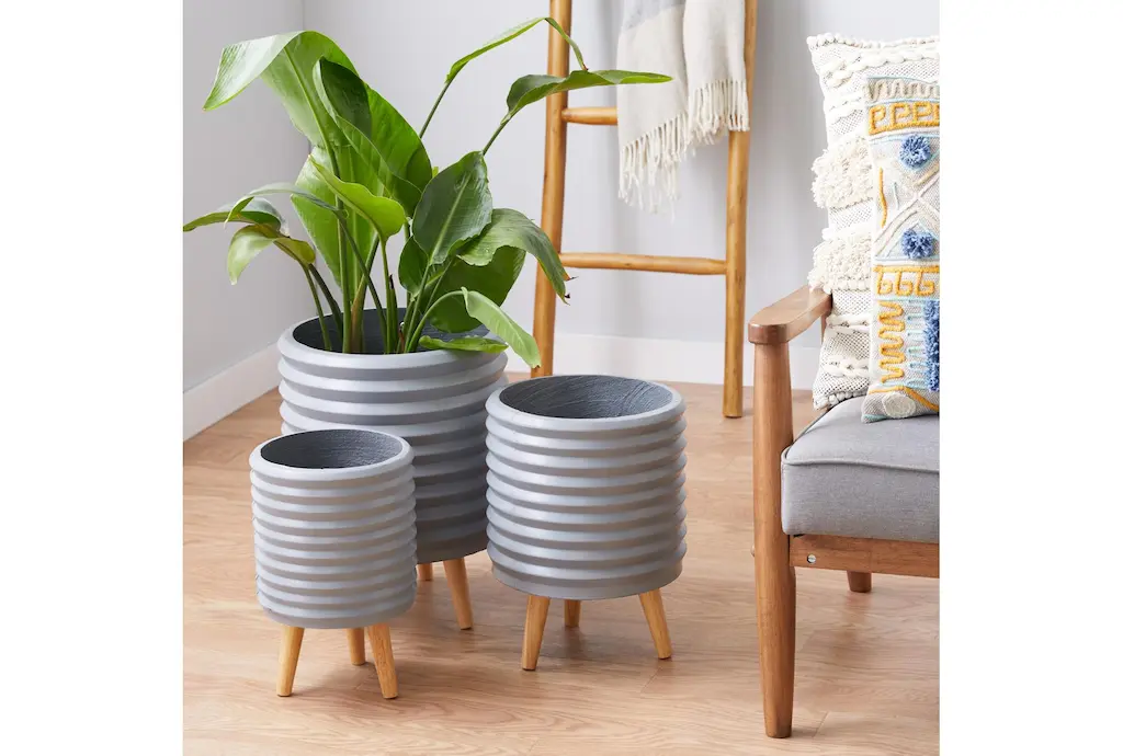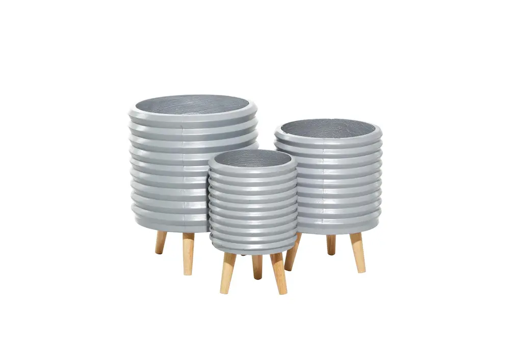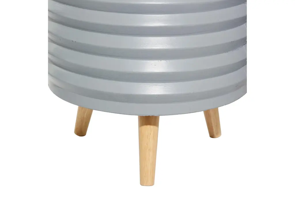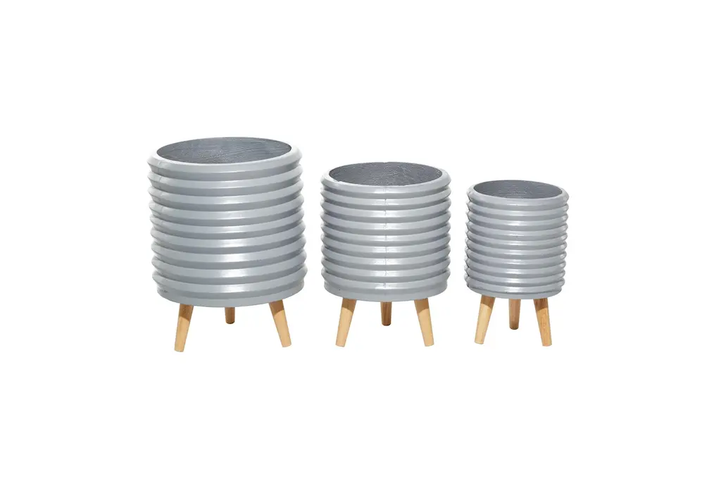 A smart chic style inspired living space knows how important mixing and matching is, especially when it comes to adding some greenery in your space. This round gray fiber clay horizontal grooves planter is up for that task. The fiber clay construction of this planter means toughness without sacrificing beauty and elegance thanks to its horizontal groove pattern design on the surface. The entire piece rests on a wooden tripod leg design with circular wooden legs in a light brown hue. This planter set will bring a much-needed freshness with indoor plants to your living room, dining room, home office or entry way. Ships in 1 carton. Suitable for indoor and outdoor use. No drainage holes. Each set includes with 3 planters. Contemporary design.