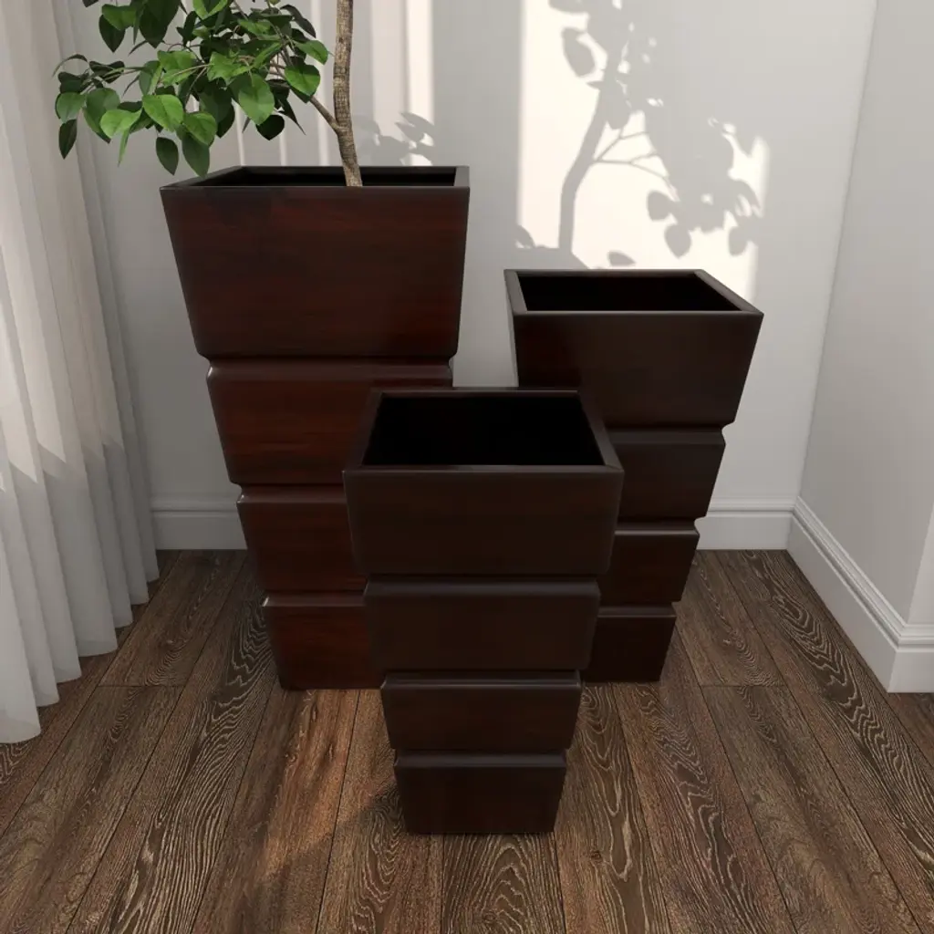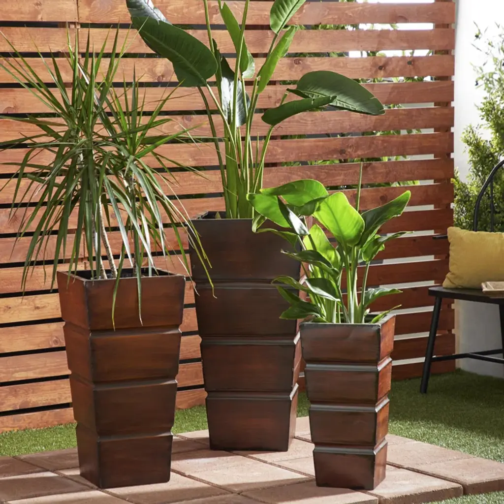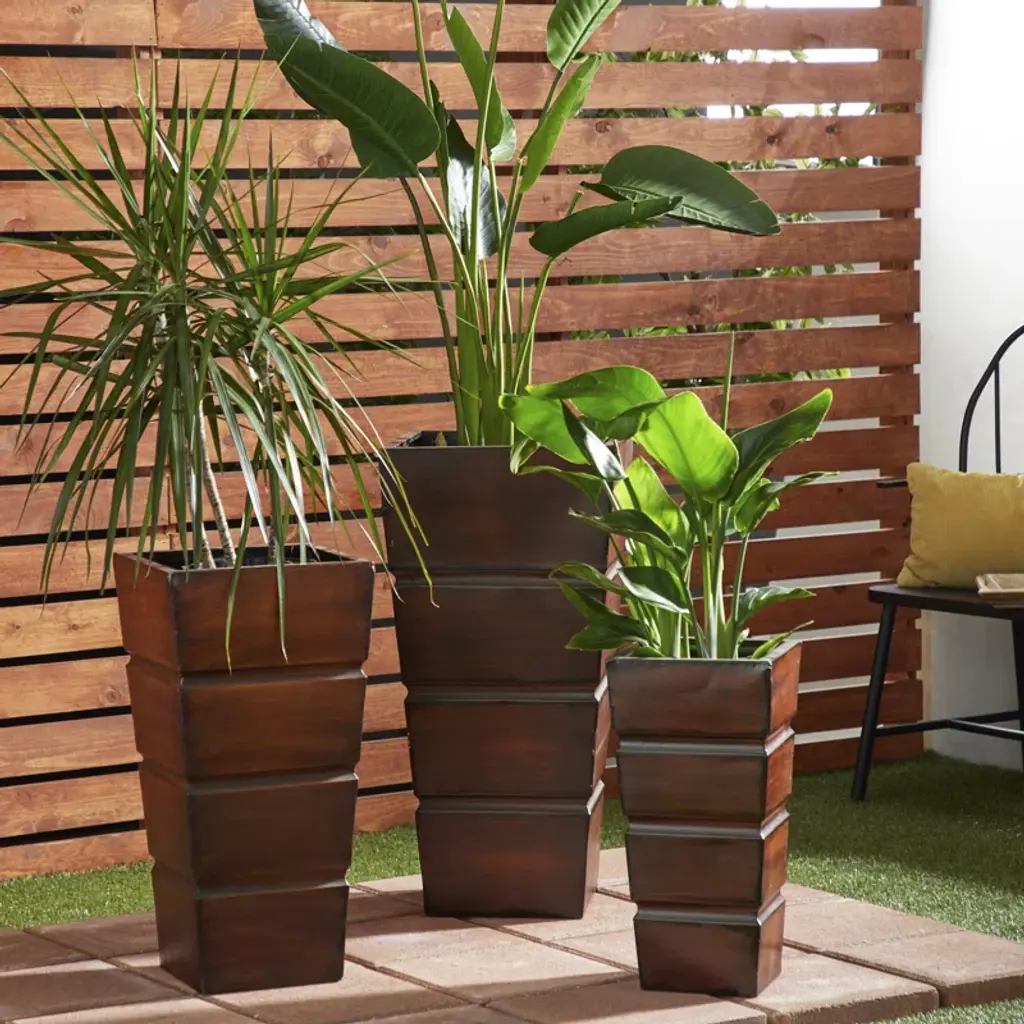 These floor planters were crafted with wide receptacles and deep settings that are meant to stylishly display herbs, shrubs, indoor plants, or cacti. This item ships in 1 carton. Please note that this item is for decorative purposes only and is not food safe. Suitable for indoor and outdoor use. The maximum weight limit is 20 lbs. Planters do not have drainage holes but they are not watertight. This planter comes in a set of 3. Rustic style.